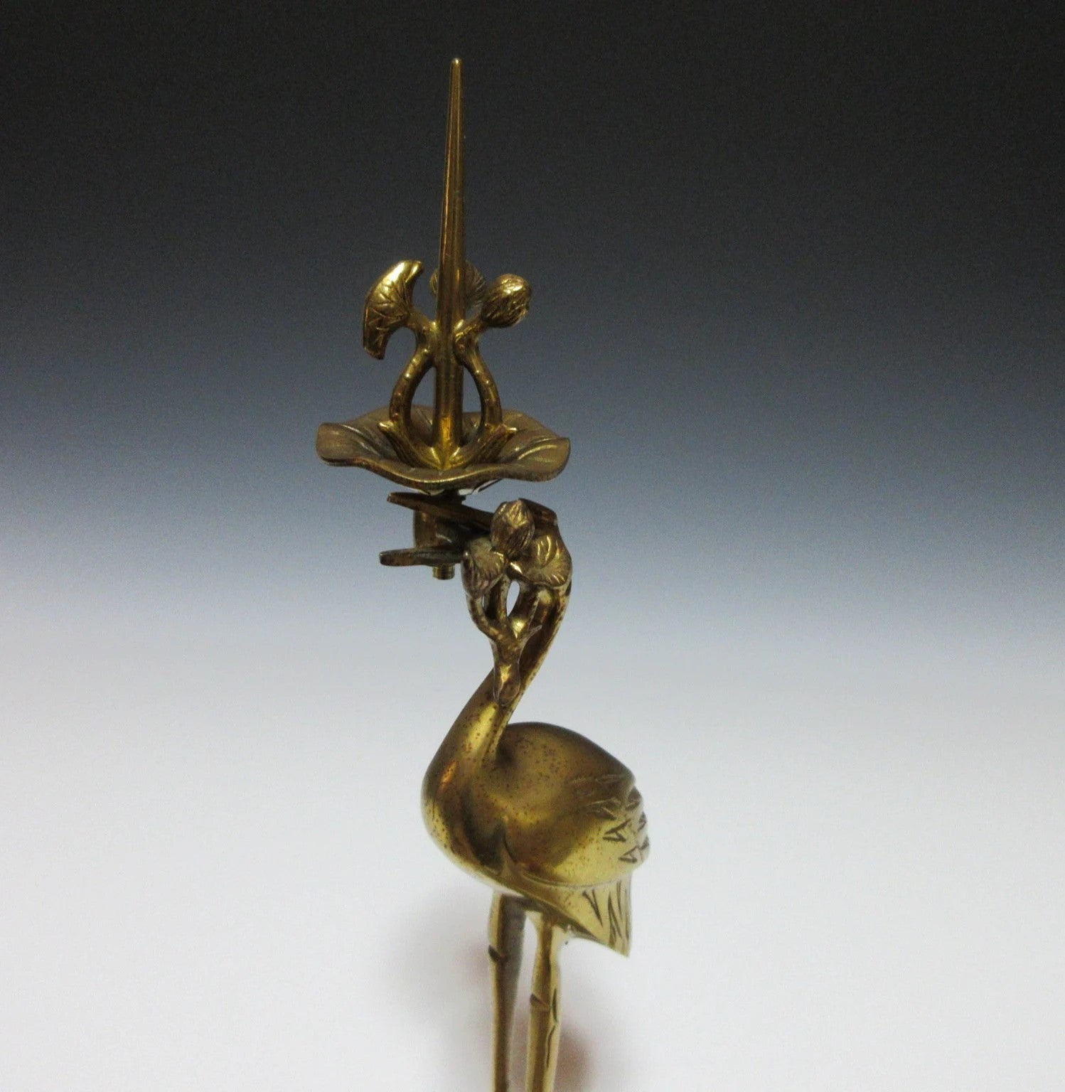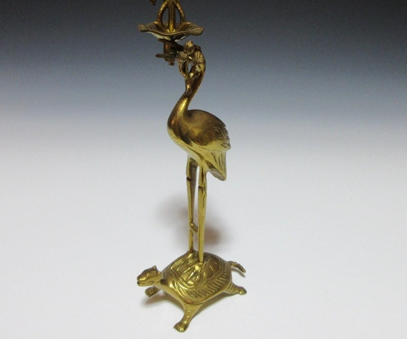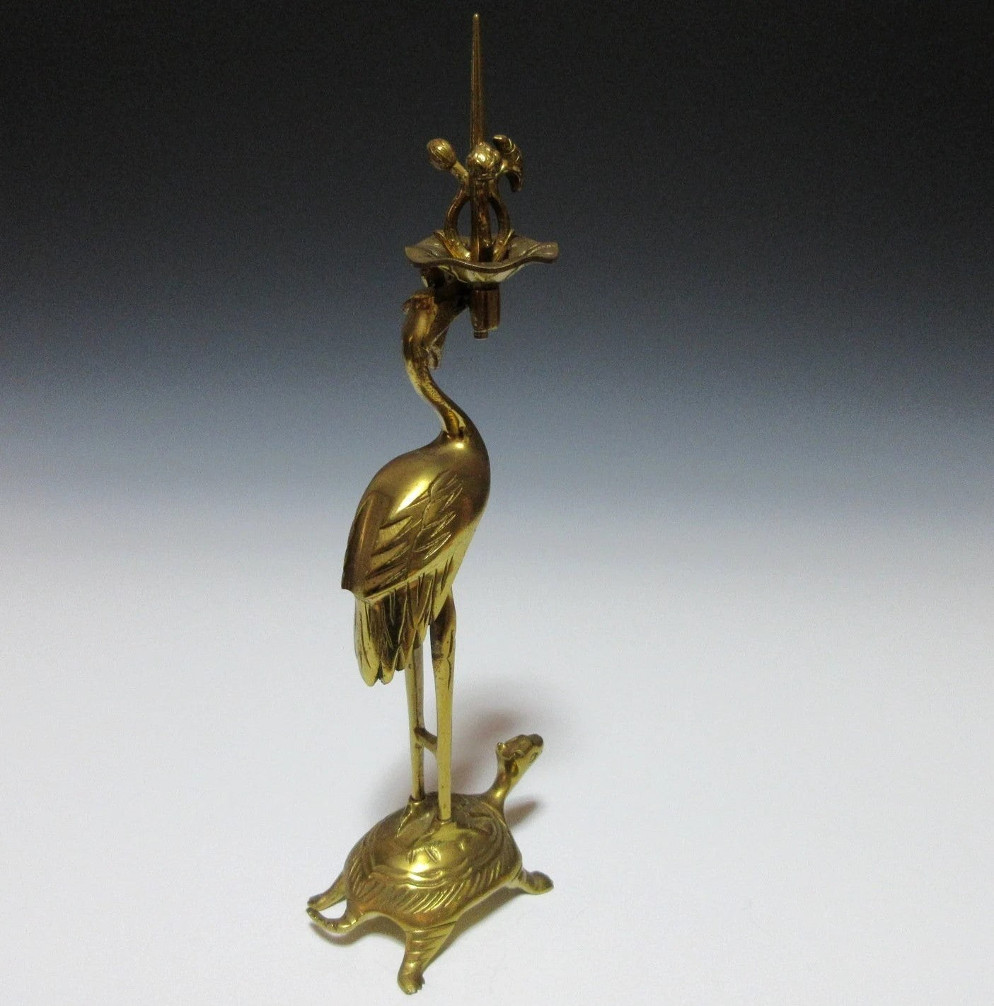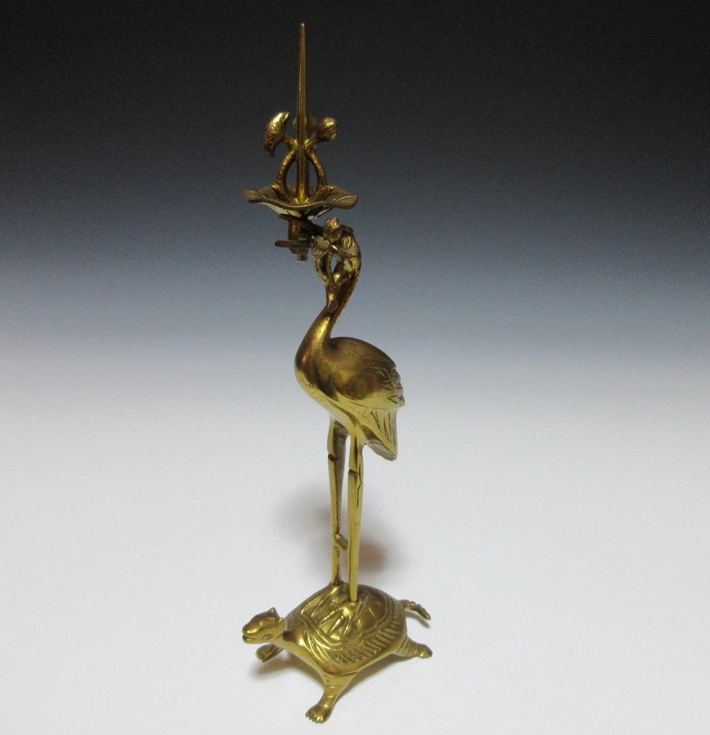 This listing is for a traditional Buddhist shokudai candle holder made about 30-40 years ago. It is made of brass and features a crane holding a lotus leaf standing on the back of a tortoise. This type of candle stand is usually placed at the Butsudan, which is the family altar found in people’s homes.