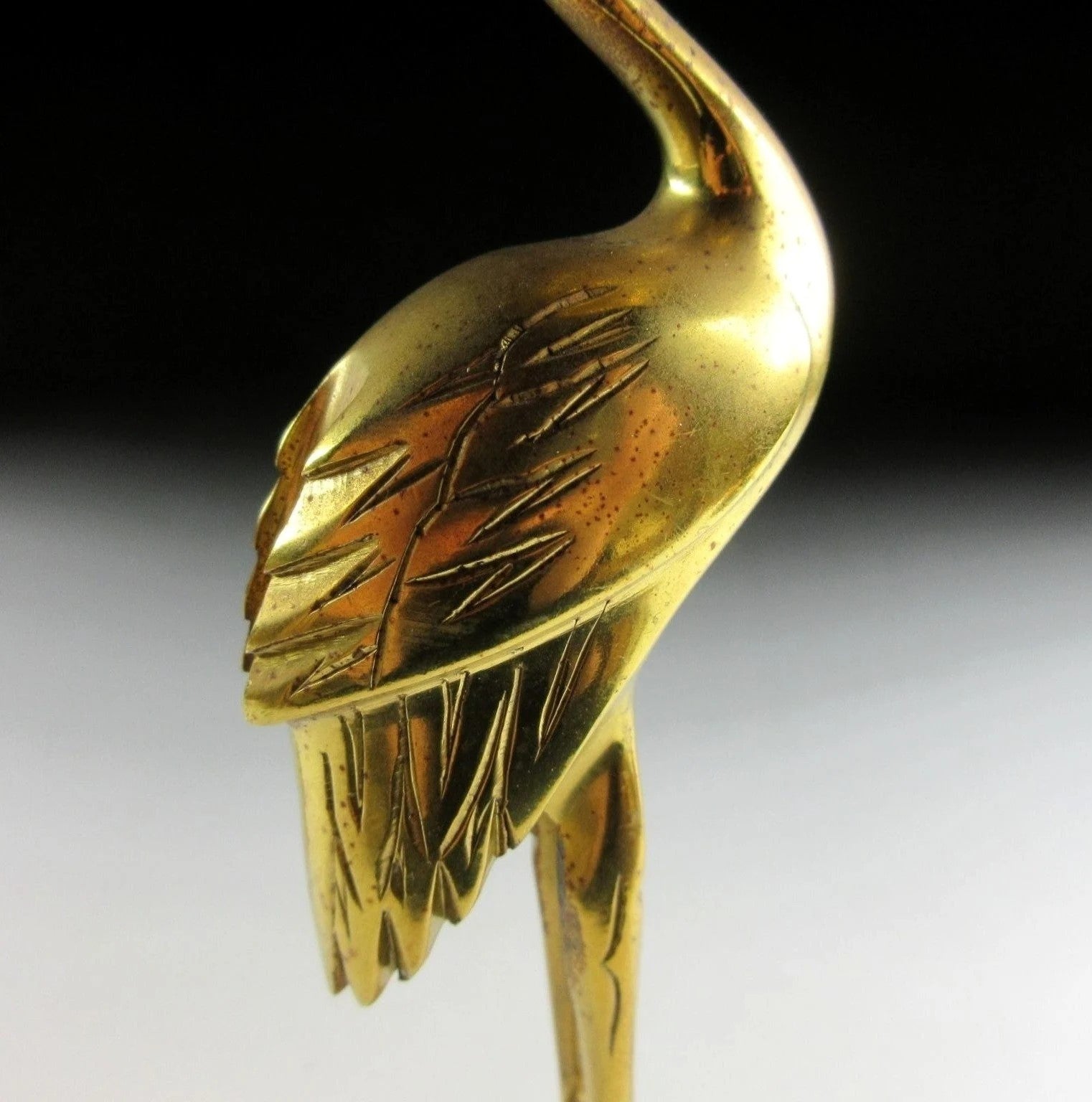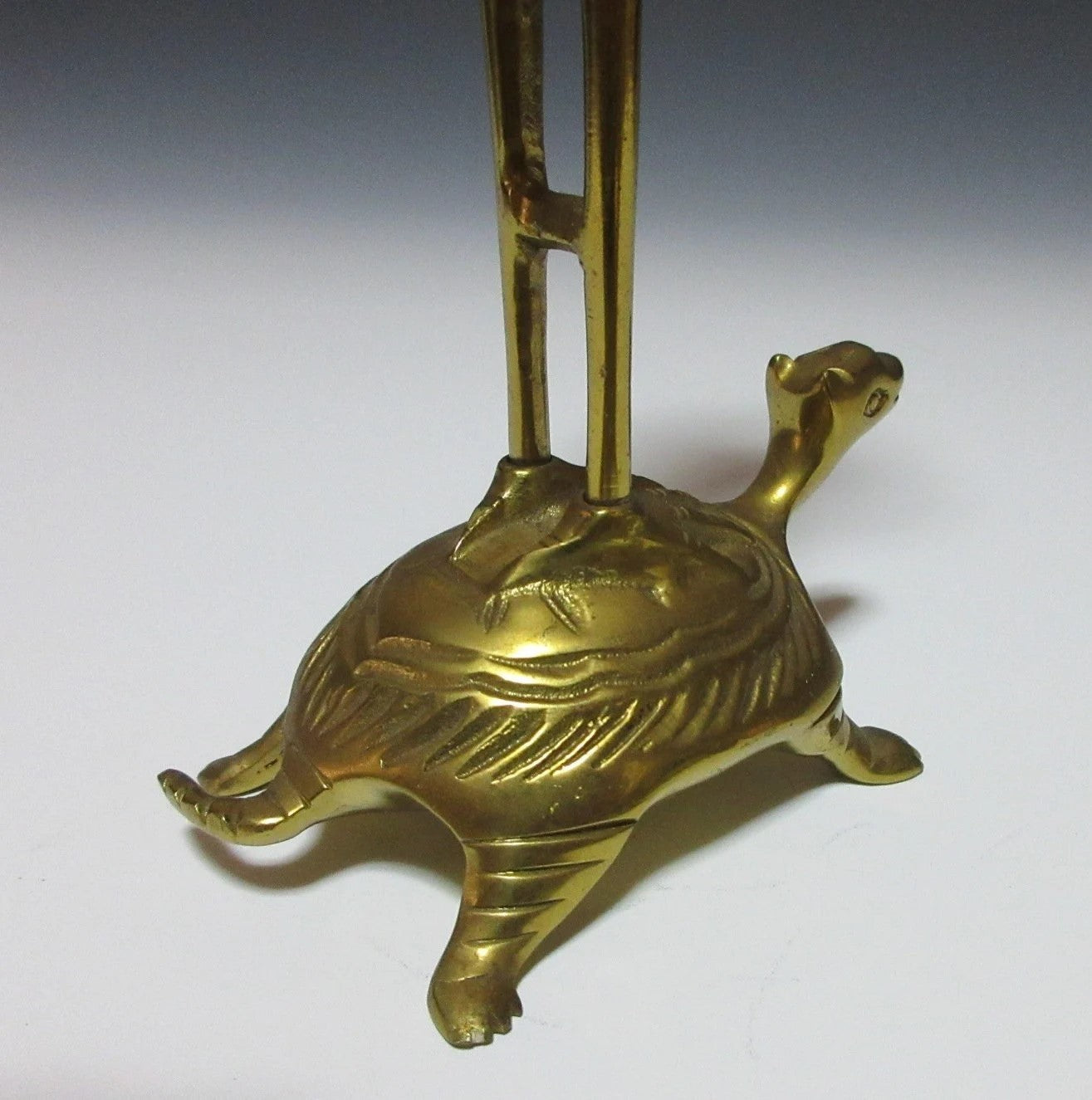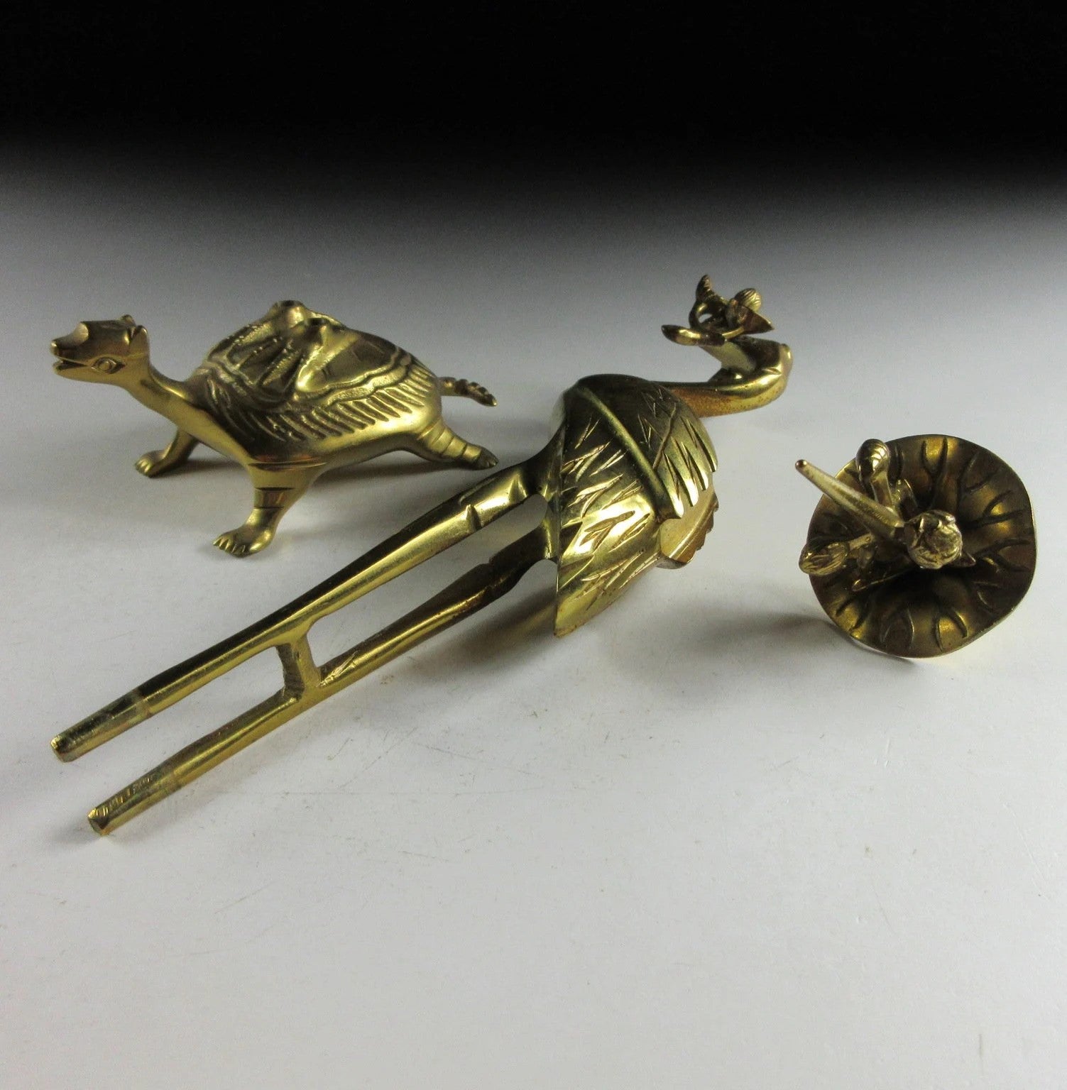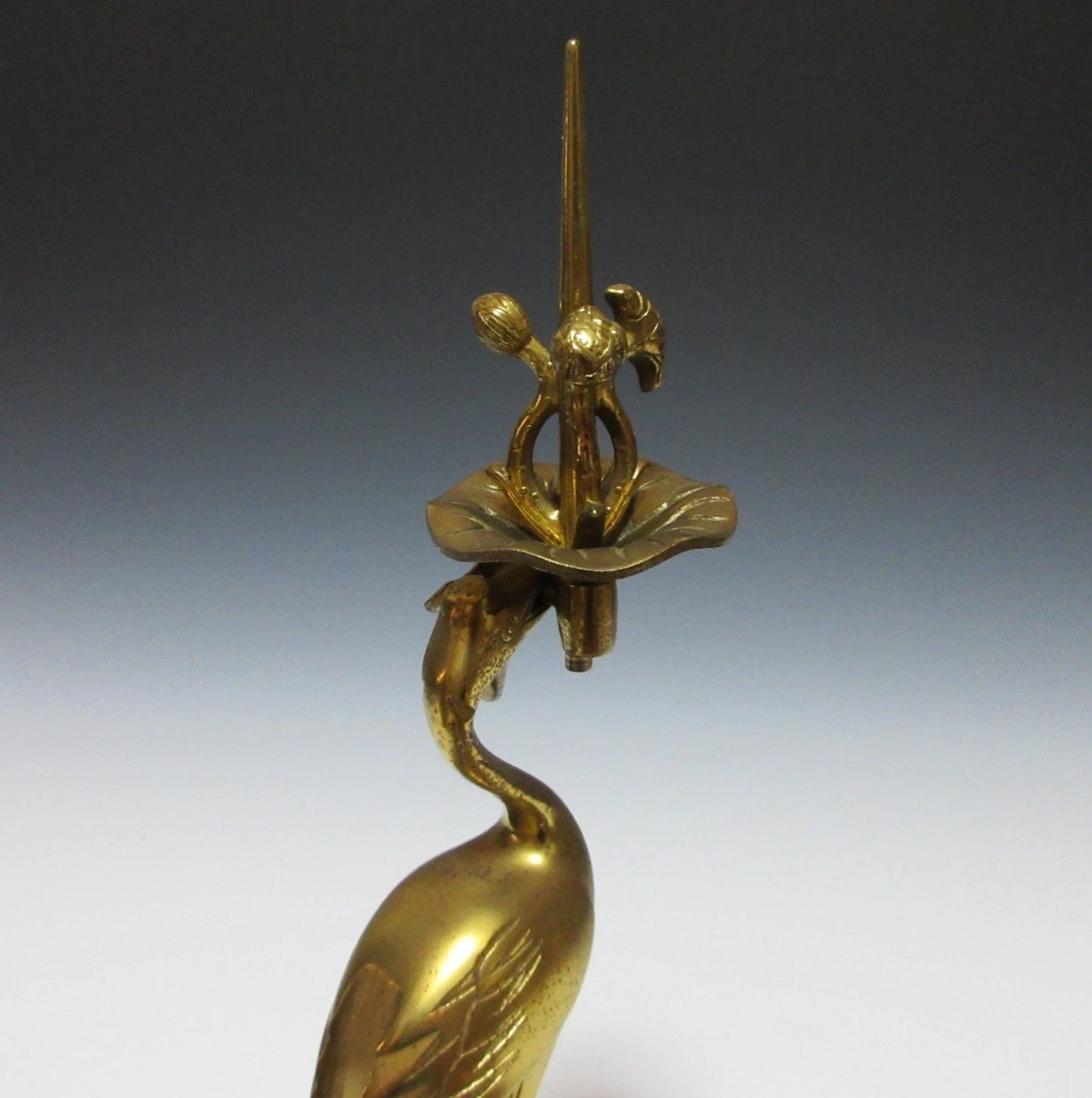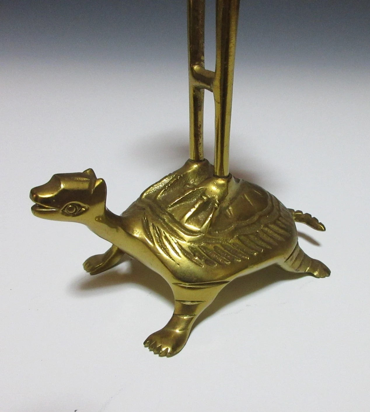 This listing is for a traditional Buddhist shokudai candle holder made about 30-40 years ago. It is made of brass and features a crane holding a lotus leaf standing on the back of a tortoise. This type of candle stand is usually placed at the Butsudan, which is the family altar found in people’s homes.