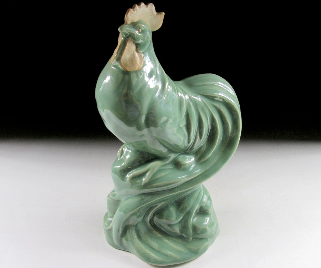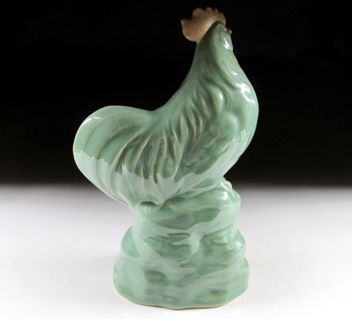 This listing is for a splendid celadon okimono made around 30 years ago for Tachikichi in Kyoto. It is made from a slip mould and moulded to resemble a Japanese long tailed ‘onagadori’ rooster. The celadon glaze work is glossy in appearance, however the waffle and comb of the bird is finished with matte glaze. The bottom is covered with green felt to protect furniture and to ‘hide’ the slip mould holes. This piece was most likely made to commemorate the Year of the Rooster back in 1981.