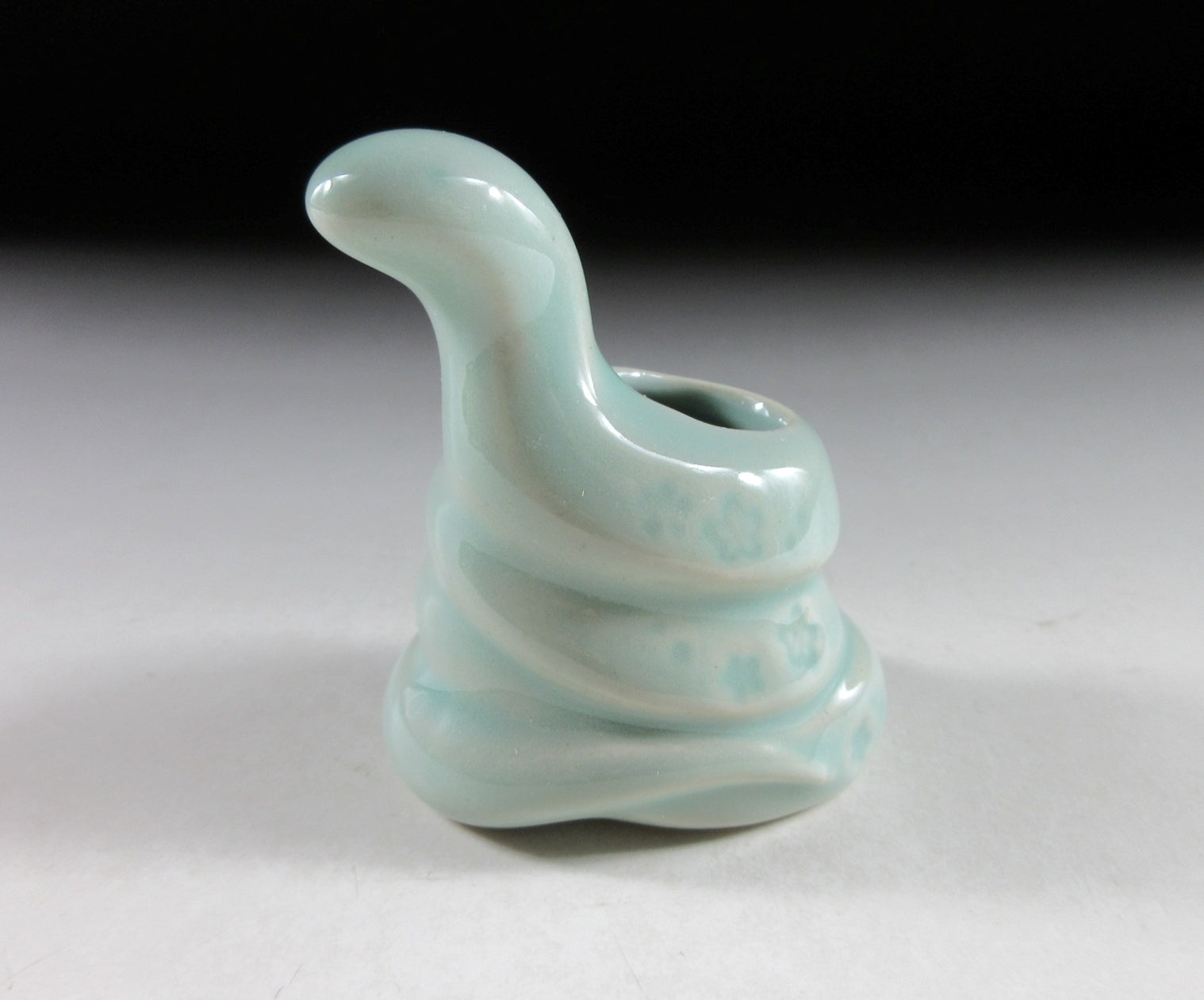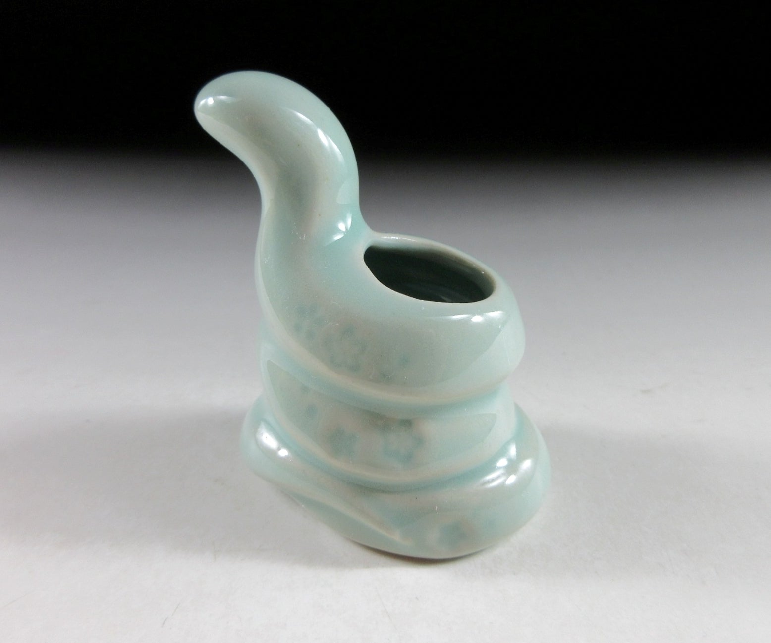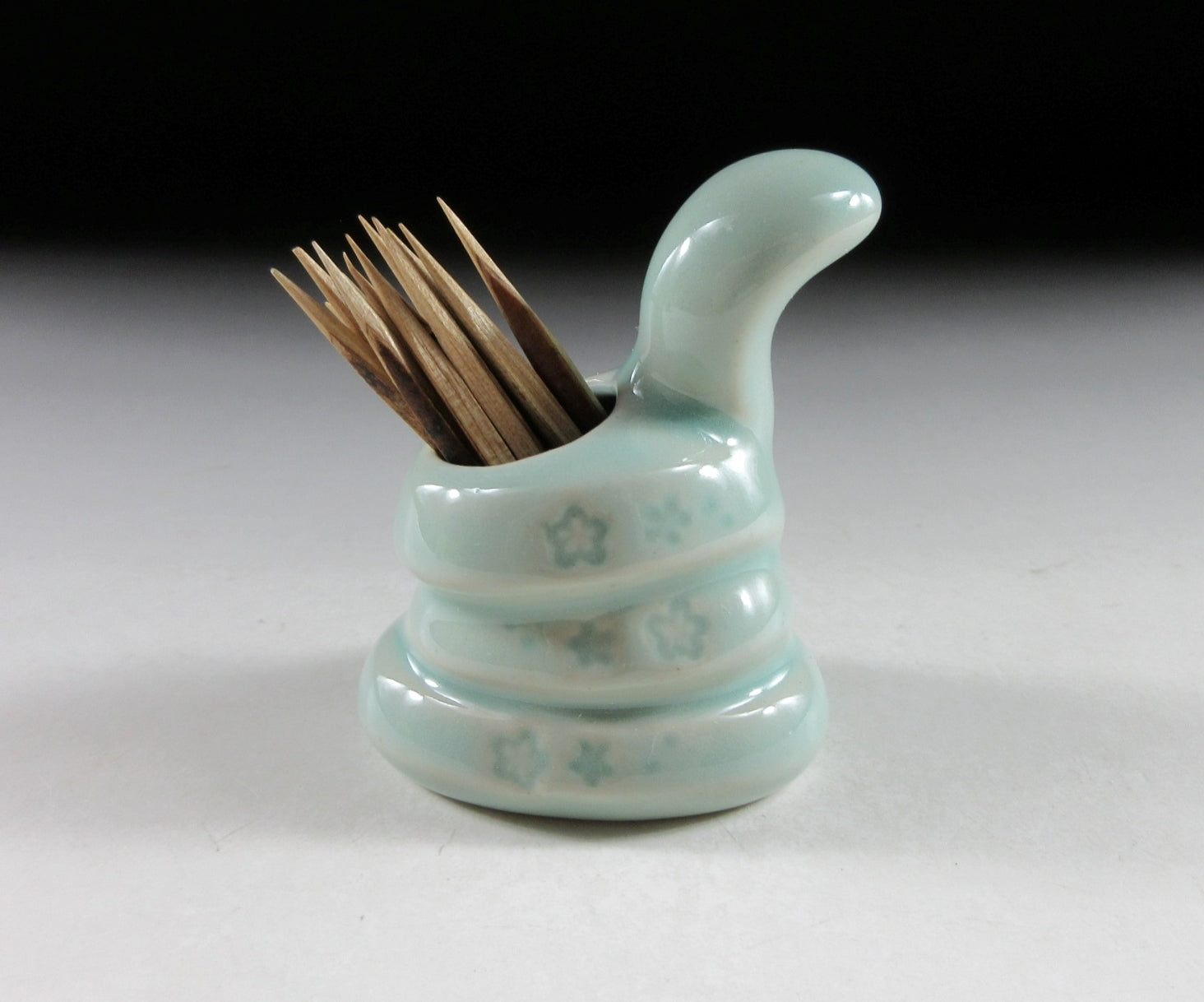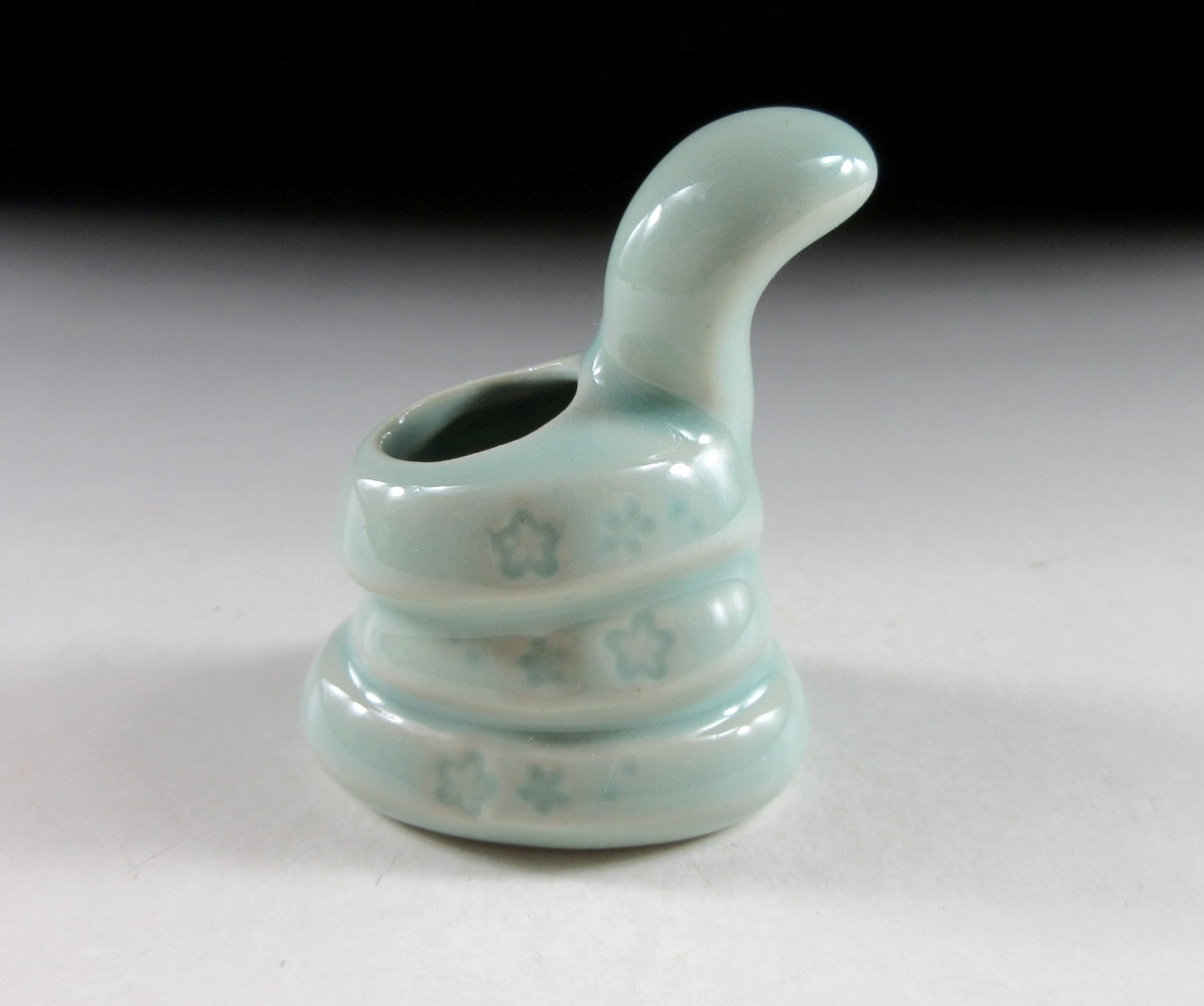 This listing is for a celadon glaze Year of the Snake toothpick holder. It was made using a press mould and features pale blue-green glaze. The snake is also decorated with little ume blossoms imprinted into the surface. Zodiac animal toothpick holders are very popular around New Year, and they’re also ideal for growing air plants.