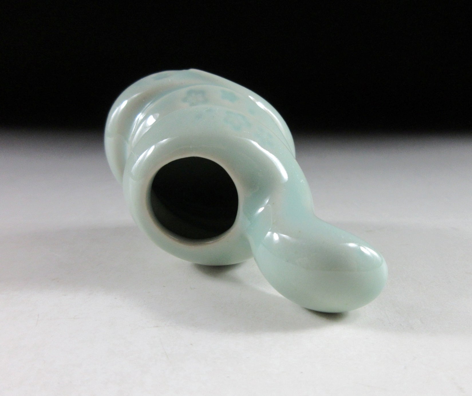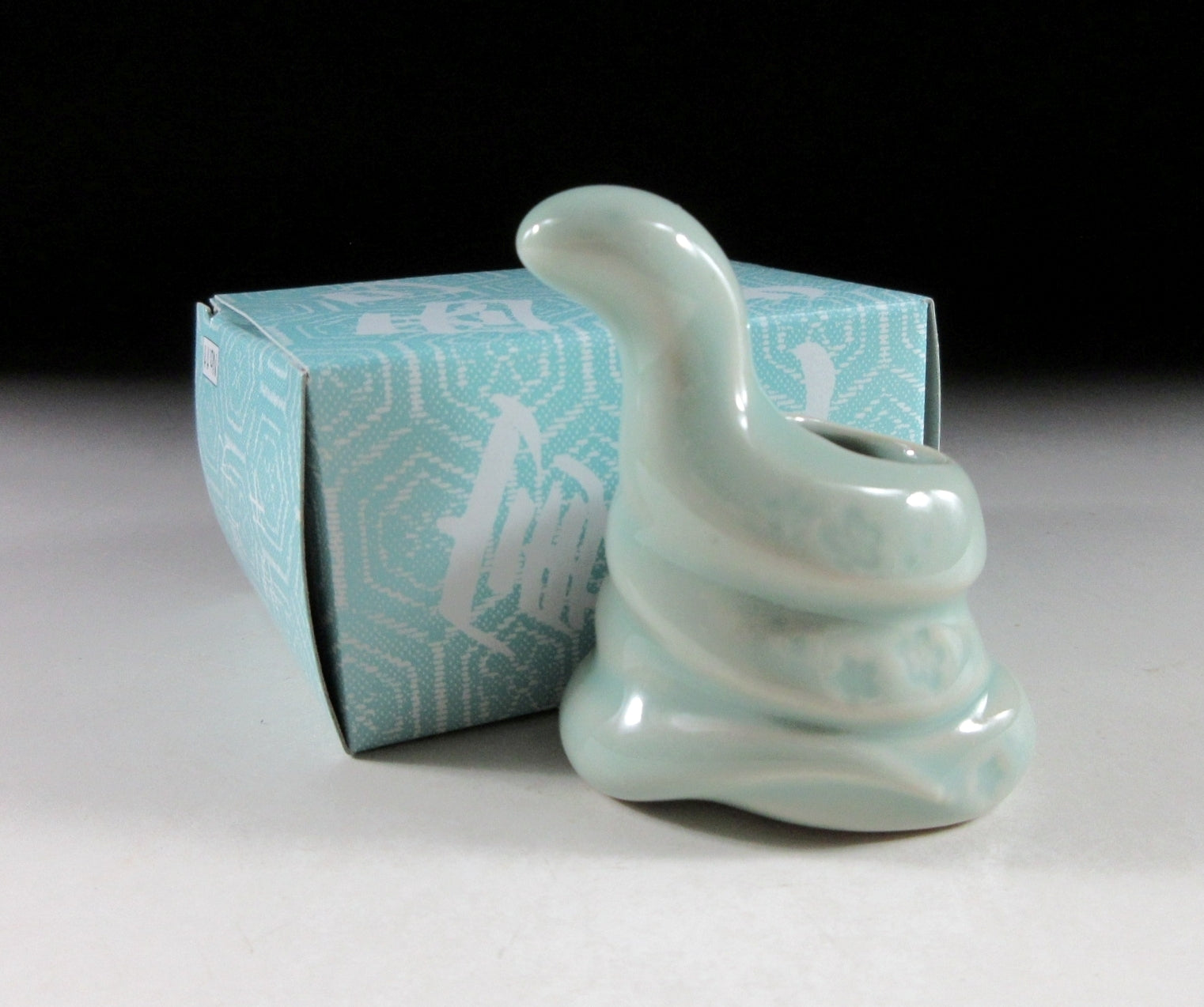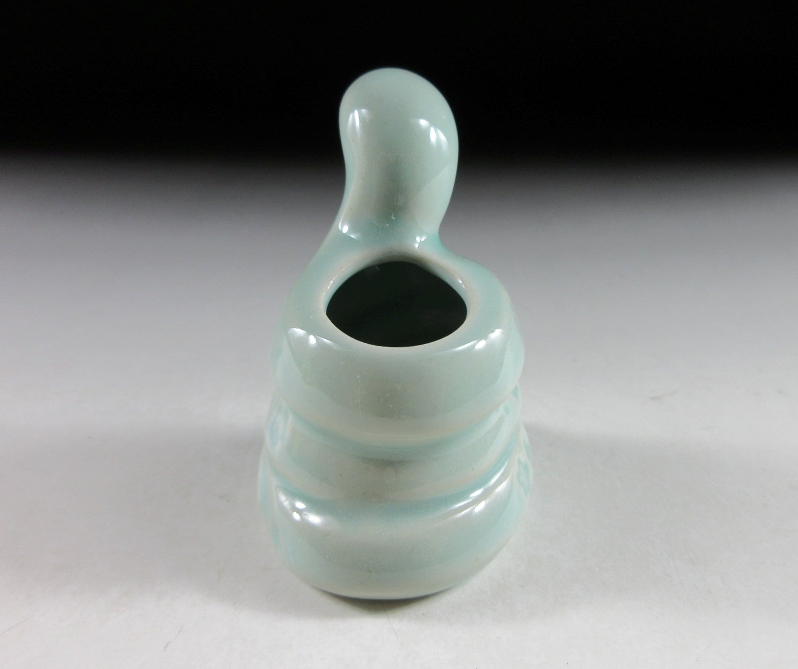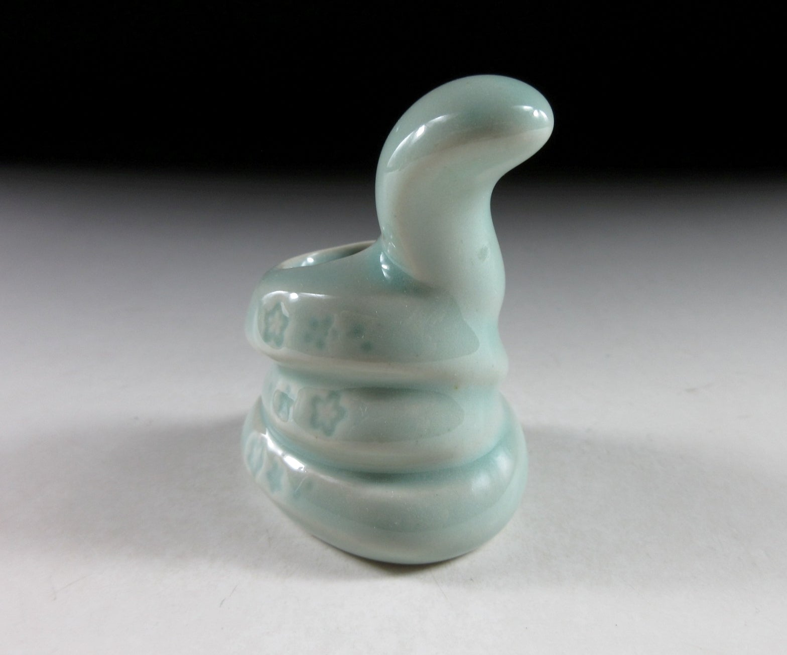 This listing is for a celadon glaze Year of the Snake toothpick holder. It was made using a press mould and features pale blue-green glaze. The snake is also decorated with little ume blossoms imprinted into the surface. Zodiac animal toothpick holders are very popular around New Year, and they’re also ideal for growing air plants.