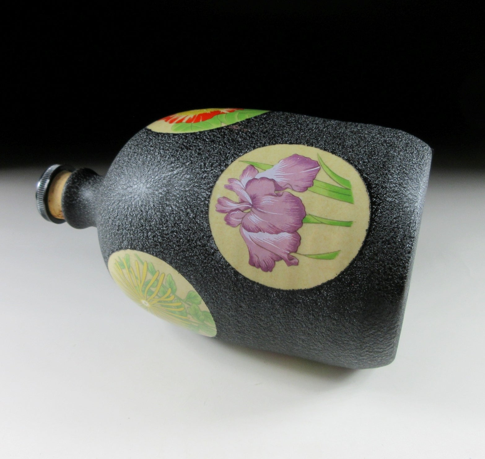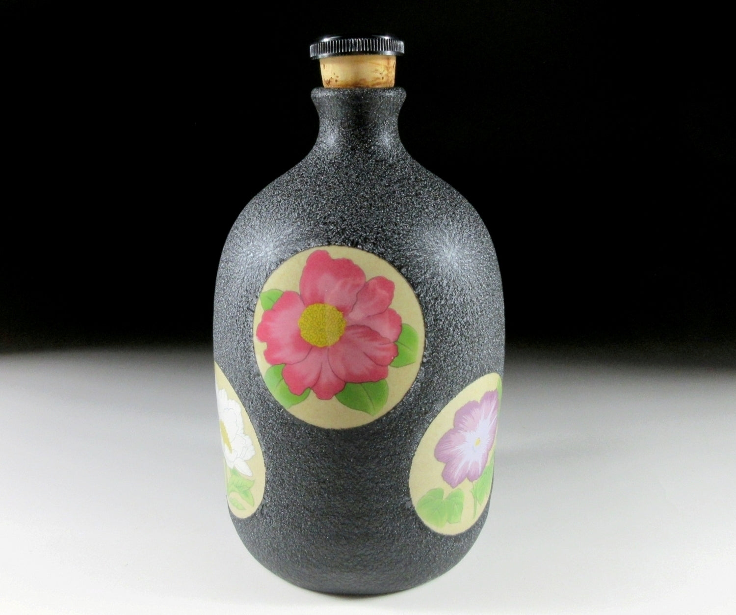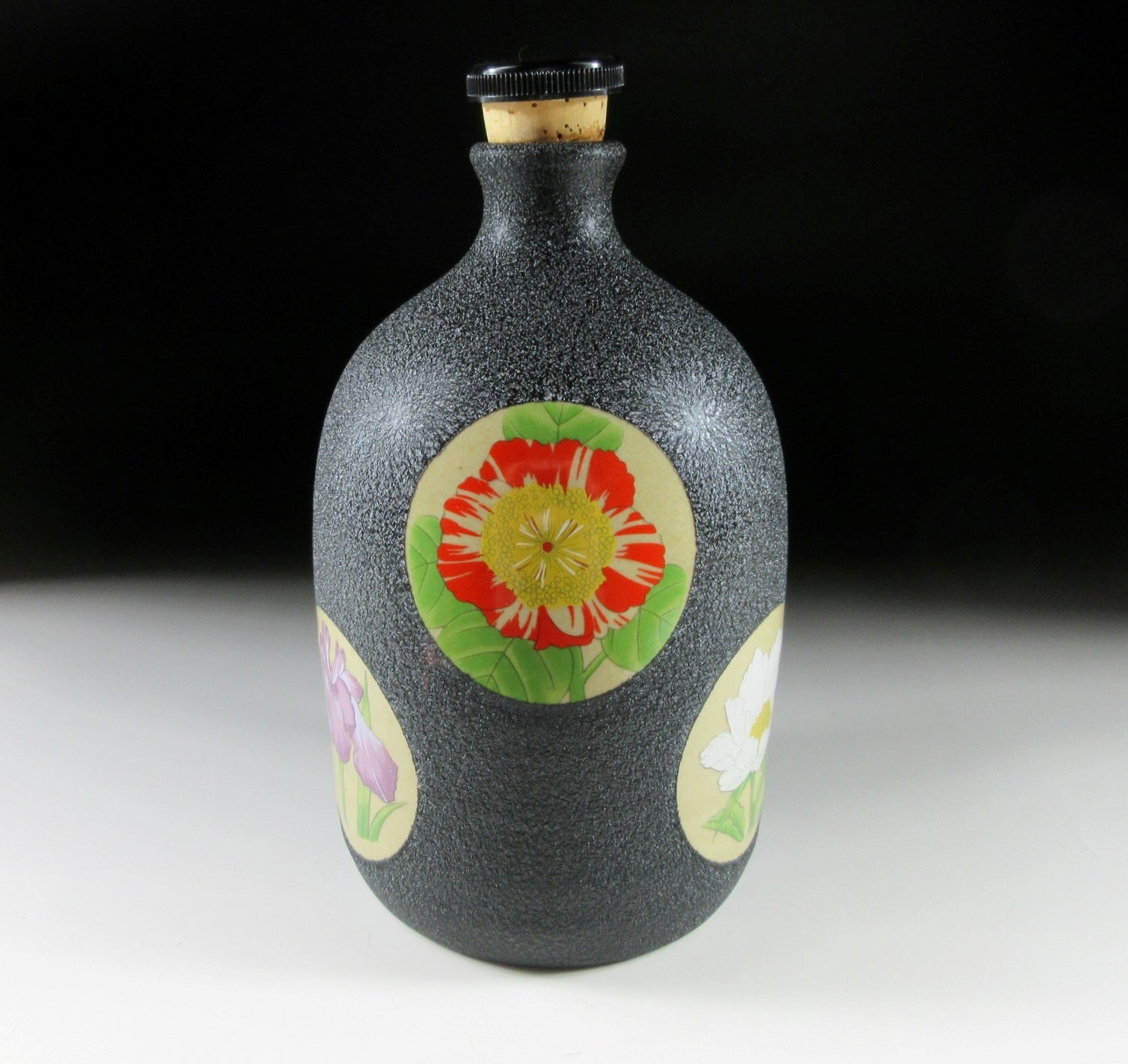 This listing is for a ceramic shochu bottle made around 20 years ago. This piece has a nice tall shape and is decorated with various flower motifs against a slightly textured black glazed background. It still has its original cork, but the cork doesn’t fit well and is incredibly difficult to push down. This piece would make a wonderful vase or beautiful display item.