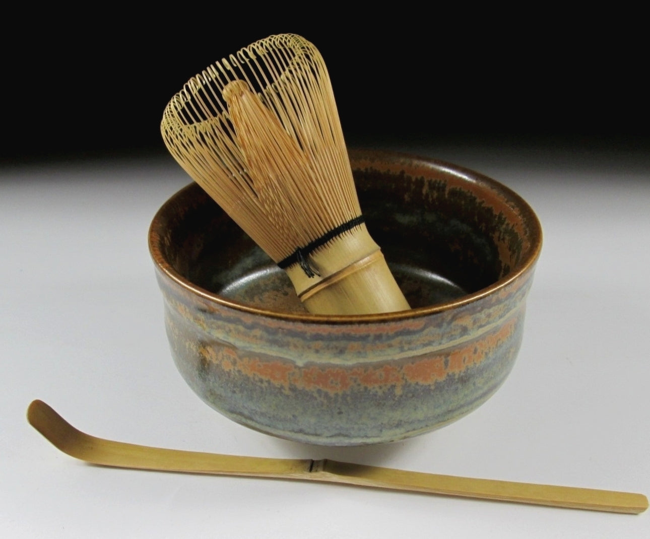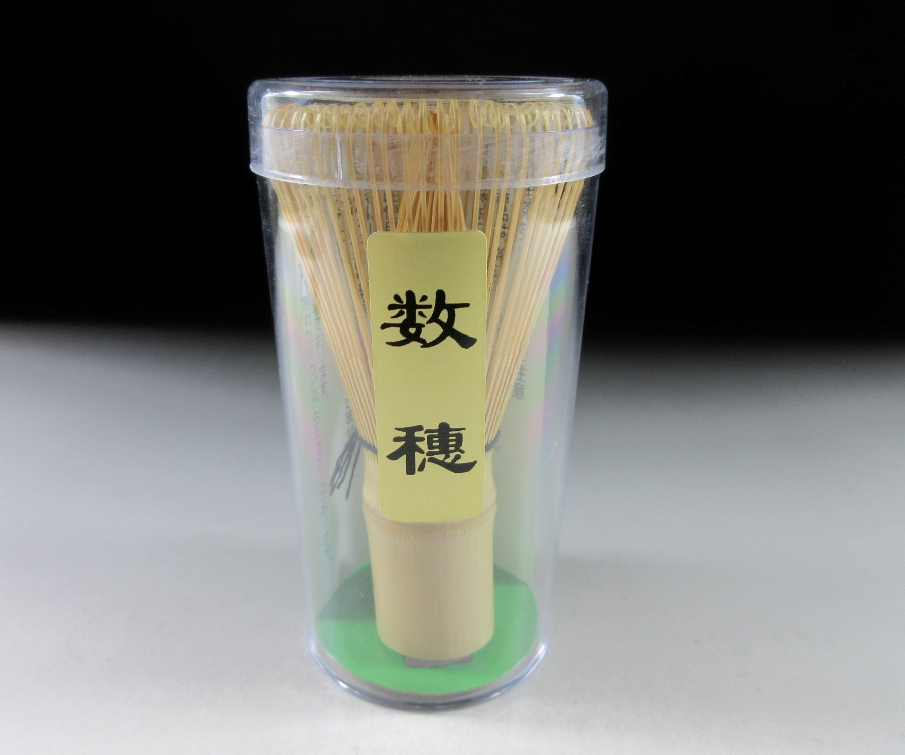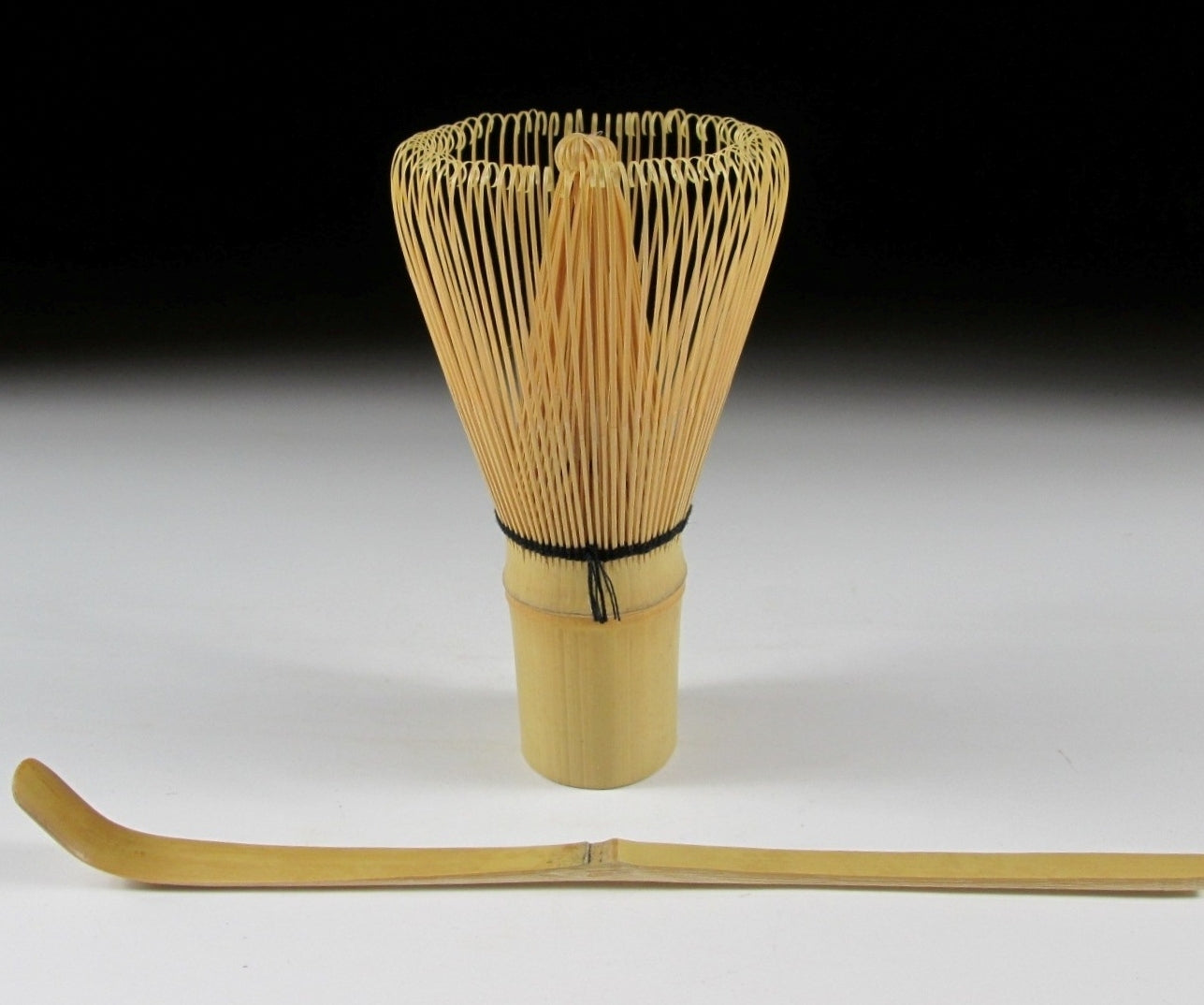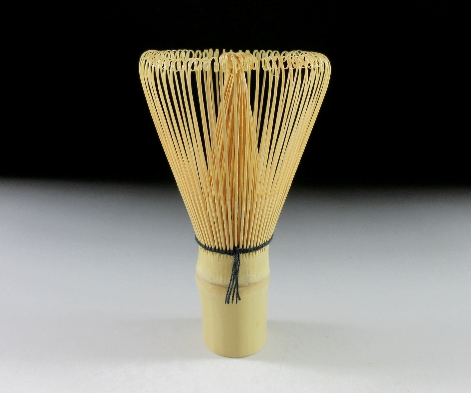 This listing is for a bamboo chasen and chashaku set. The chasen is tulip shaped and split from one piece of bamboo into 100 small prongs. The 100 tine type is considered to be better quality because more prongs result in more foam and a better frothy texture. The set also includes a chashaku. The bamboo most commonly used for chashaku is from the Nigatake bamboo family, especially Sarashitake bamboo.