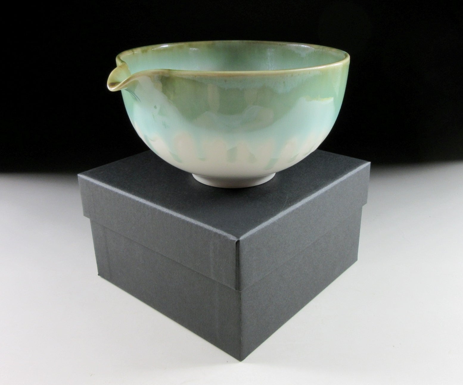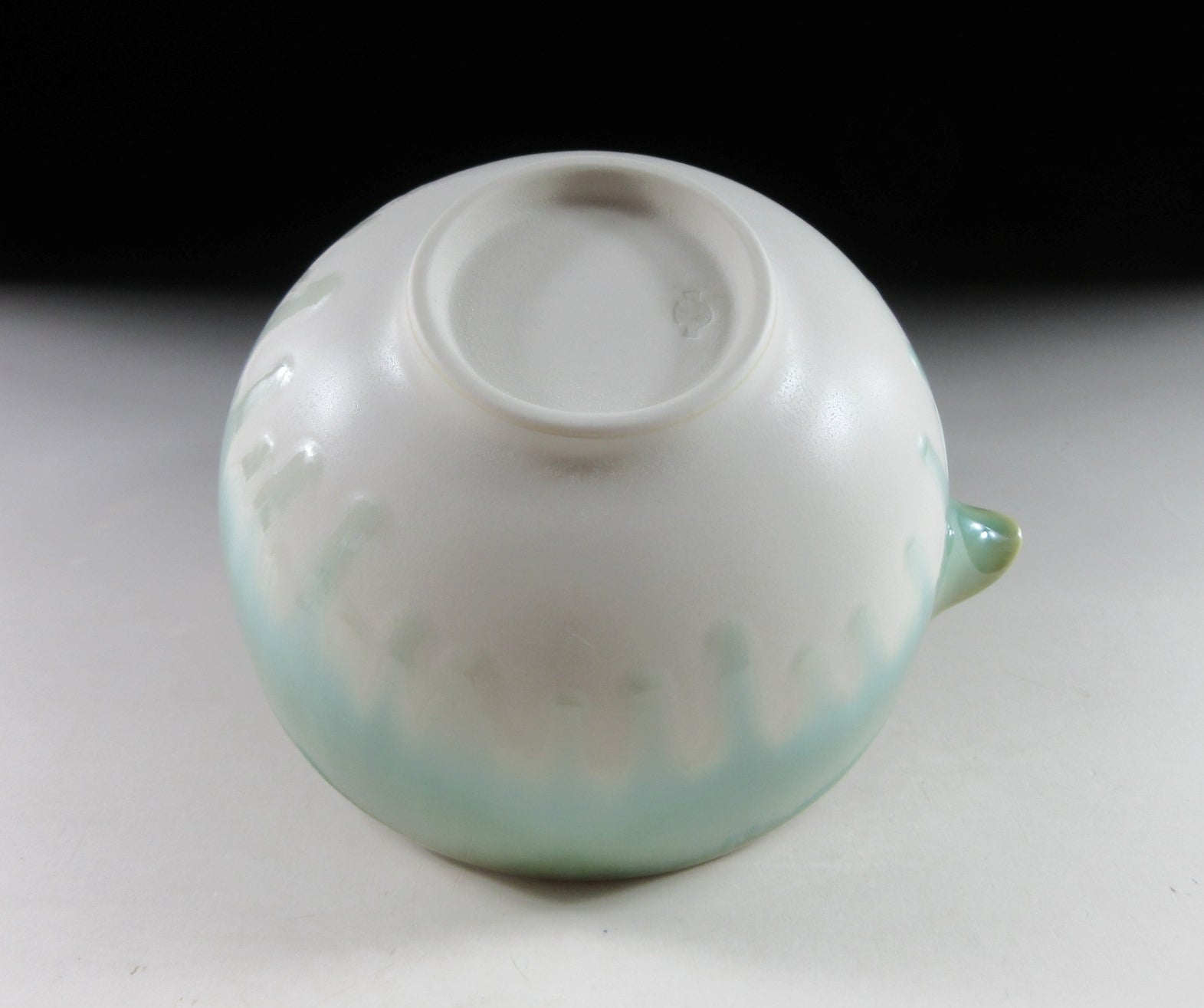 This listing is for a 400ml Hasami-ware katakuchi tea bowl made by Chojuro Gama. A katakuchi is a pouring bowl traditionally used for serving sake, however these days they are often used the same way as a yuzamashi is used to cool water before steeping tea leaves in a kyusu. It is also possible to whisk matcha in a katakuchi. The katakuchi in this listing is made of high fired stoneware and features ‘namako‘ sea cucumber glaze trailing down from the rim. The stamp of the kiln can be found on the bottom, and it comes with a paper storage box.