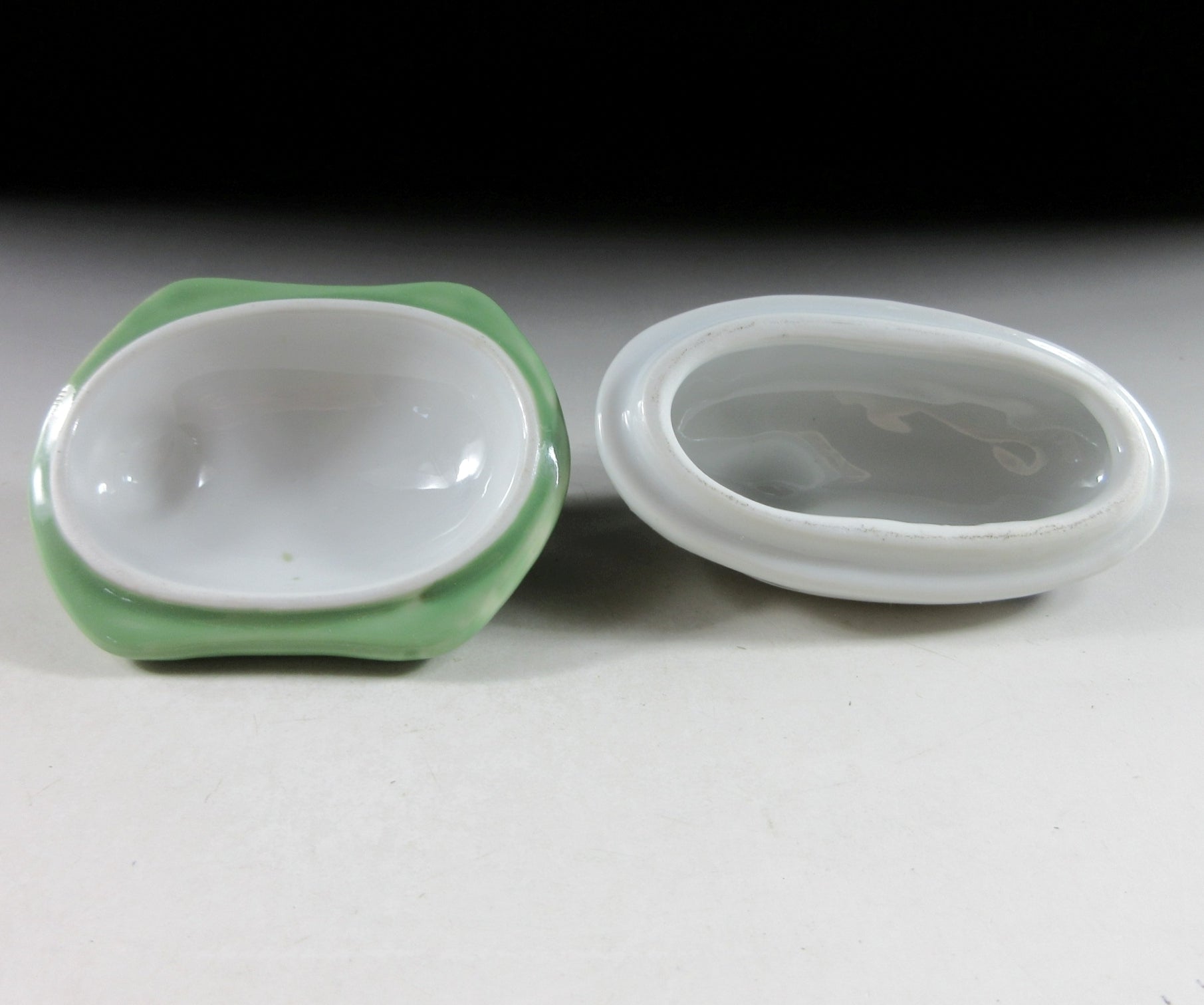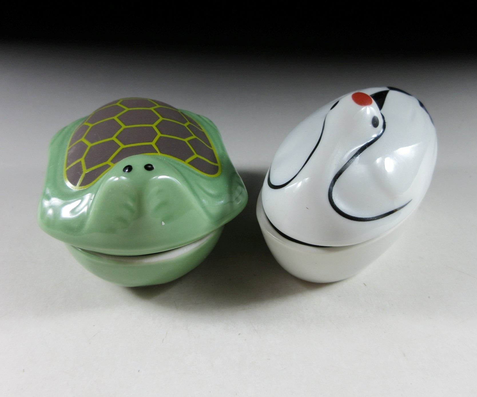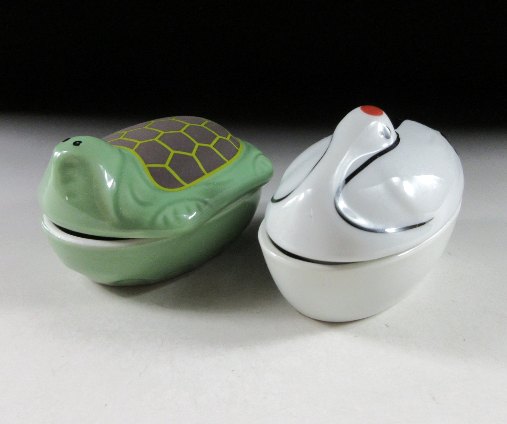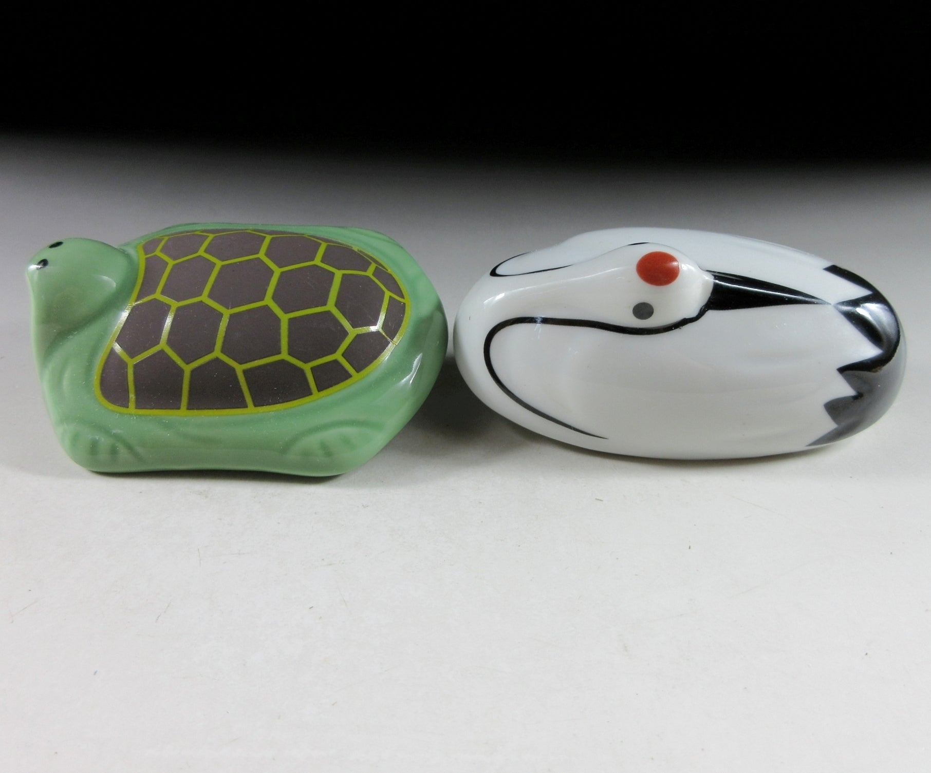 This listing is for a Mino-ware futamono lidded case. Futamono are dishes for holding things like soup, pickles and small side dishes. The futamono in this listing is made of porcelain and moulded to resemble a Japanese crane and tortoise. Please note that futamono are larger than kogo for holding incense, but are by no means big. Futamono are also suitable for holding small items like earrings, or could be used for holding teabags after use. *We have three sets available.
