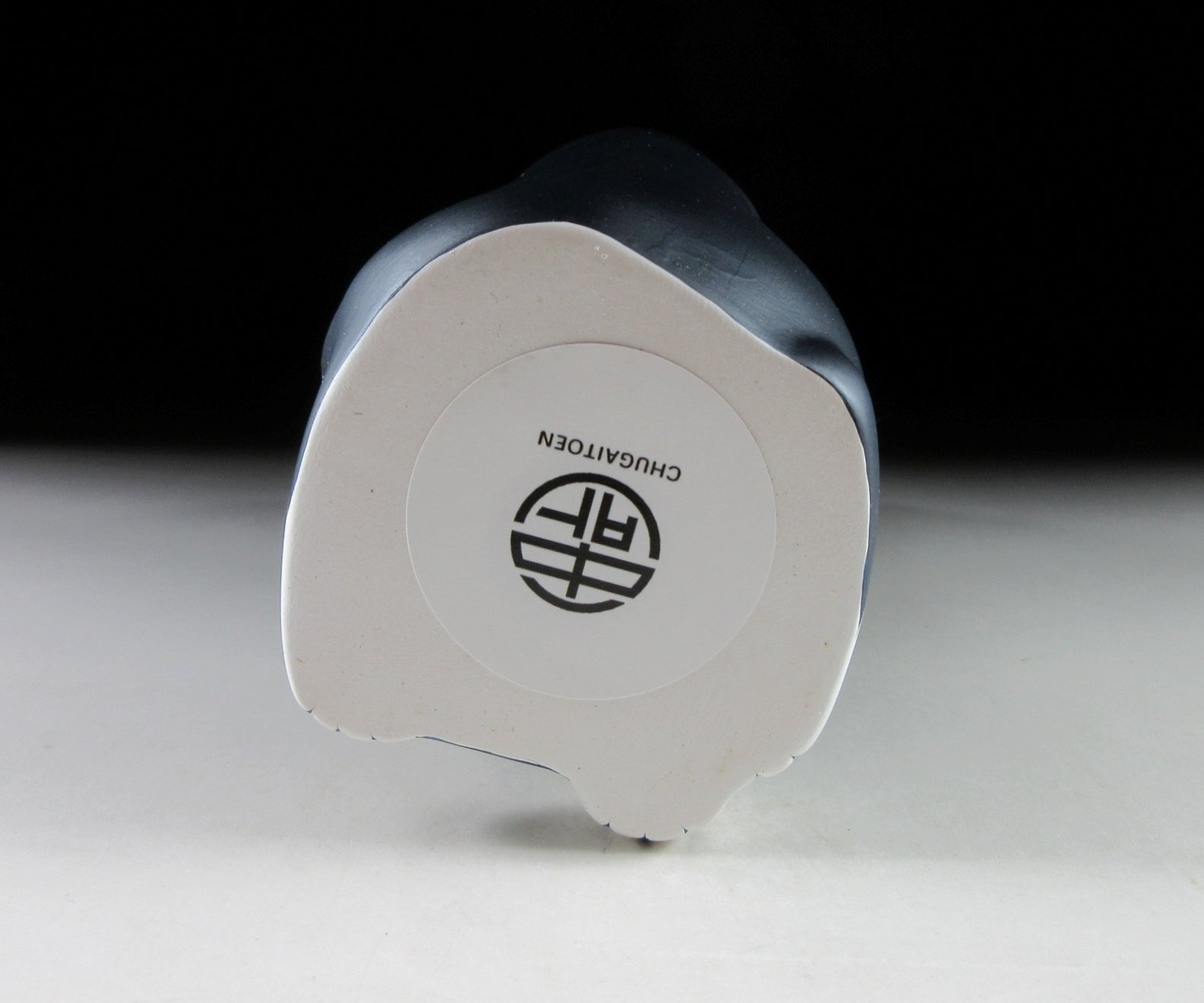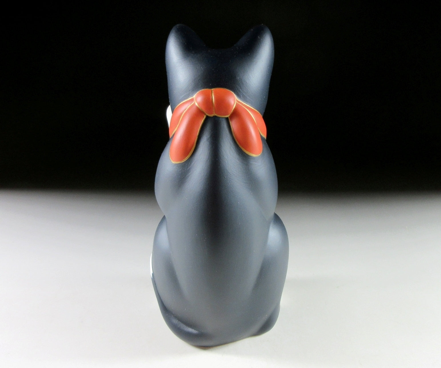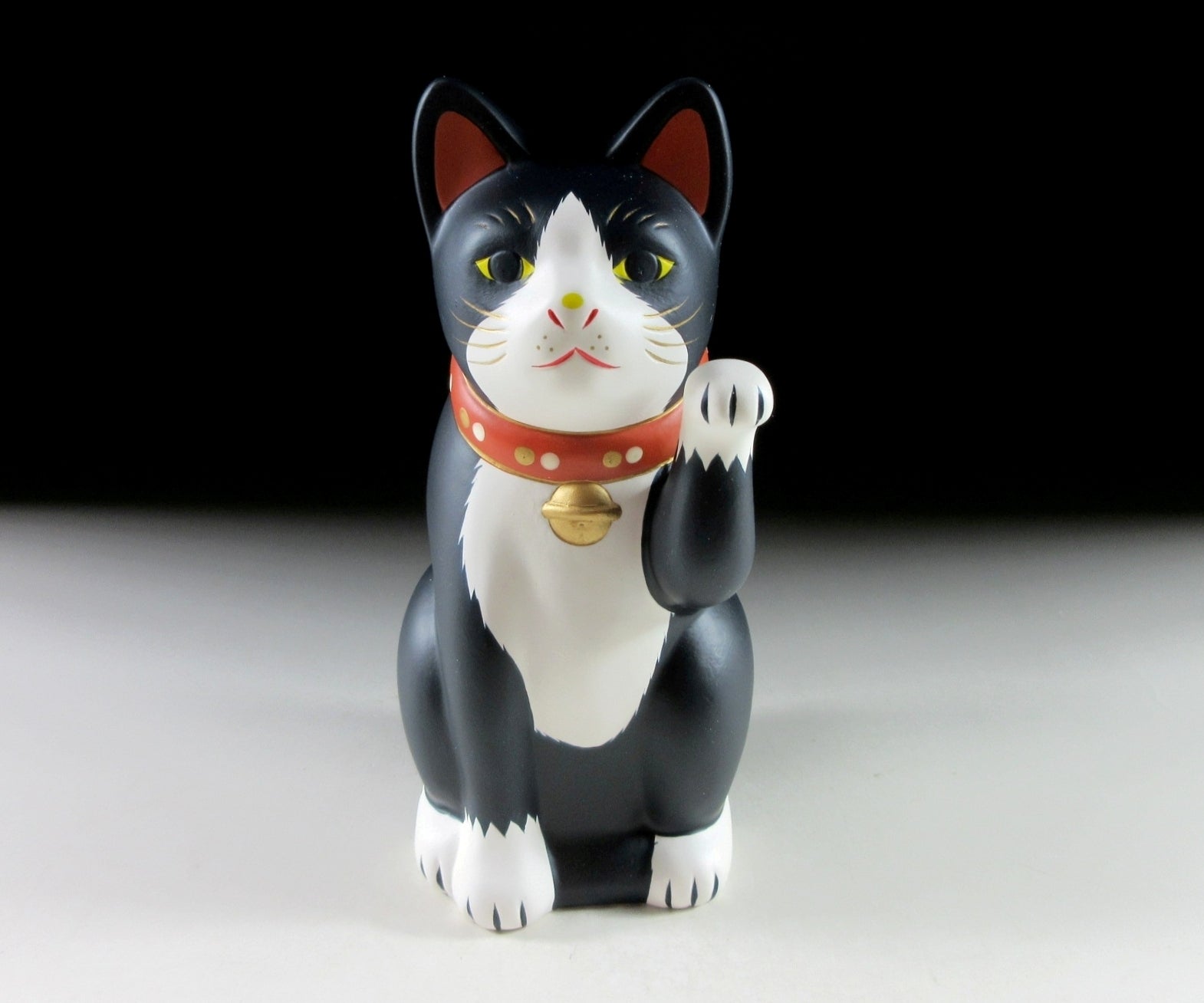 This listing is for a brand new maneki neko made by Chugai Toen. A maneki neko is a beckoning cat that’s believed to bring good luck to its owner, thus making them a very common sight in stores and restaurants. The maneki in this listing is made from a mould and decorated with dark blue and white paint, and it has a red collar with a gold bell tied around its neck. This particular maneki has its left paw raised and is a part of the kiln’s Seto Manekineko series. It also comes with its original paper storage box. The English on the back of the box explains that a raised right paw is said to be beckoning money, whilst a raised left paw invites patronage.