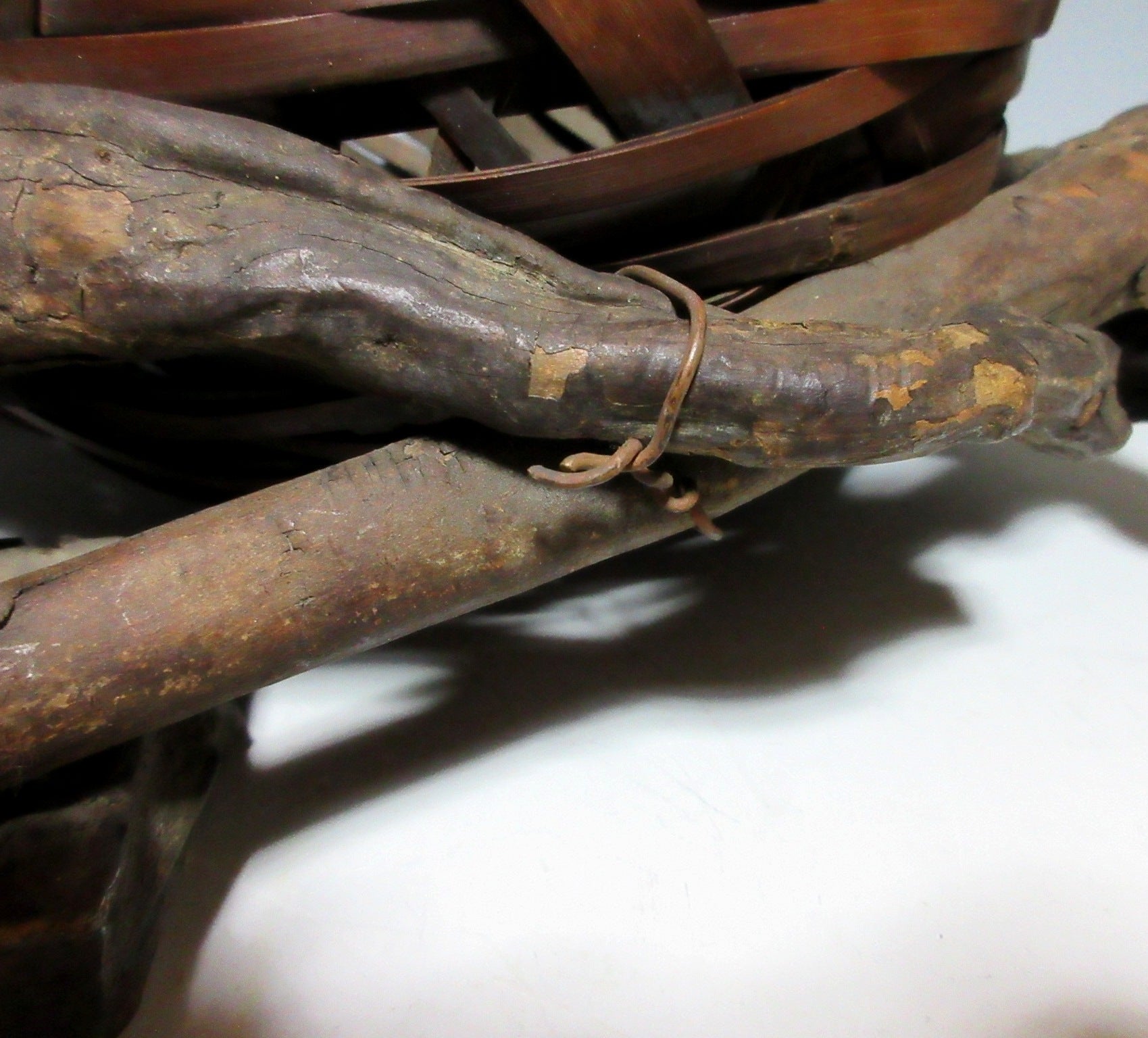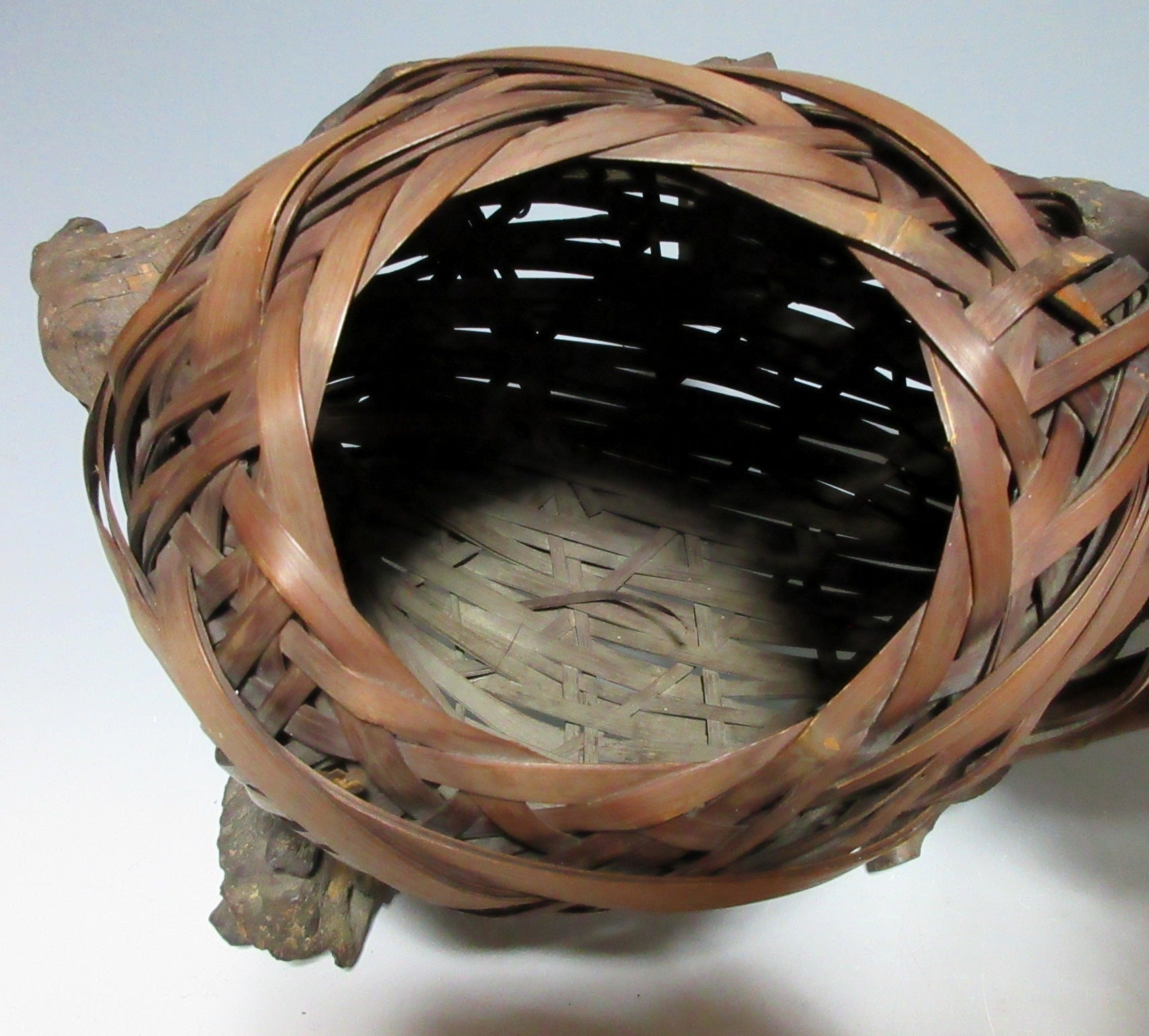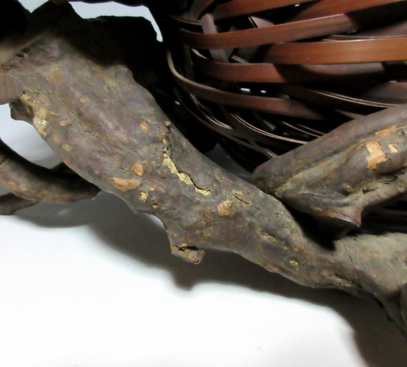 Overall it’s in pretty good condition for its age. There’s a lot of dust build up, some bark is peeling from the root wood base, the basket is attached to the root with wire on one side, some white spots here and there, and the basket is a little loose in the root base (especially at the top). Structurally it’s very sound and in very usable condition. Unfortunately there is no insert for holding flowers.