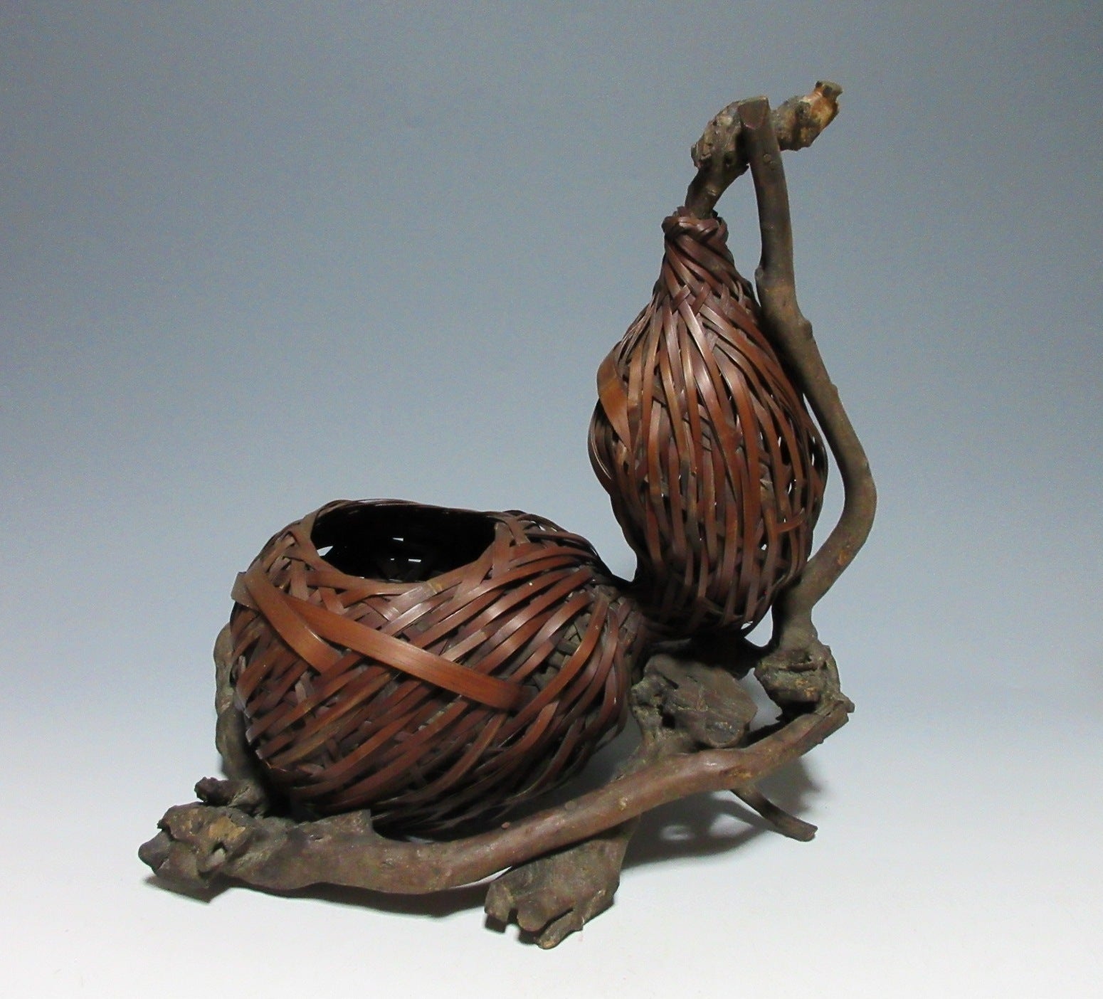 This listing is for a double gourd hyotan ikebana basket made around 70 years ago. Hyotan ikebana baskets are inspired by nature considered a utilitarian form of art. Thin strips of split bamboo have been skilfully woven then lacquered, and the gourd basket is cradled in a gnarled root wood base. The basket is in good working condition and is beautiful enough to be displayed on its own.