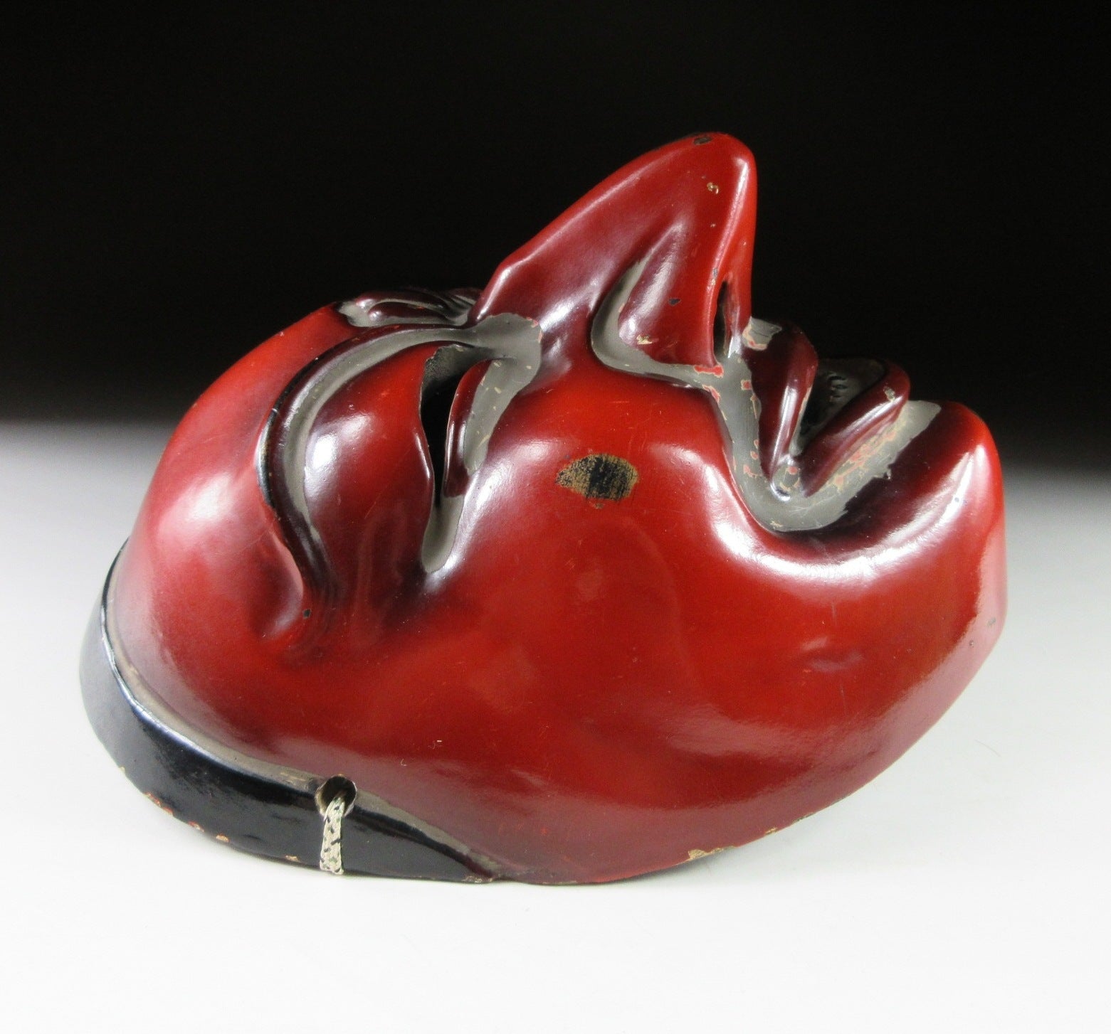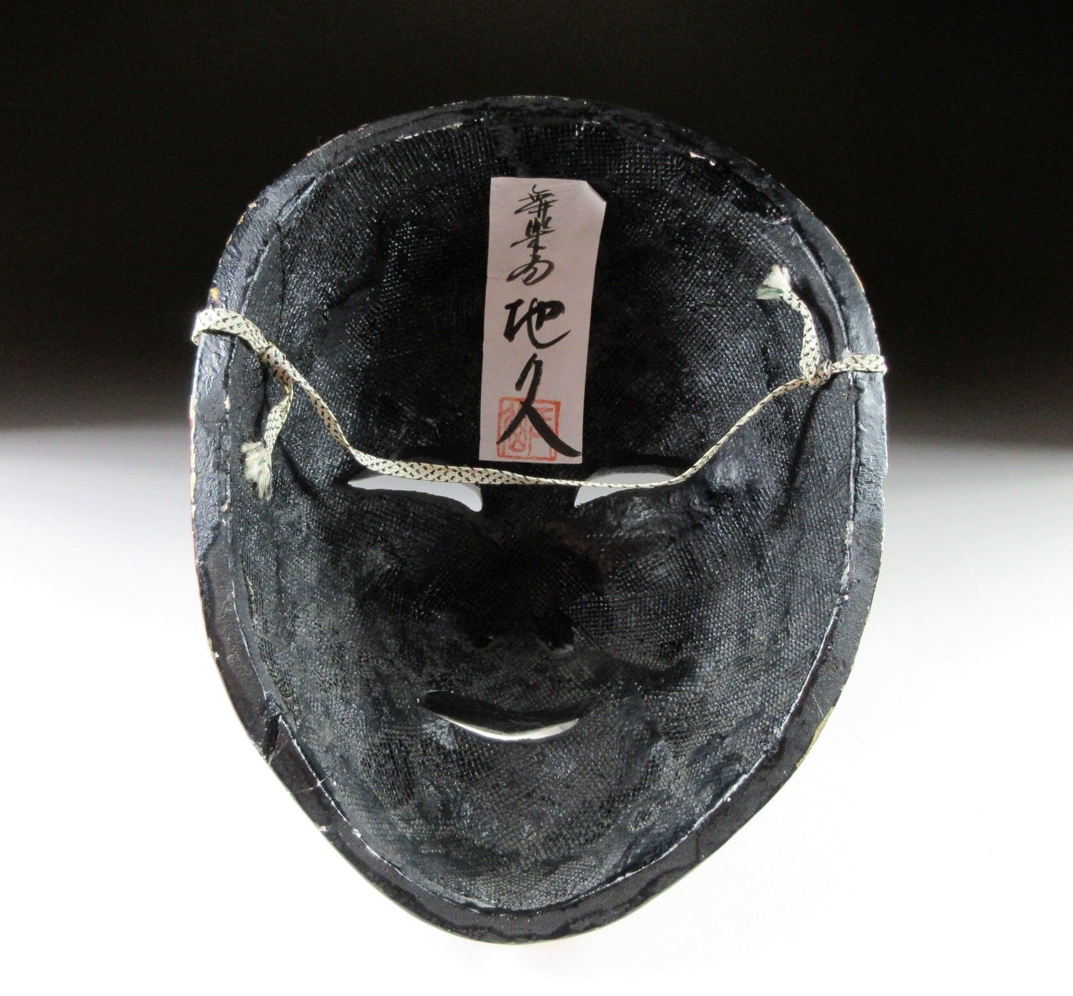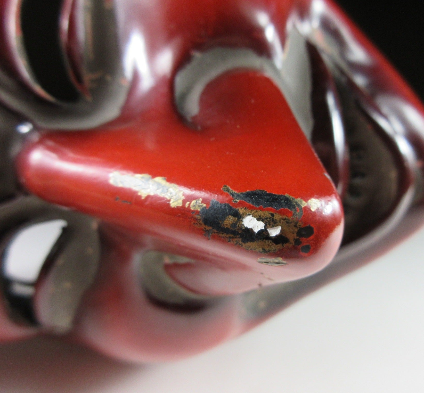 This listing is for a ‘kanshitsu’ dry lacquer bugaku mask made around 20-30 years ago. It is made of wood with a layer of gauze over the top, and finished with red and black lacquer. This particular mask is worn during the Chikyu dance at bugaku performances. Bugaku refers to a court dance that began during the mid-Heian period, which is now the basis for Noh plays. Chikyu is generally performed by around four people, and is accompanied by an auspicious song that is said to celebrate the eternal prosperity of the earth. Please note that this isn’t a real bugaku mask, it’s a replica made for decorative purposes. The signature and stamp of the craftsperson can be found on the back.