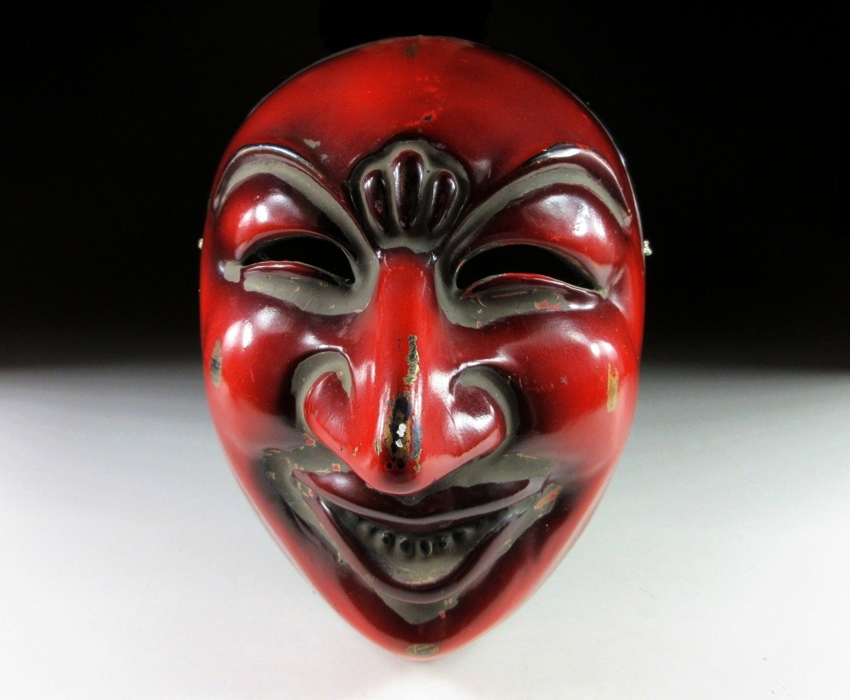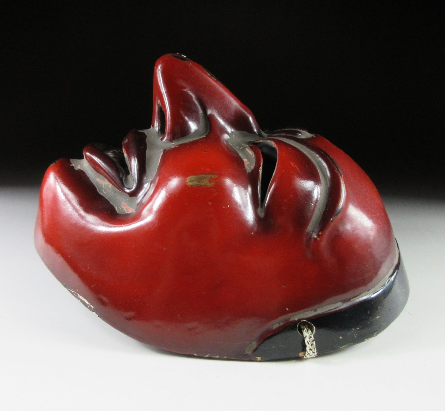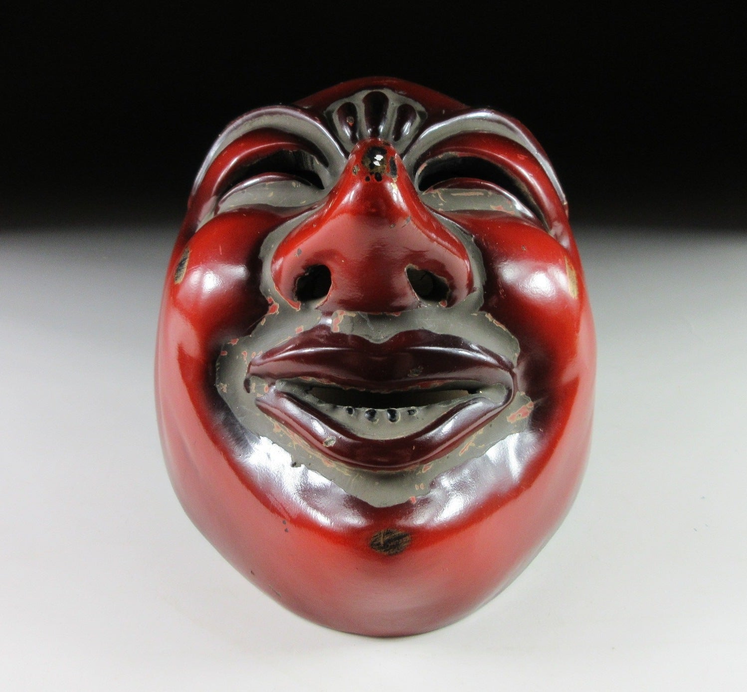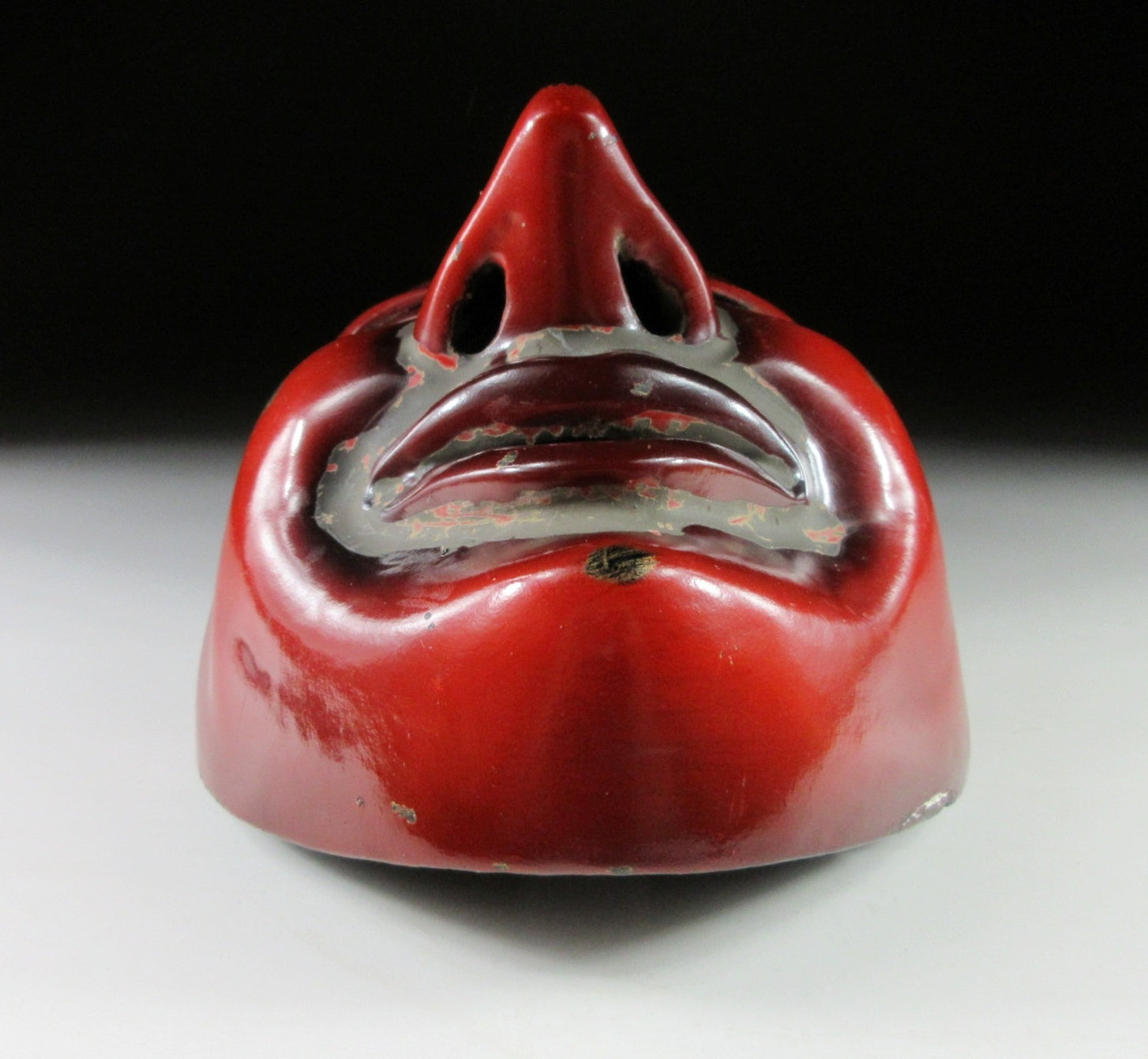 This listing is for a ‘kanshitsu’ dry lacquer bugaku mask made around 20-30 years ago. It is made of wood with a layer of gauze over the top, and finished with red and black lacquer. This particular mask is worn during the Chikyu dance at bugaku performances. Bugaku refers to a court dance that began during the mid-Heian period, which is now the basis for Noh plays. Chikyu is generally performed by around four people, and is accompanied by an auspicious song that is said to celebrate the eternal prosperity of the earth. Please note that this isn’t a real bugaku mask, it’s a replica made for decorative purposes. The signature and stamp of the craftsperson can be found on the back.