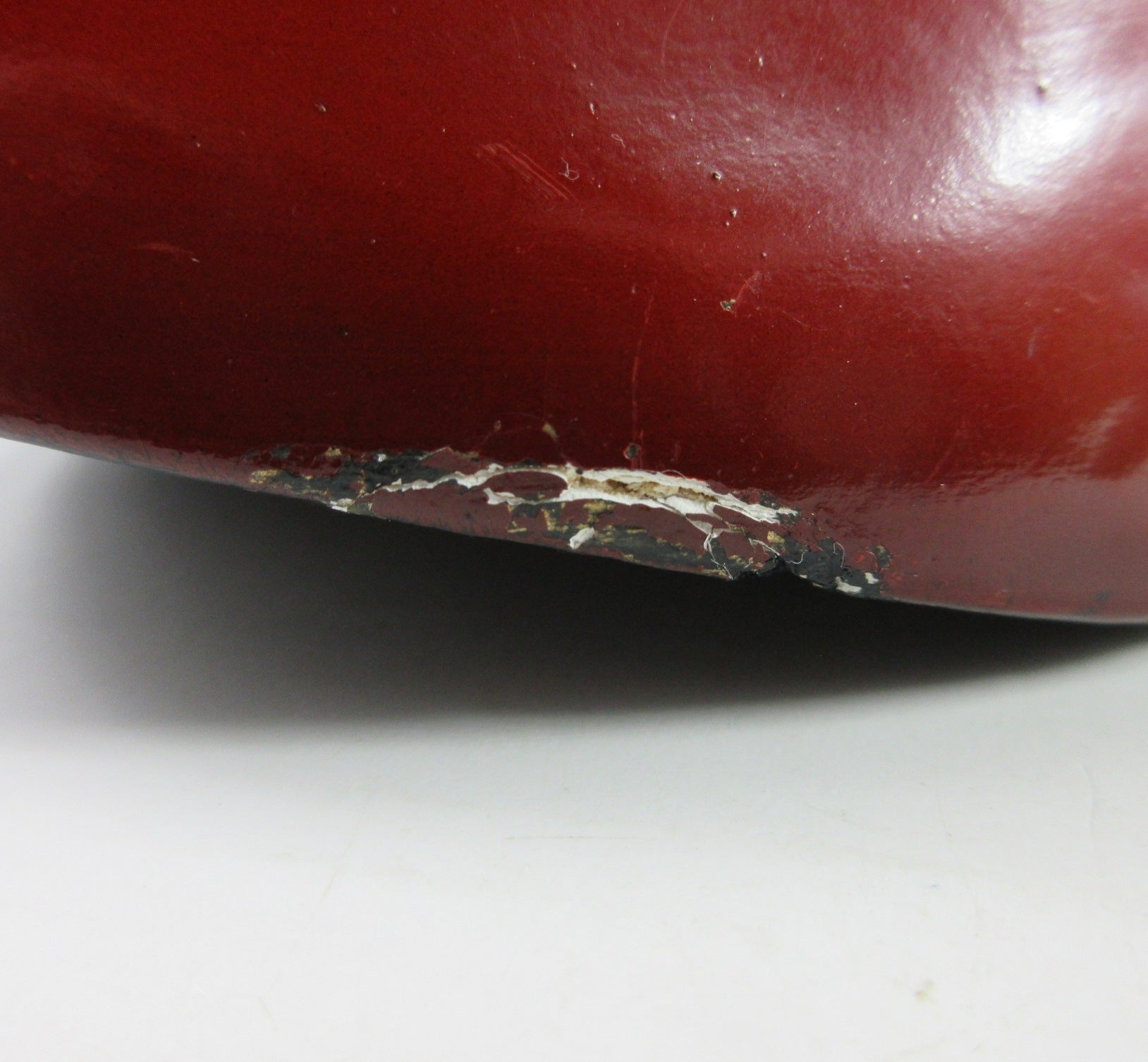 There’s some general surface wear, damage to the lacquer on one side (photo 8), and some wear on the nose (photo 9), top of the head and along the edges (photo 6).