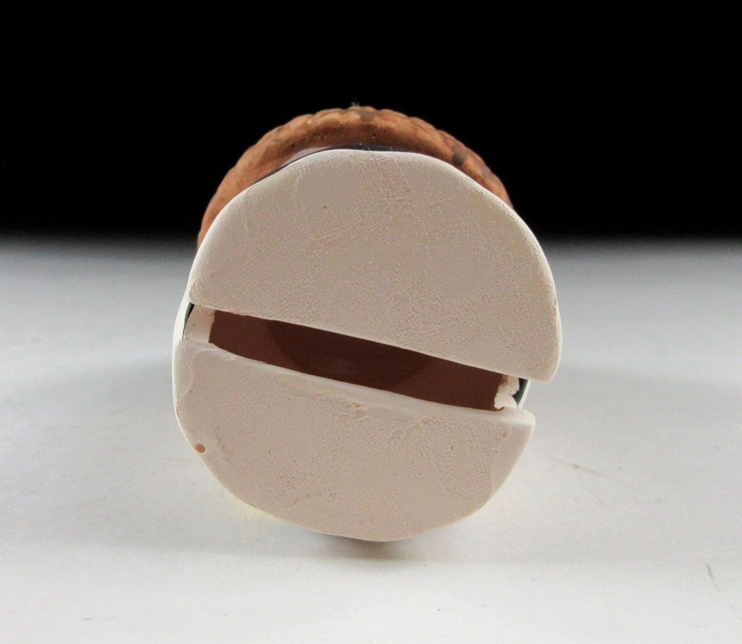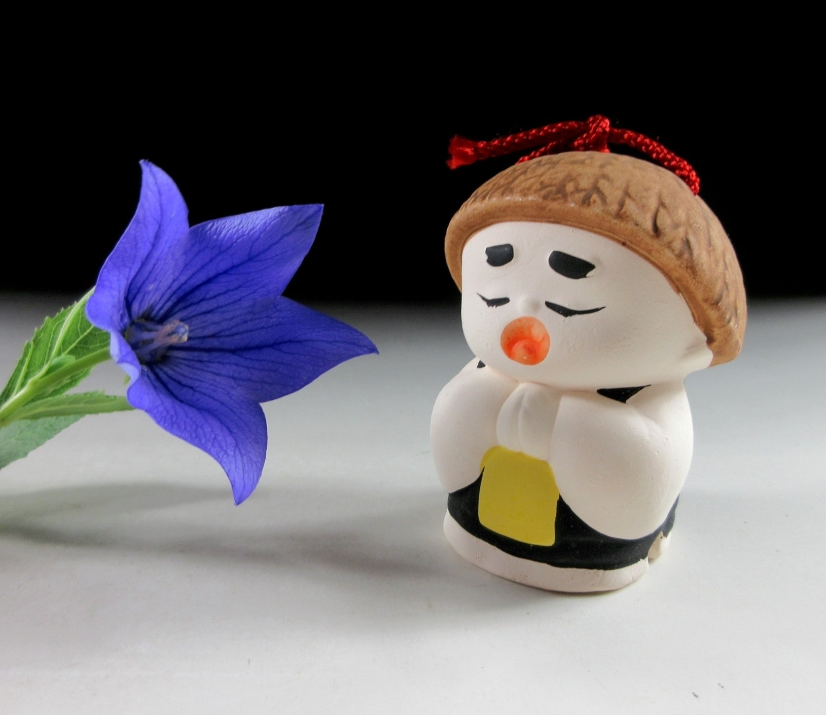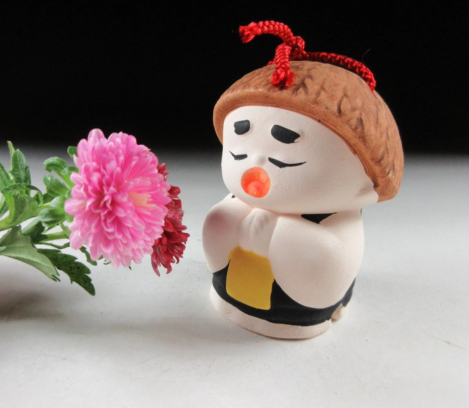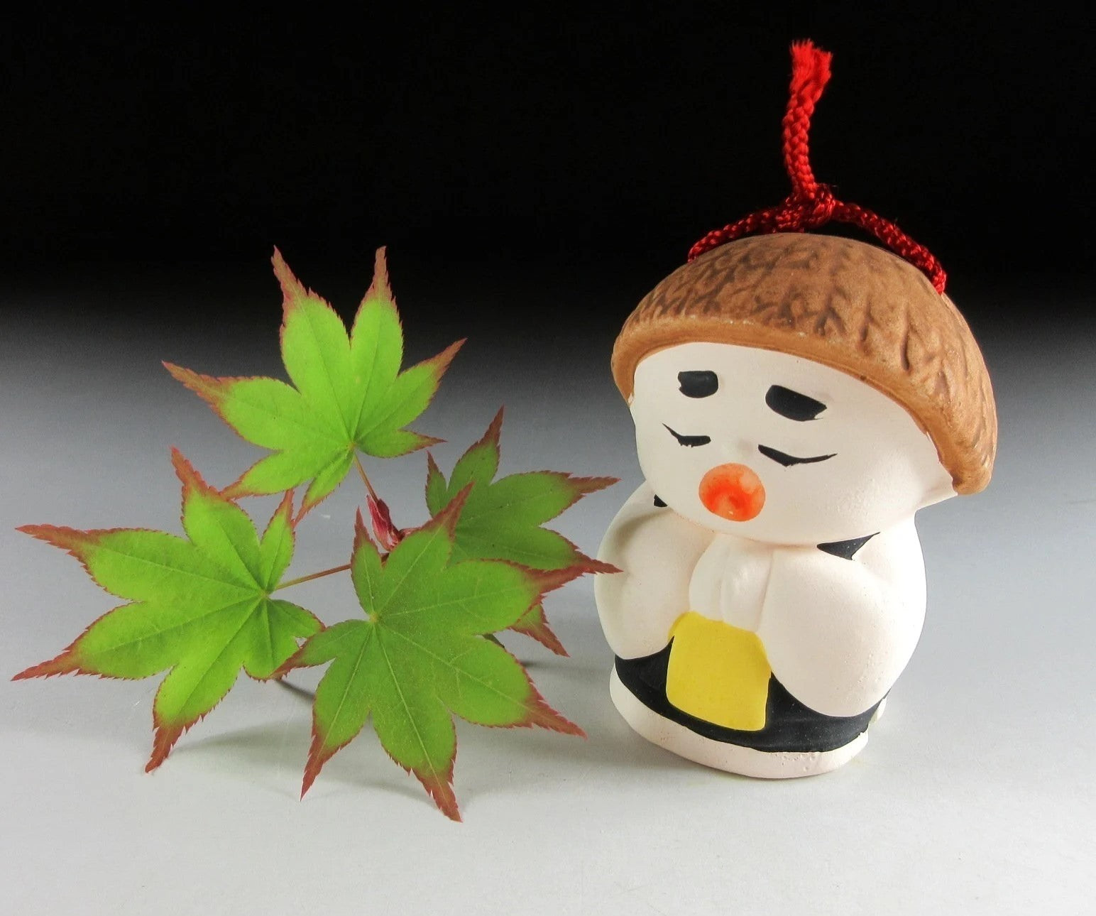 This listing is for a small earthenware monk bell painted with matte gesso. It is modelled on the Zen Buddhist monk and poet named Ikkyu Sojun. Ikkyu was known for the impact he had on the infusion of Japanese art and literature with Zen attitudes and ideals. This bell was possibly a souvenir from Kyoto, or the Biwa area in Shiga Prefecture where Ikkyu once lived.