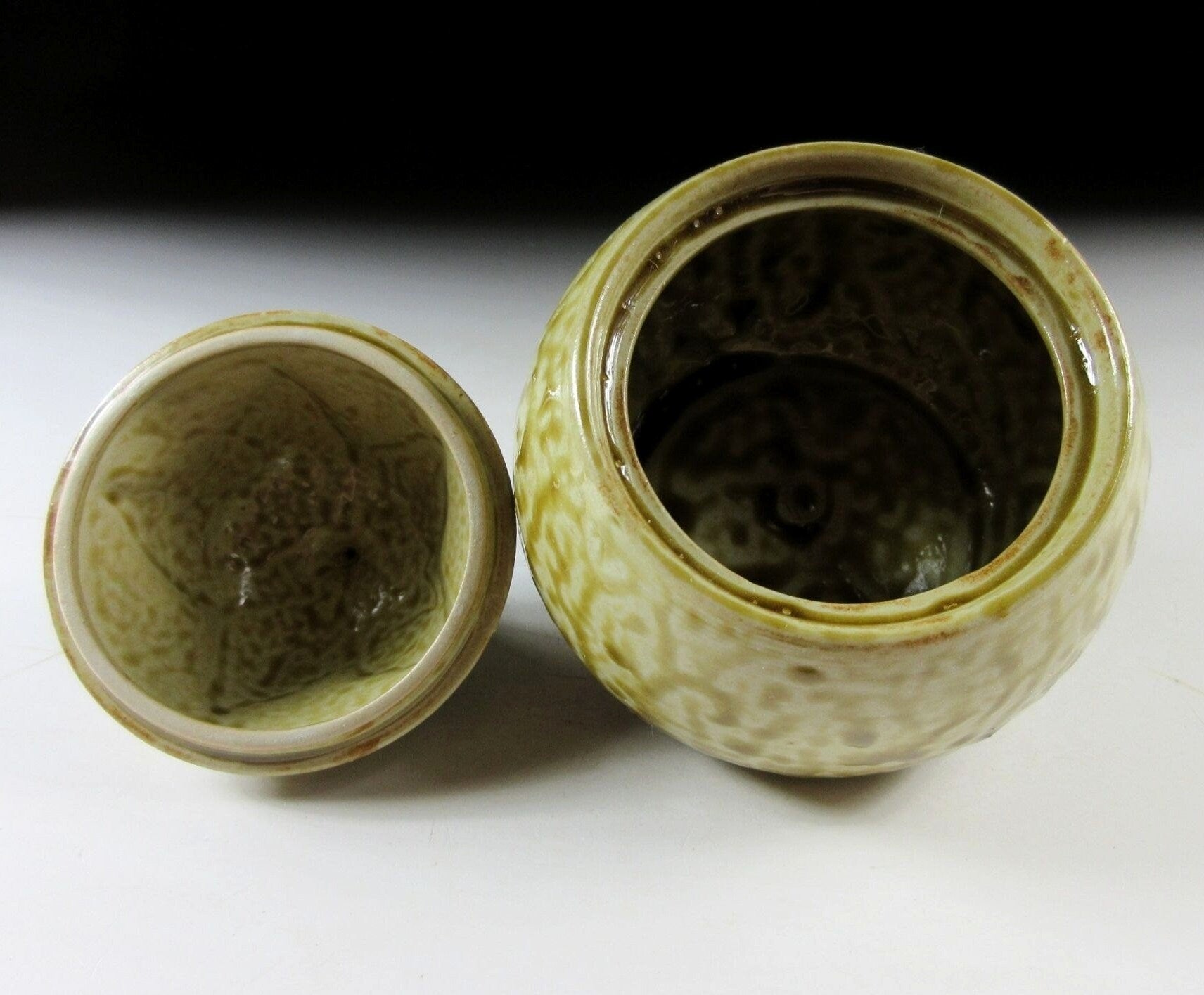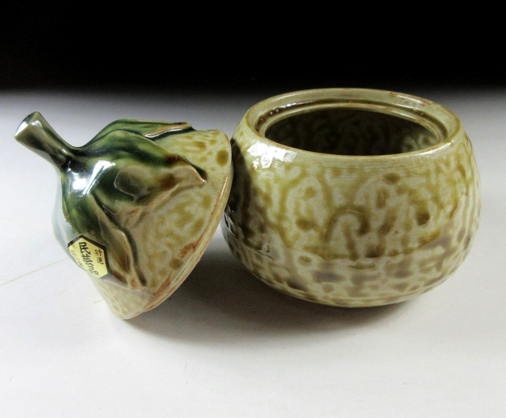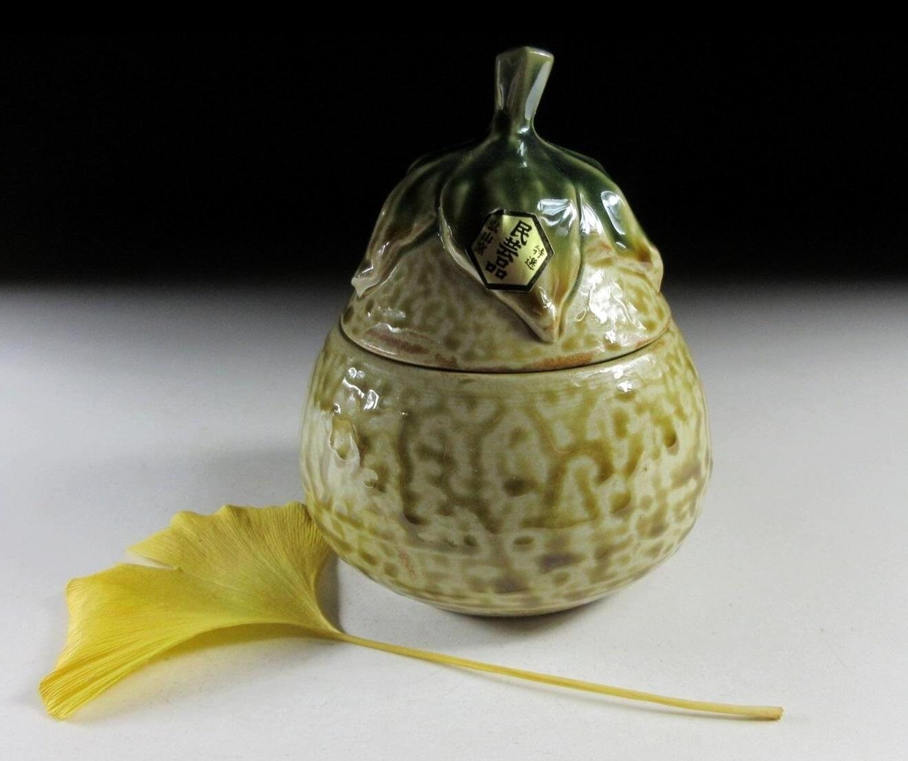 This listing is for a small Mino-ware lidded jar made around 20 years ago by Hiroyama Gama. It is moulded to resemble an eggplant and coated in yellow ki-seto glaze and trimmed with green on top. This piece is ideal for storing tea bags, or may be used as a caddy however please note that it’s not airtight. This piece appears to be completely unused and still has its original removable kiln label on the front.