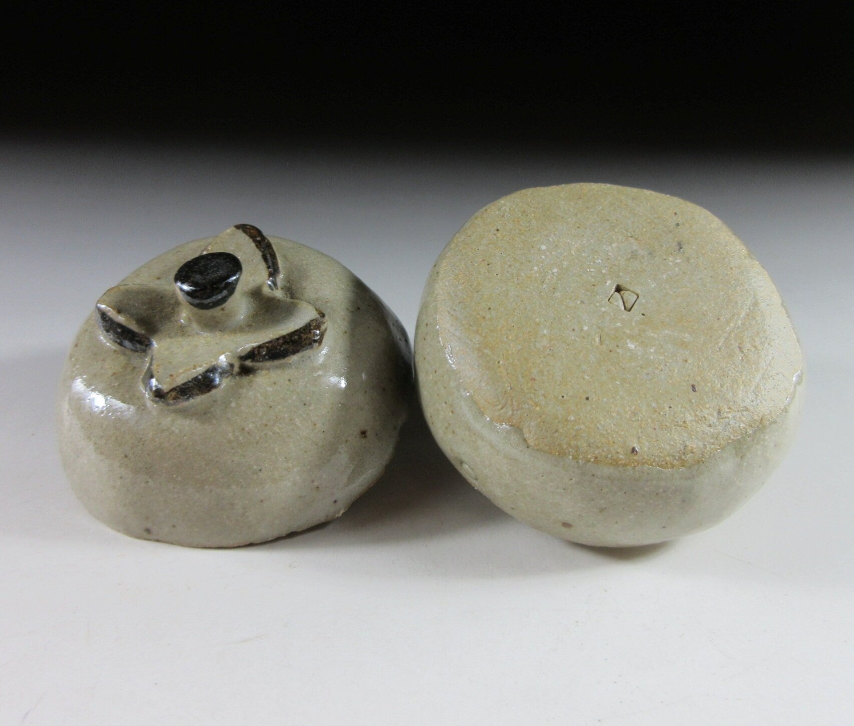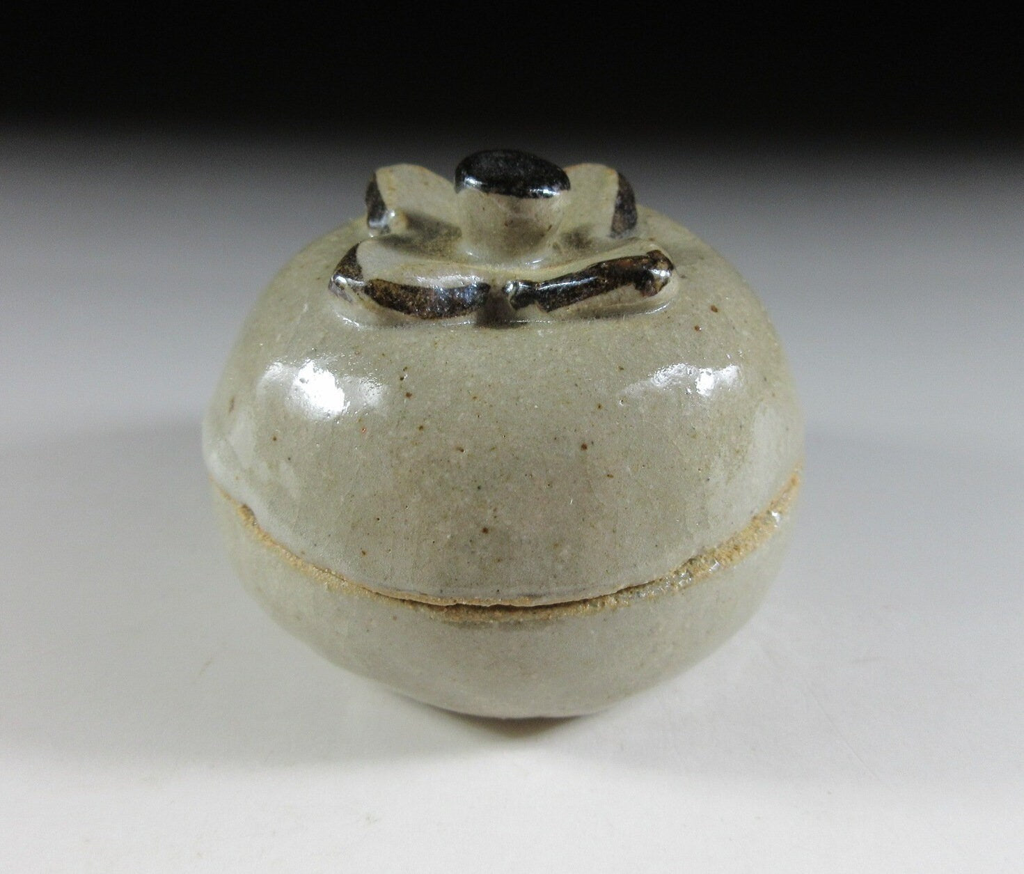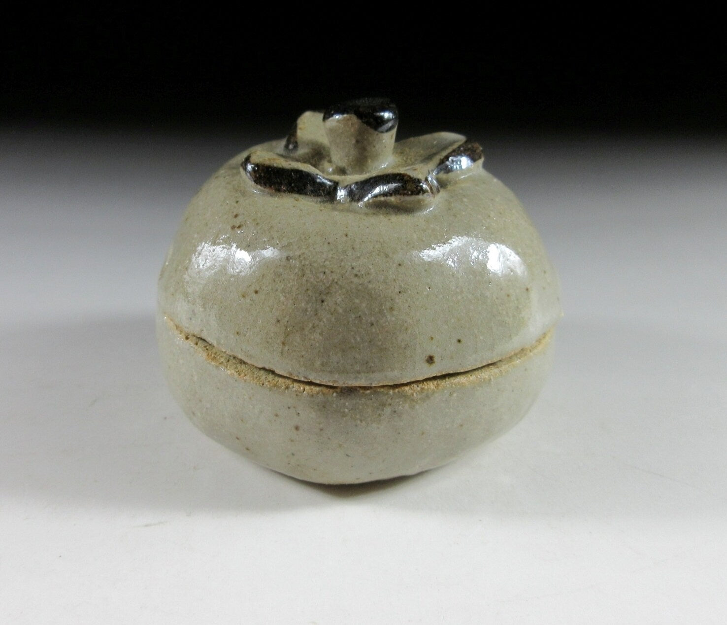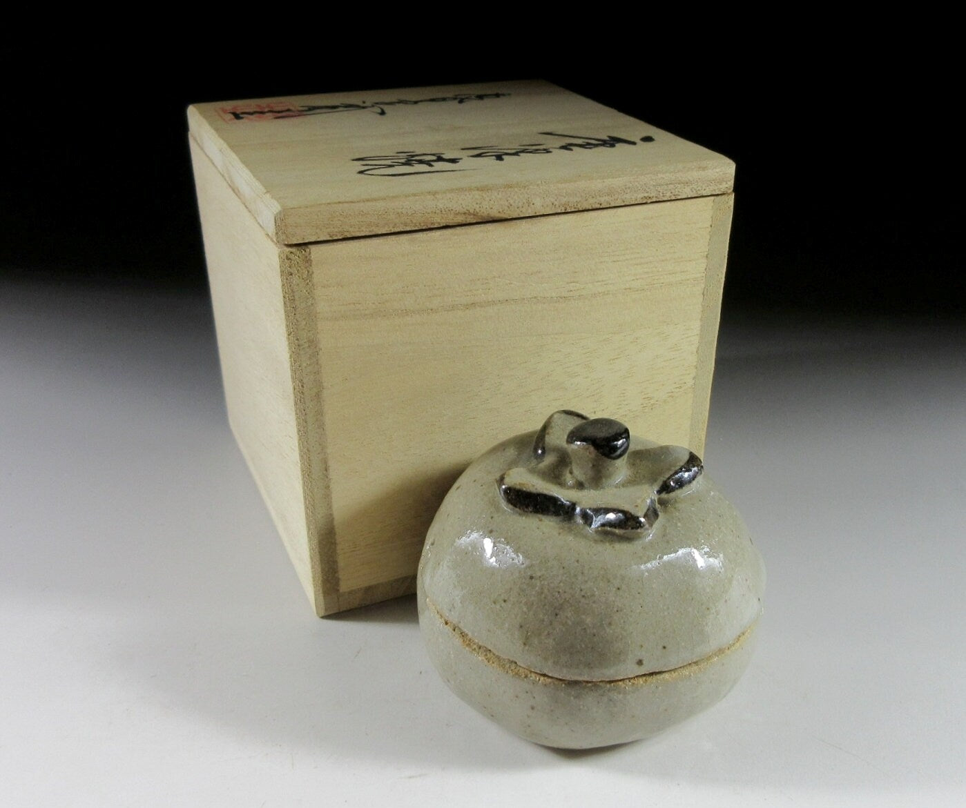 This listing is for a Karatsu-ware kogo made around 20 years ago by Enichi Gama. It is made of high-fired stoneware clay and moulded to resemble a persimmon. Its size and shape is suitable for both woodchip and kneaded incense, although pottery kogo are typically used for kneaded incense during the cooler months. The mark of the kiln can be found on the bottom, and it comes with its original signed wooden storage box.