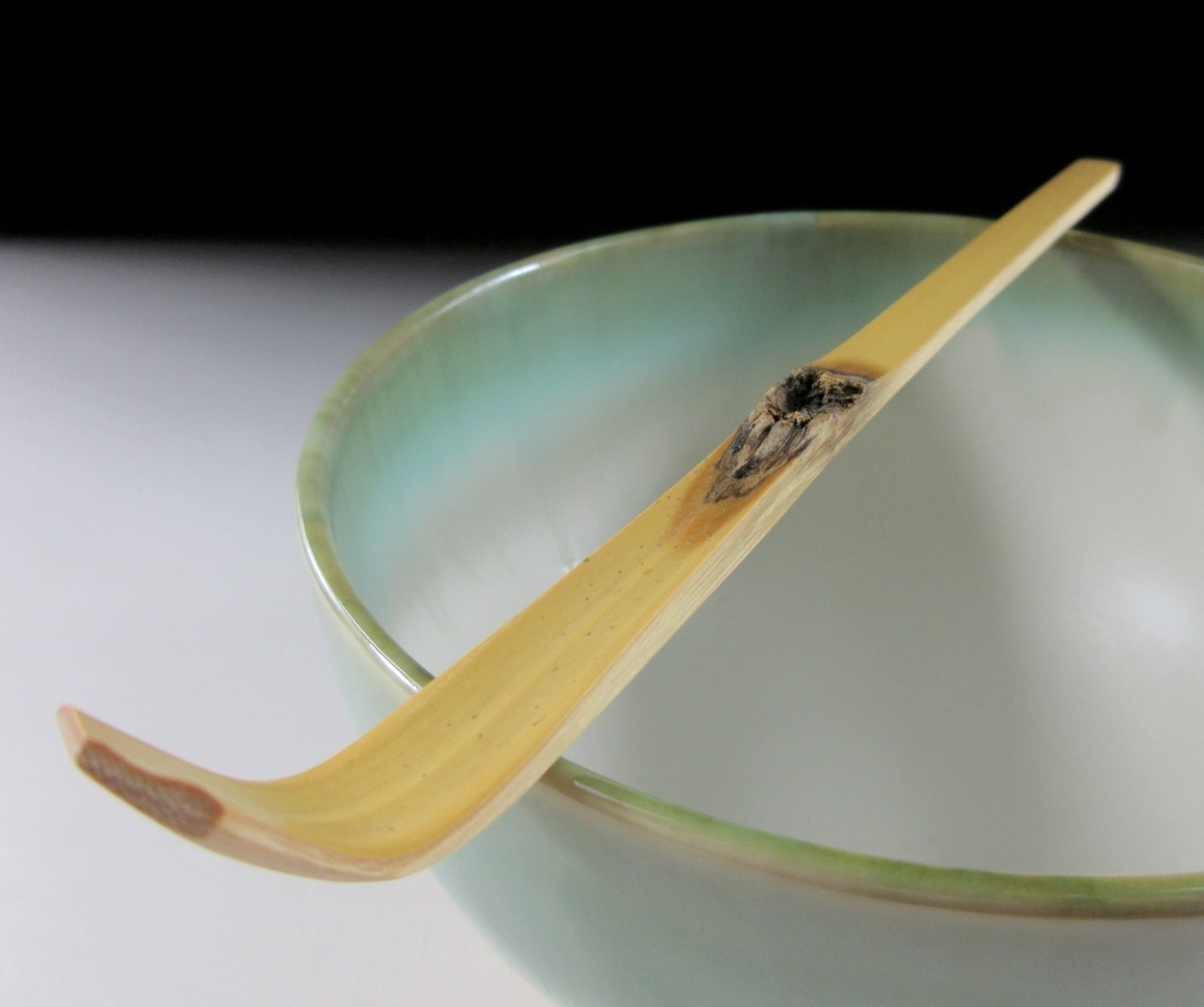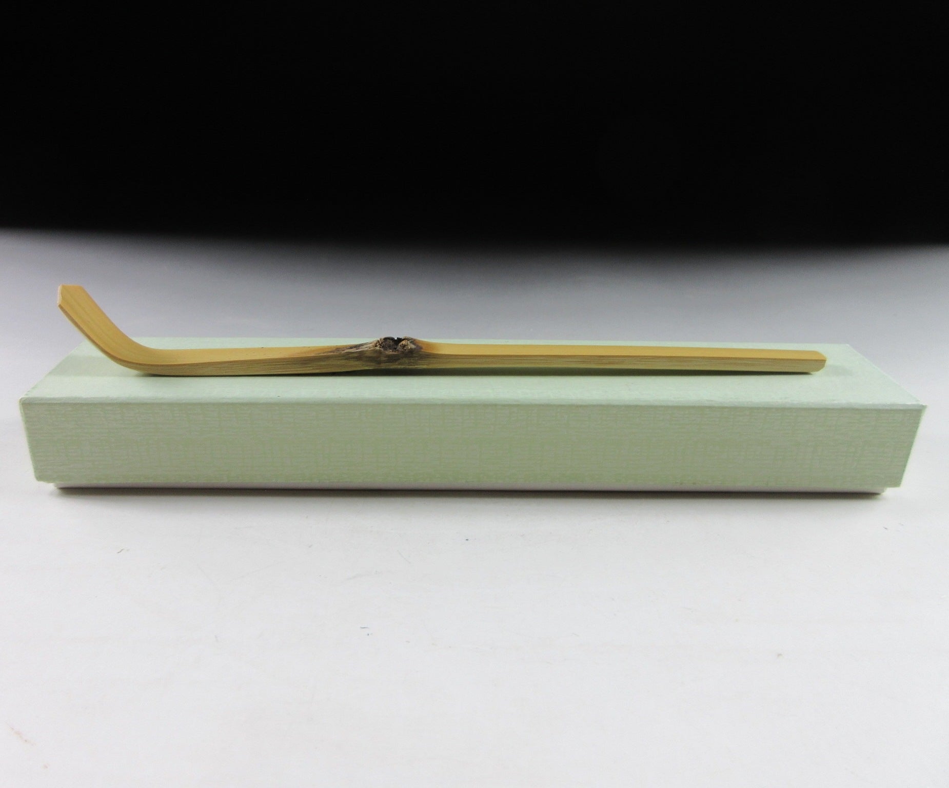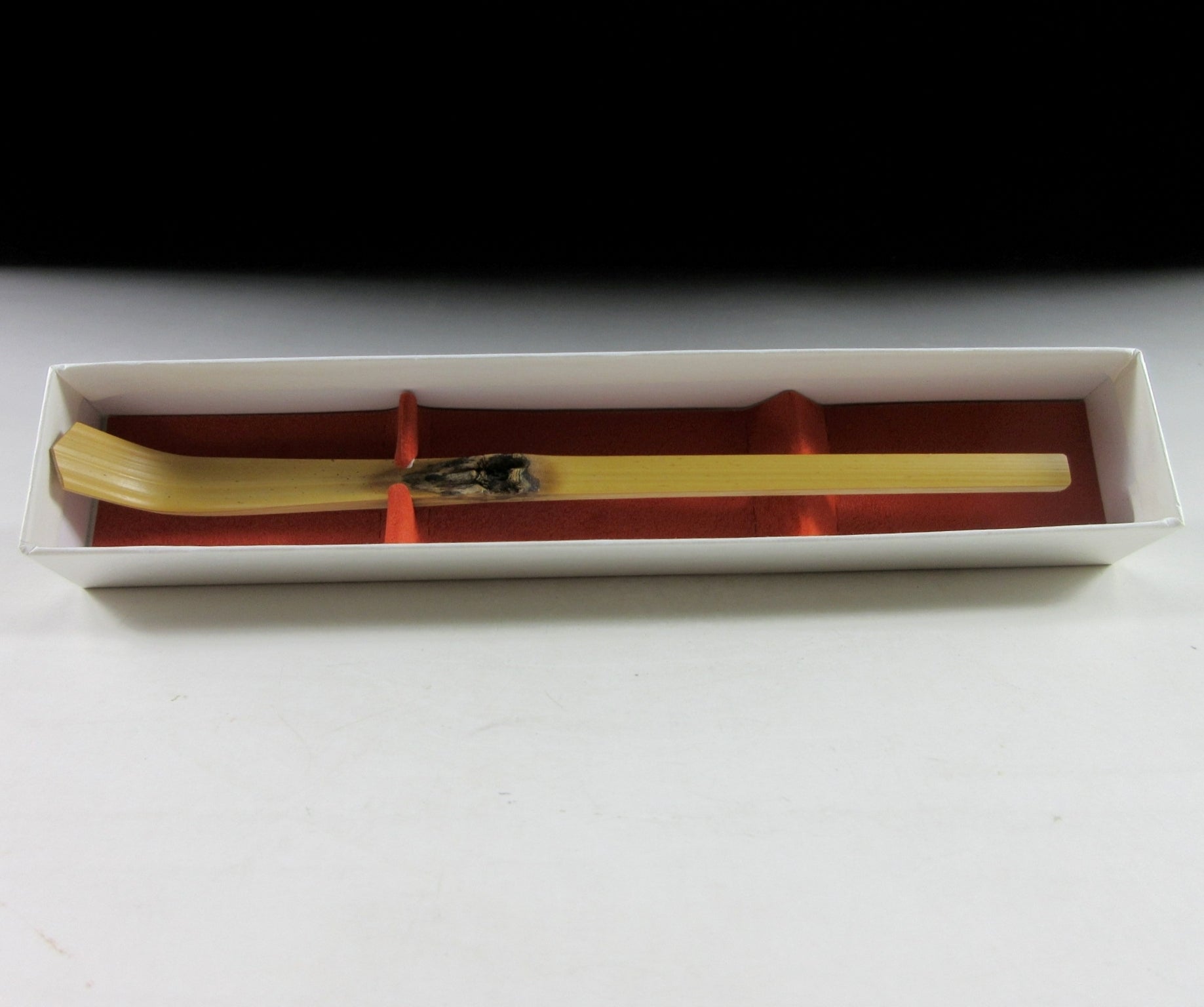 This listing is for a white bamboo ‘Ennosai utsushi’ chashaku. This piece is inspired by the tea scoops made by Ennosai Soshitsu, the 13th head of the Urasenke School of tea. Replicas, or ‘utsushi’ as they’re known, are reinterpretations of art objects from the past. The scoop features a slightly grooved design and includes the natural characteristics of the bamboo as an artistic element. It comes with its original paper storage box with the characters for ‘Ennosai’ printed on the lid. *PLEASE NOTE THAT THE TEA BOWL IS NOT INCLUDED.