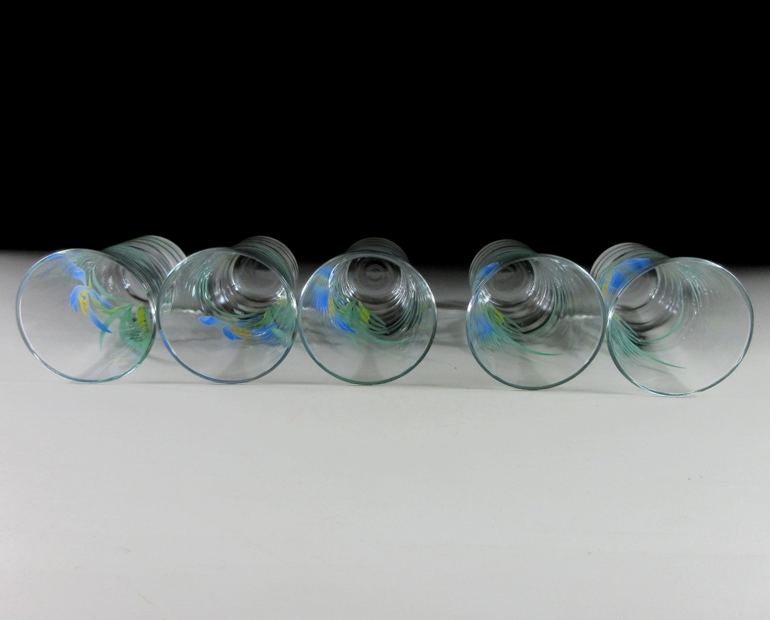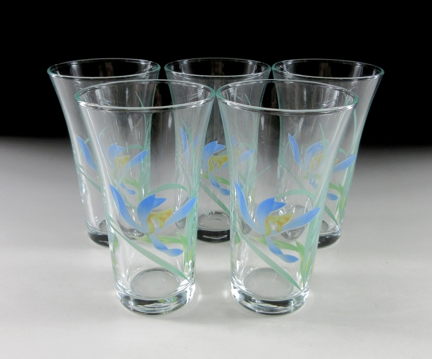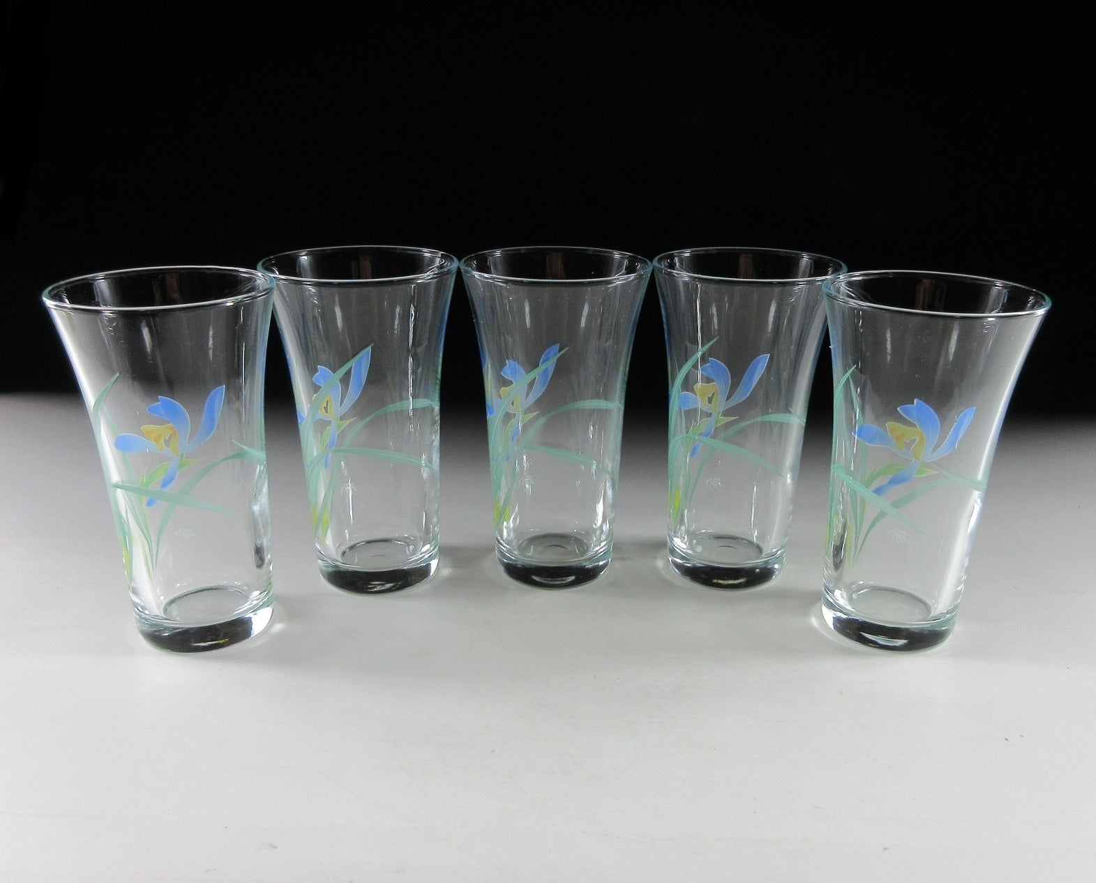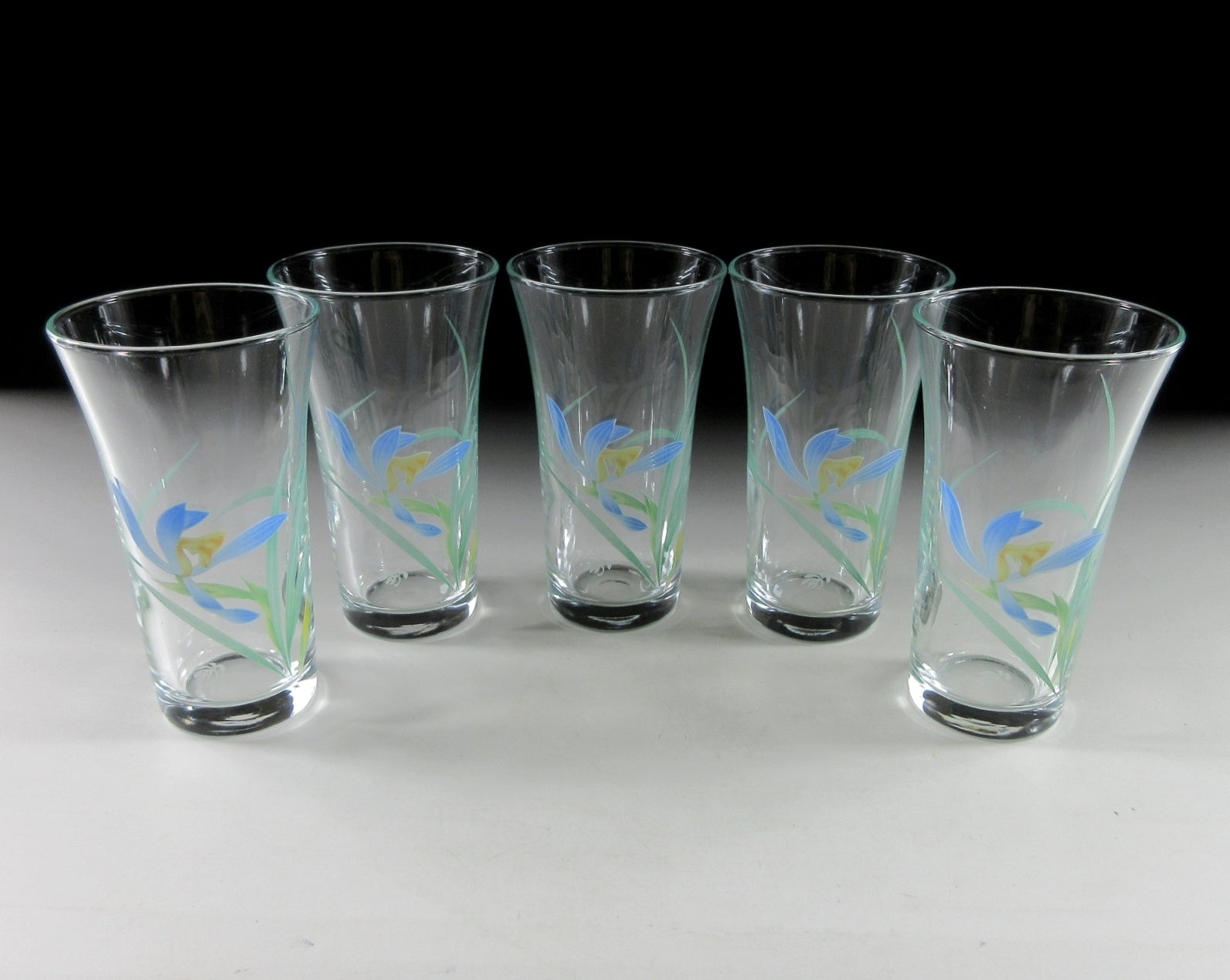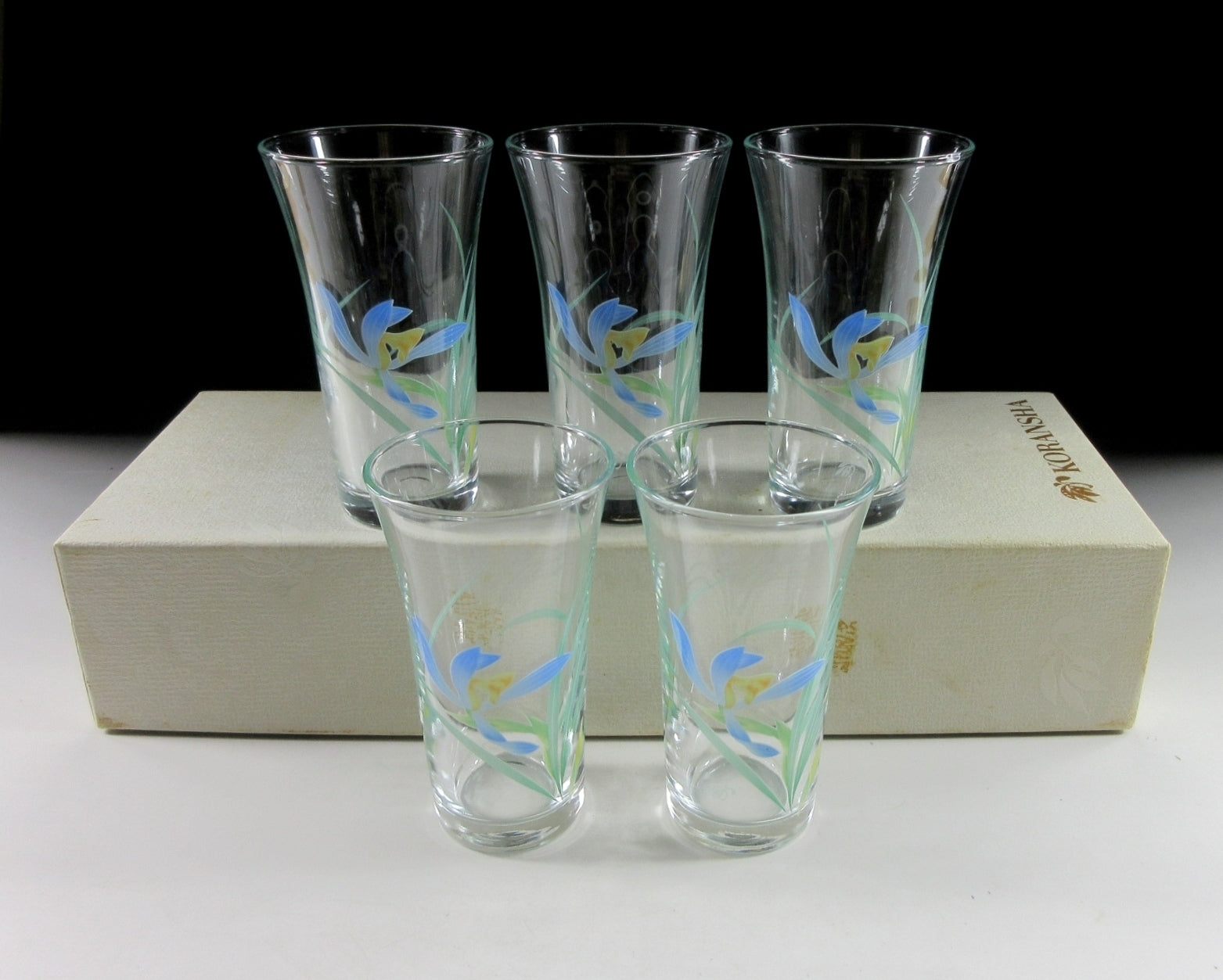 This listing is for a set of five SMALL Koransha brand glasses made around 20-30 years ago. They hold 90ml and the front of each glass is decorated with blue orchids. This is a very beautiful set of glasses for summer and perfect for entertaining guests. The Koransha mark can be found near the base and they come with their original paper storage box.