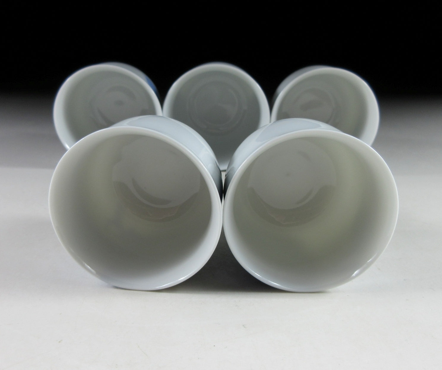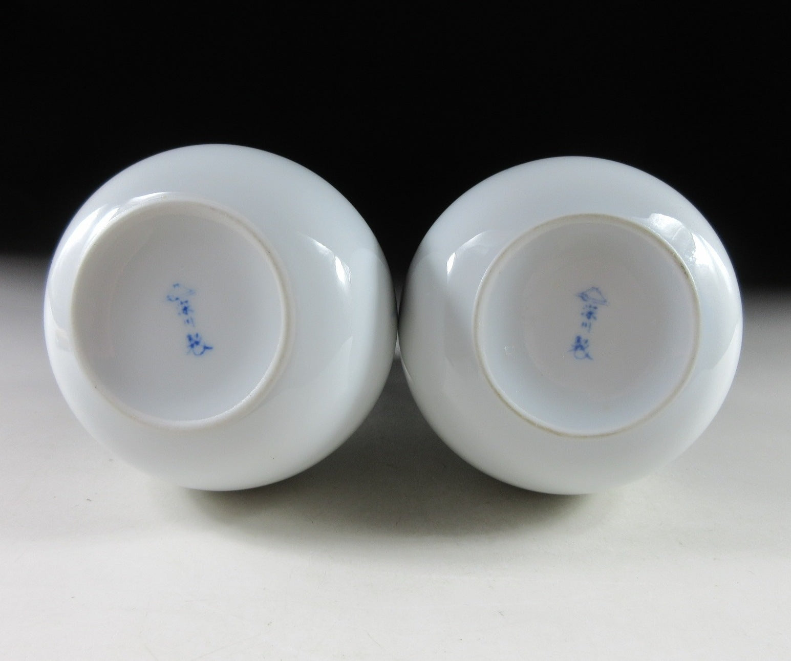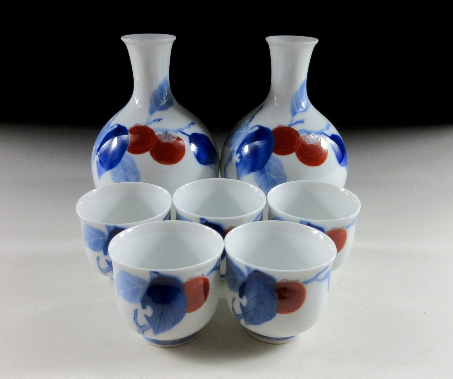 This listing is for a hand-painted Fukagawa porcelain sake set made around 20 years ago. The set consists of two tokkuri and five small cups. The front of each piece is decorated with plump, ripe persimmons over a pristine white porcelain base. Fukagawa are the official purveyors to the Imperial Household Agency so you can be assured that this set is of the highest quality. The blue Fukagawa Mt. Fuji mark can be found on the bottom of each piece, sorry no box for this set.