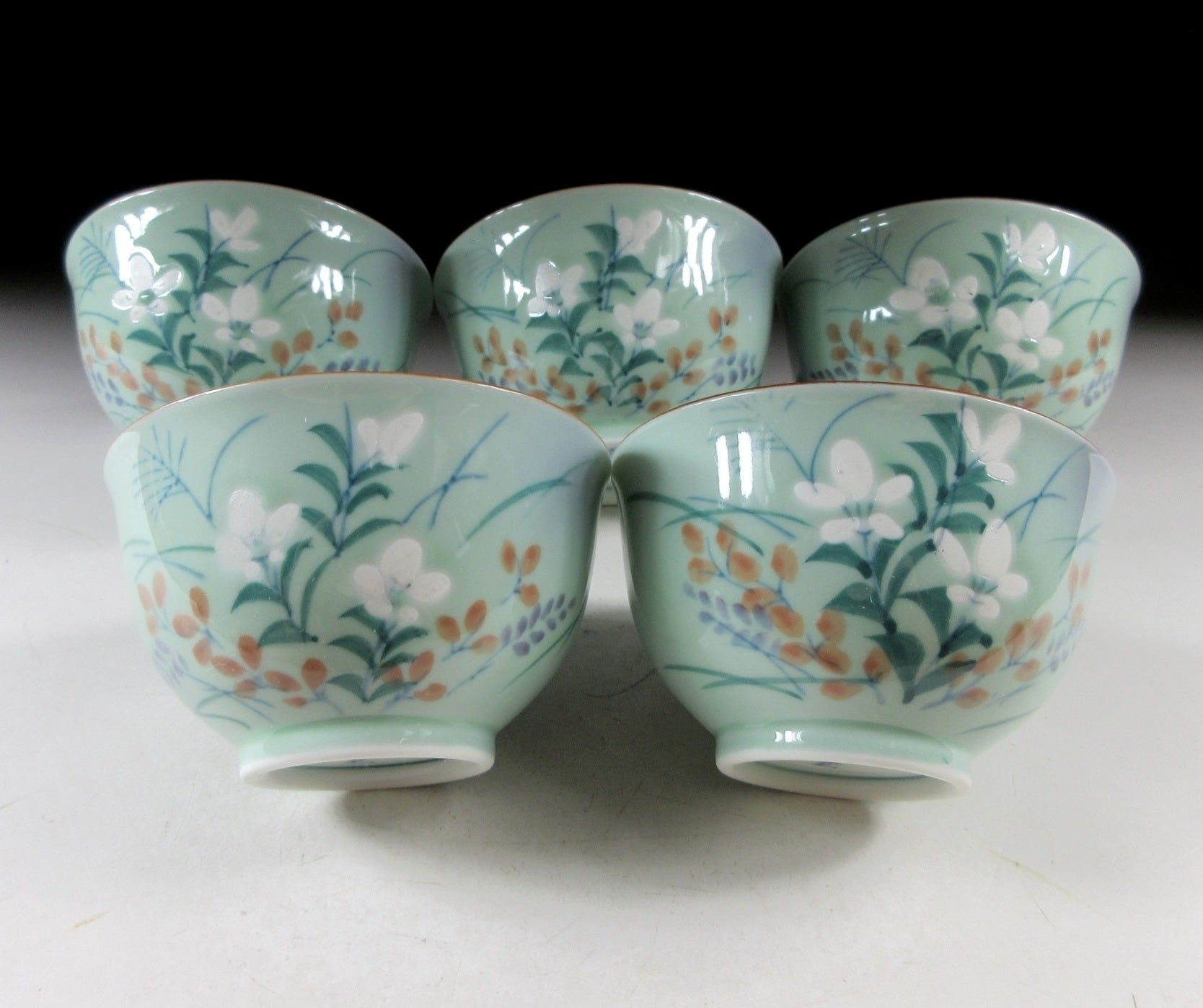 This listing is for a set of five Arita-ware tea cups made around 30 years ago by Fukko Gama. They are made of wheel-thrown porcelain and are decorated with white bellflowers, pampas grass and bush clover. Each of these plants has the honour of being one of the seven flowers of autumn. The seven flowers of autumn are bush clover, pampas grass, kudzu, dianthus, golden lace, hemp agrimony, and the Japanese bellflower. These seasonal favourites have been popular since the latter half of the eighth century after a collection of waka poems known as Manyo-shu was compiled by a poet named Yamanoue-no-Okura. Since then these flowers have been frequently portrayed in paintings, poetry, literature, pottery, lacquerware, carvings and textiles. These cups are intended for serving sencha, and are suitable for daily use. The signature of the potter can be found on the bottom of each cup, and they come with their original signed wooden storage box.