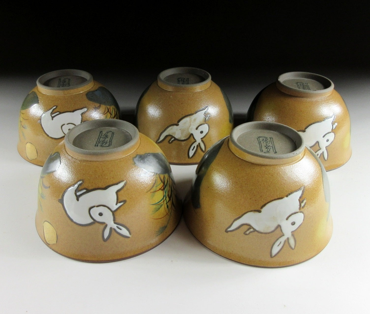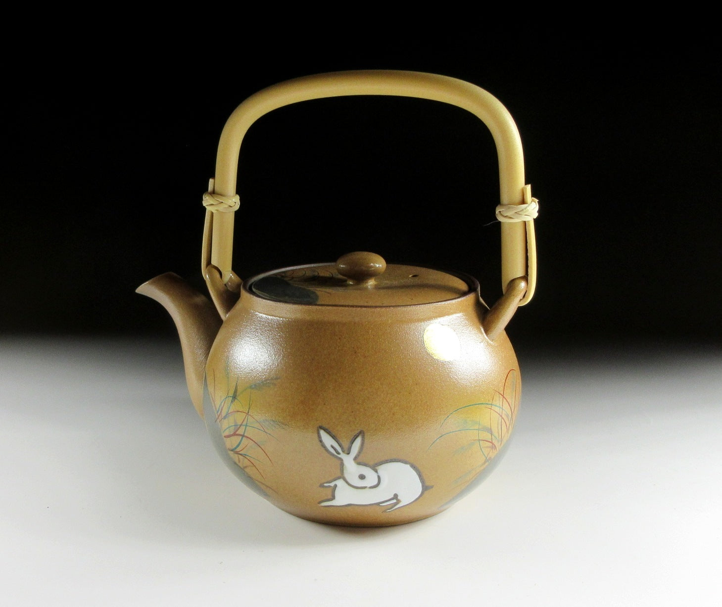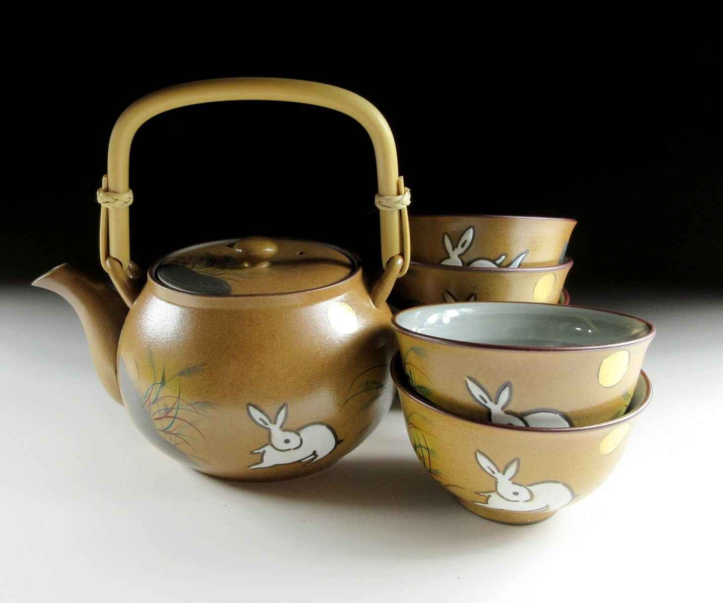 This listing is for a delightful Arita-ware tea set made around 20 years ago by Fukko Gama. The set consists of a 500ml teapot and five matching tea cups. Each piece is wheel-thrown and decorated with rabbits frolicking amongst pampas grass during a golden harvest moon. The exterior is glazed golden brown, and the interior of the cups have been brushed with white slip. The signature of the kiln can be found on the bottom of each piece, or under the lid in the case of the teapot. Sorry no box for this set.