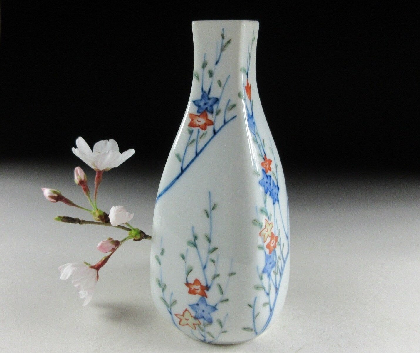 This listing is for a small Arita-ware vase made around 20-30 years ago by Gen-emon Gama. It is made or porcelain and decorated with hand-painted depictions of red and blue bellflowers over a white porcelain base. The opening is wide enough to accommodate a few thin-stemmed flowers, and the Gen-emon signature can be found on the bottom.