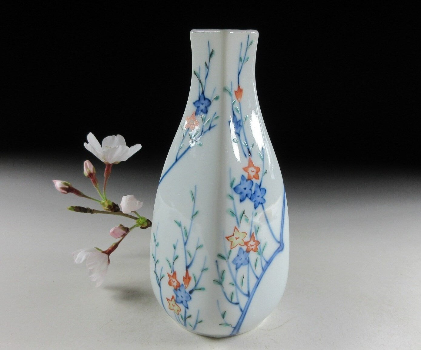 This listing is for a small Arita-ware vase made around 20-30 years ago by Gen-emon Gama. It is made or porcelain and decorated with hand-painted depictions of red and blue bellflowers over a white porcelain base. The opening is wide enough to accommodate a few thin-stemmed flowers, and the Gen-emon signature can be found on the bottom.