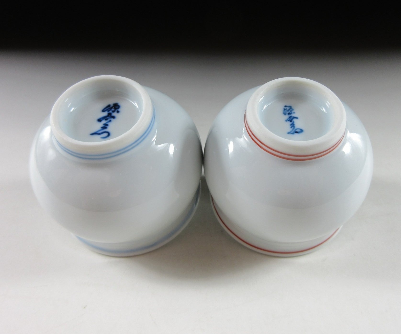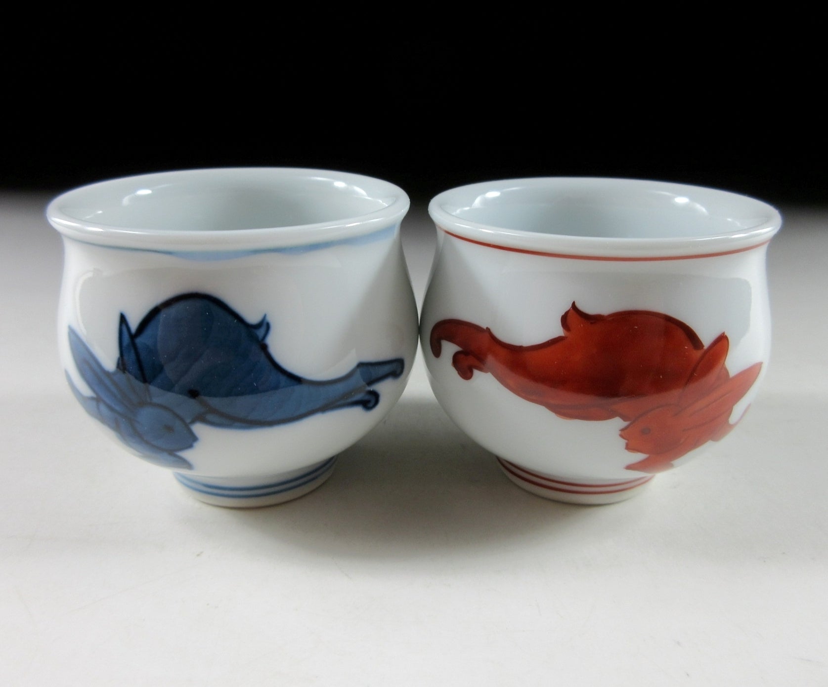 This listing is for a pair of hand-painted Arita-ware sake cups made by the prestigious Gen-emon kiln. They are made of porcelain and are decorated with hand-painted depictions of blue and red rabbits over a white porcelain background. The cups are small in size and were most likely made to commemorate the Year of the Rabbit back in 1999. The signature of the kiln can be found on the bottom of each cup, and they come with their original signed wooden storage box. They also come with Japanese language profile papers about Gen-emon kiln and the history of Arita-ware.