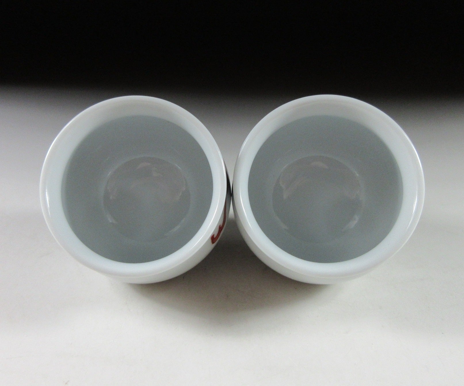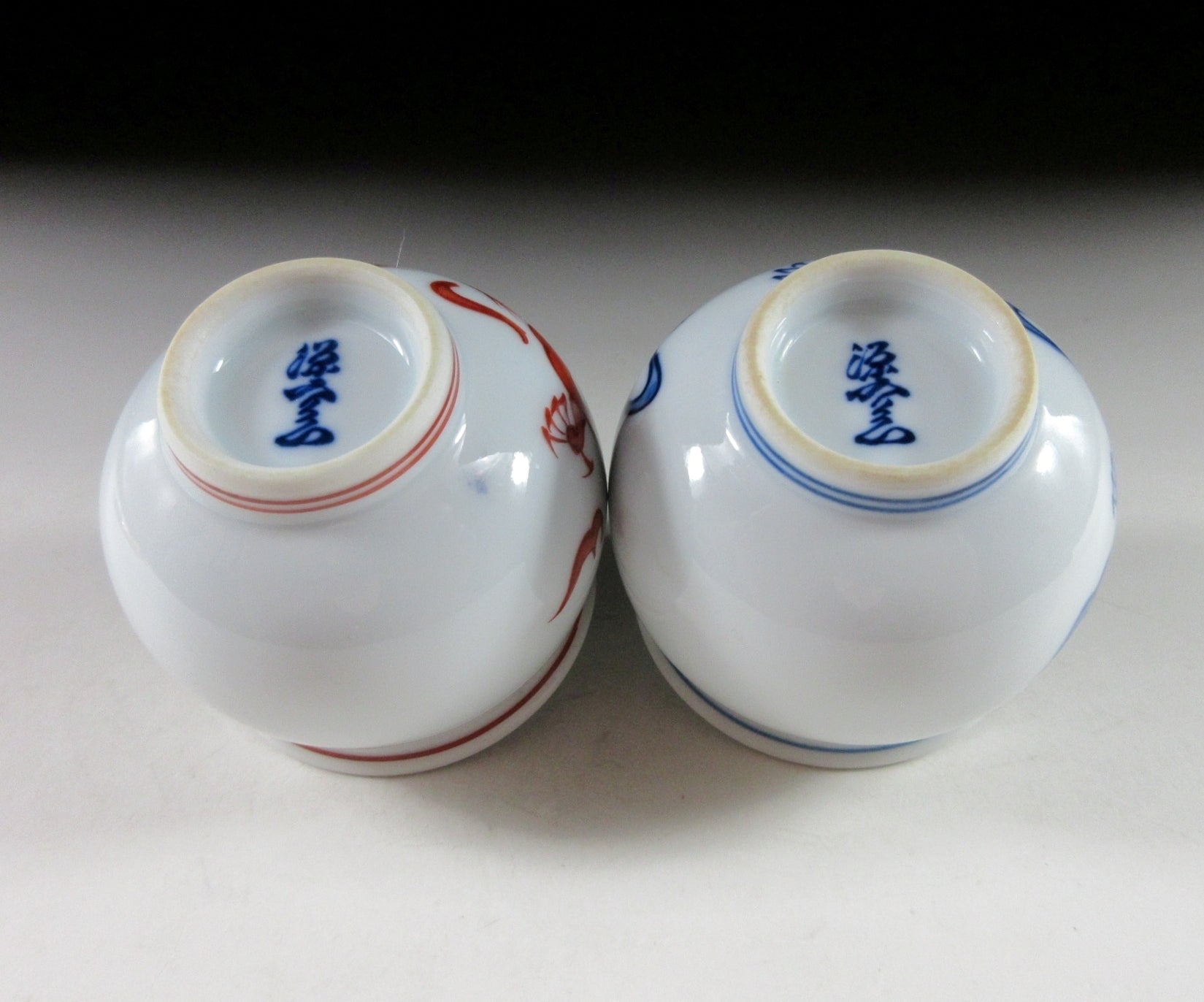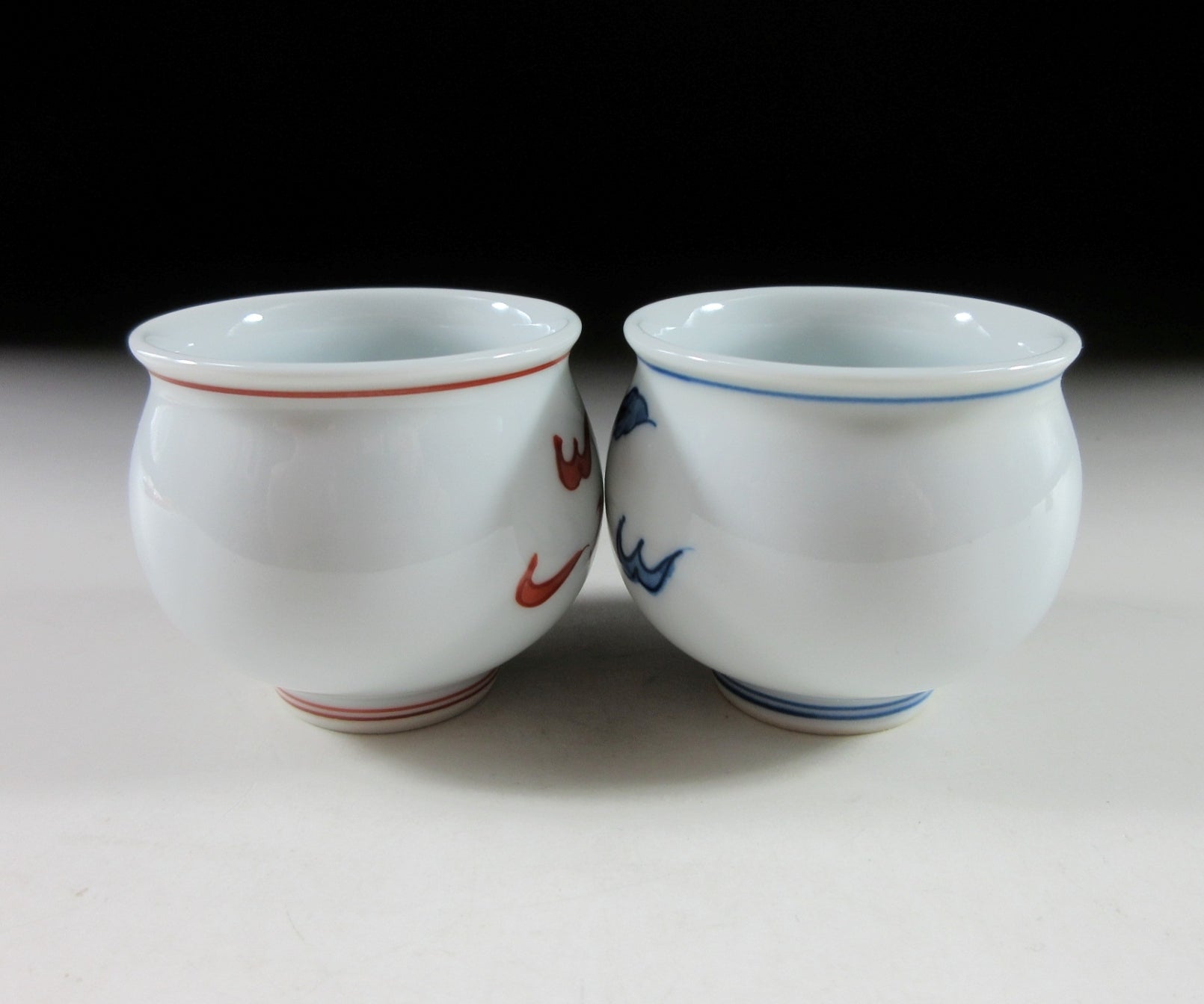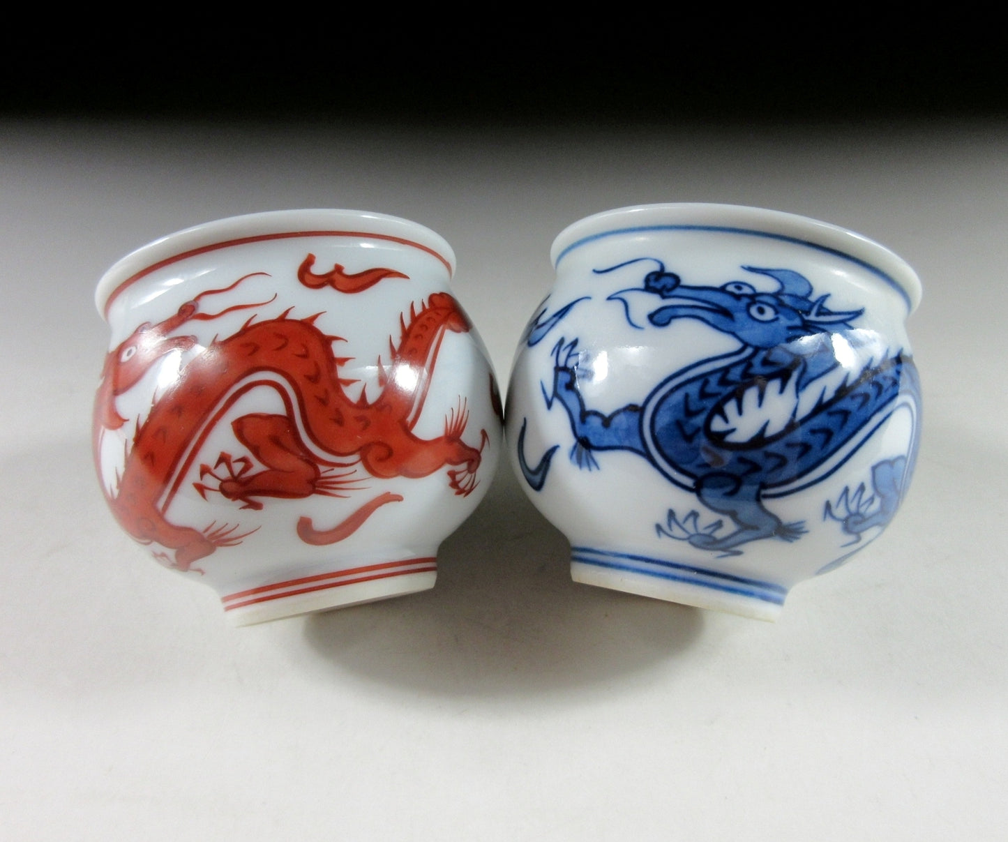 This listing is for a pair of hand-painted Arita-ware sake cups made by the prestigious Gen-emon kiln. They are made of porcelain and are decorated with hand-painted depictions of blue and red dragons over a white porcelain background. The cups are small in size and were most likely made to commemorate the Year of the Dragon back in 2012. The signature of the kiln can be found on the bottom of each cup, and they come with their original signed wooden storage box. They also come with two Japanese language profile papers about Gen-emon kiln and the history of Arita-ware.
