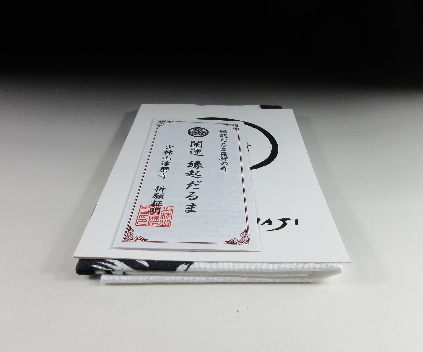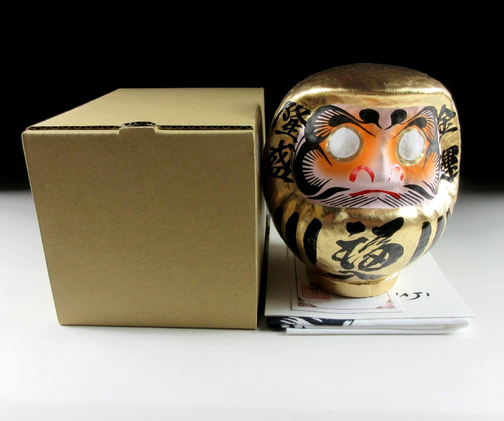 This listing is for a Takasaki Shorinzan Fuku-Daruma. Daruma is a popular talisman of good luck, especially during New Year. When a Daruma is purchased, the owner paints a pupil on the left eye while making a wish. Once the wish is realised the right pupil is added, and then the Daruma is taken to the local temple to be burned during a special ceremony. The English expression “having both eyes open” conveys Japan’s thoughts about success and wholeness. The Daruma in this listing is gold and made of papier-mâché. Gold and silver Daruma are thought to bring the owner much wealth and prosperity. The kanji on the left side says ‘ryusei’, which means prosperity, and the kanji on the right says Daruma. This particular Daruma comes with a plain paper storage box, a Daruma tenugui, an ‘engi Daruma’ paper (engi means auspicious, and this paper is a blessing from the temple), as well as an English language booklet about Shorinzan Fuku-Daruma.