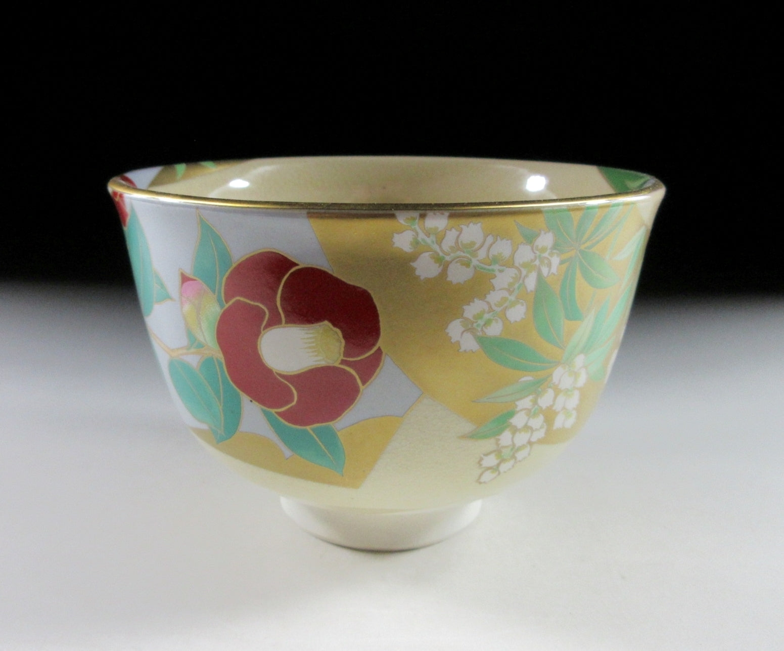 This listing is for a beautiful Kiyomizu-ware chawan made around 20 years ago. It is wheel thrown and decorated with an original illustration by Japanese female painter, Kuwano Mutsuko. This seasonal design features red tsubaki flowers, and it’s from the ‘Gosho no Hana’ series depicting twelve months of flowers growing in the Kyoto Imperial Palace Garden. This particular bowl represents the month of March from the series. Japanese tsubaki are often linked to samurai, and were traditionally thought to symbolise bravery and strength against all odds. The stamp of Kuwano and the kiln can be found on the bottom. *PLEASE NOTE THAT THE CHASEN TEA WHISK IS NOT INCLUDED IN THIS LISTING.