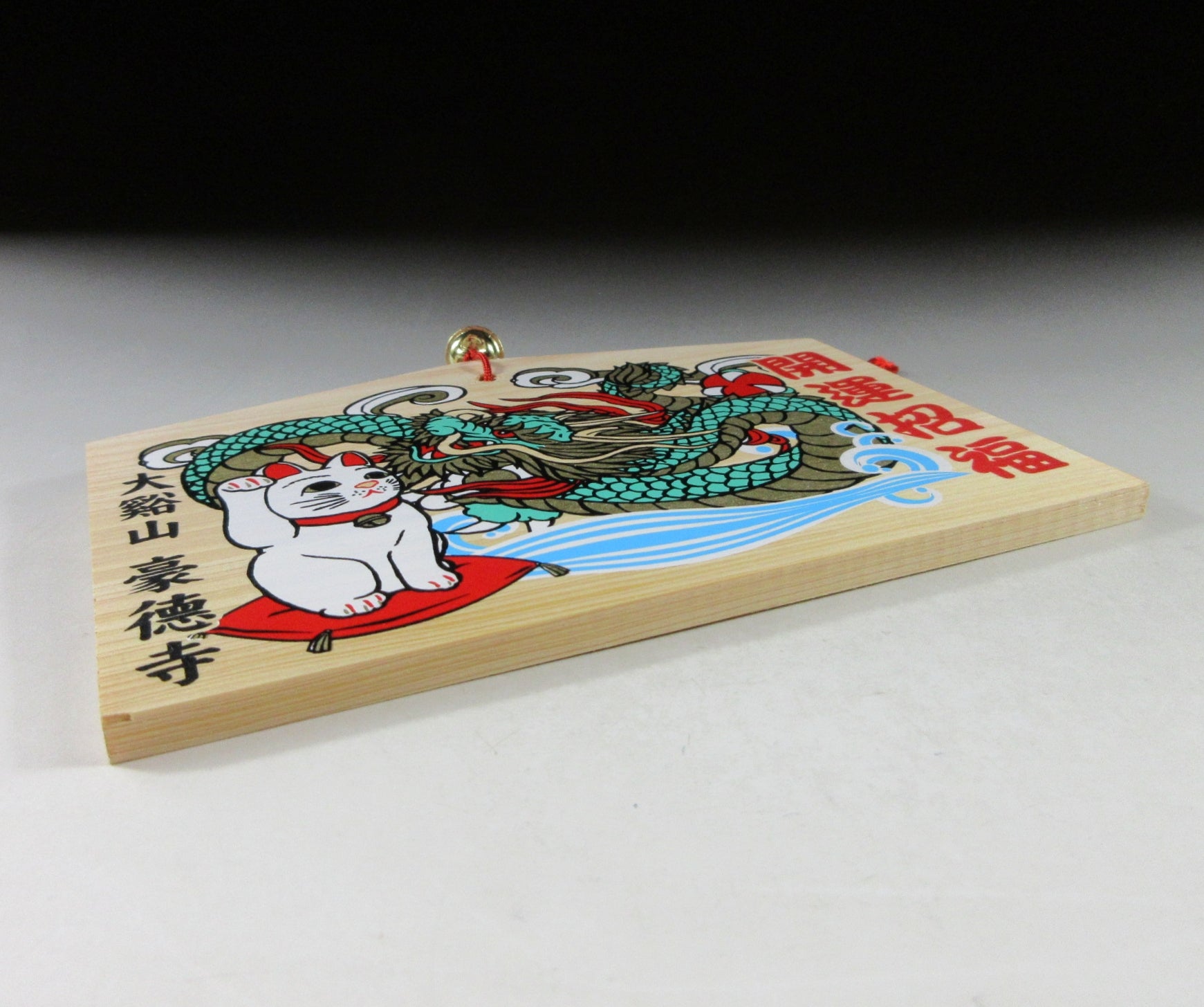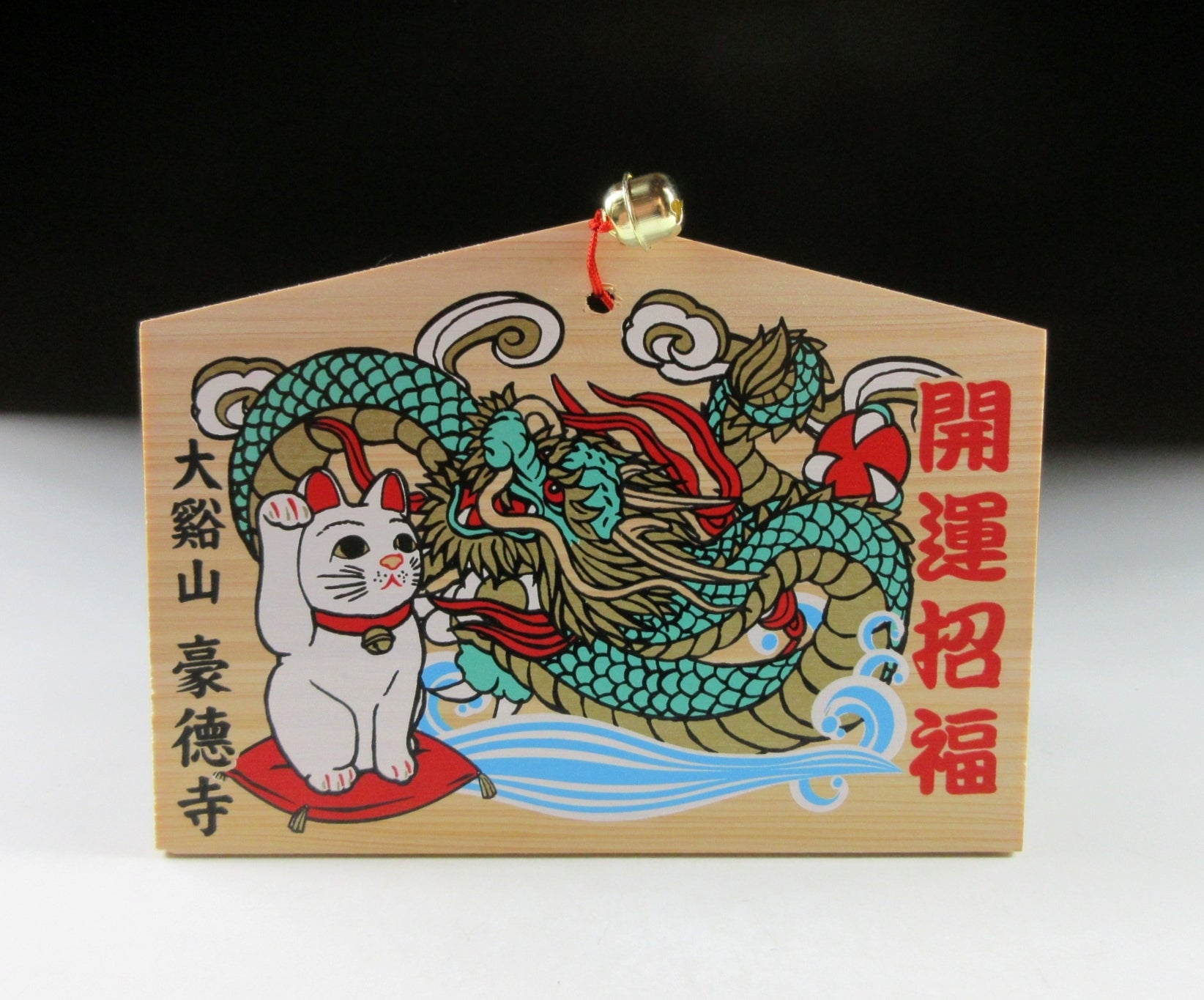 This listing is for a wooden ema from Gotokuji Temple in Tokyo. Gotokuji is a Buddhist temple and said to be the birthplace of maneki neko. They sell cats with both the left and right paw raised, however Gotokuji specialises in the raw pawed version like the cat on the ema. This ema is to commemorate the Year of the Dragon.