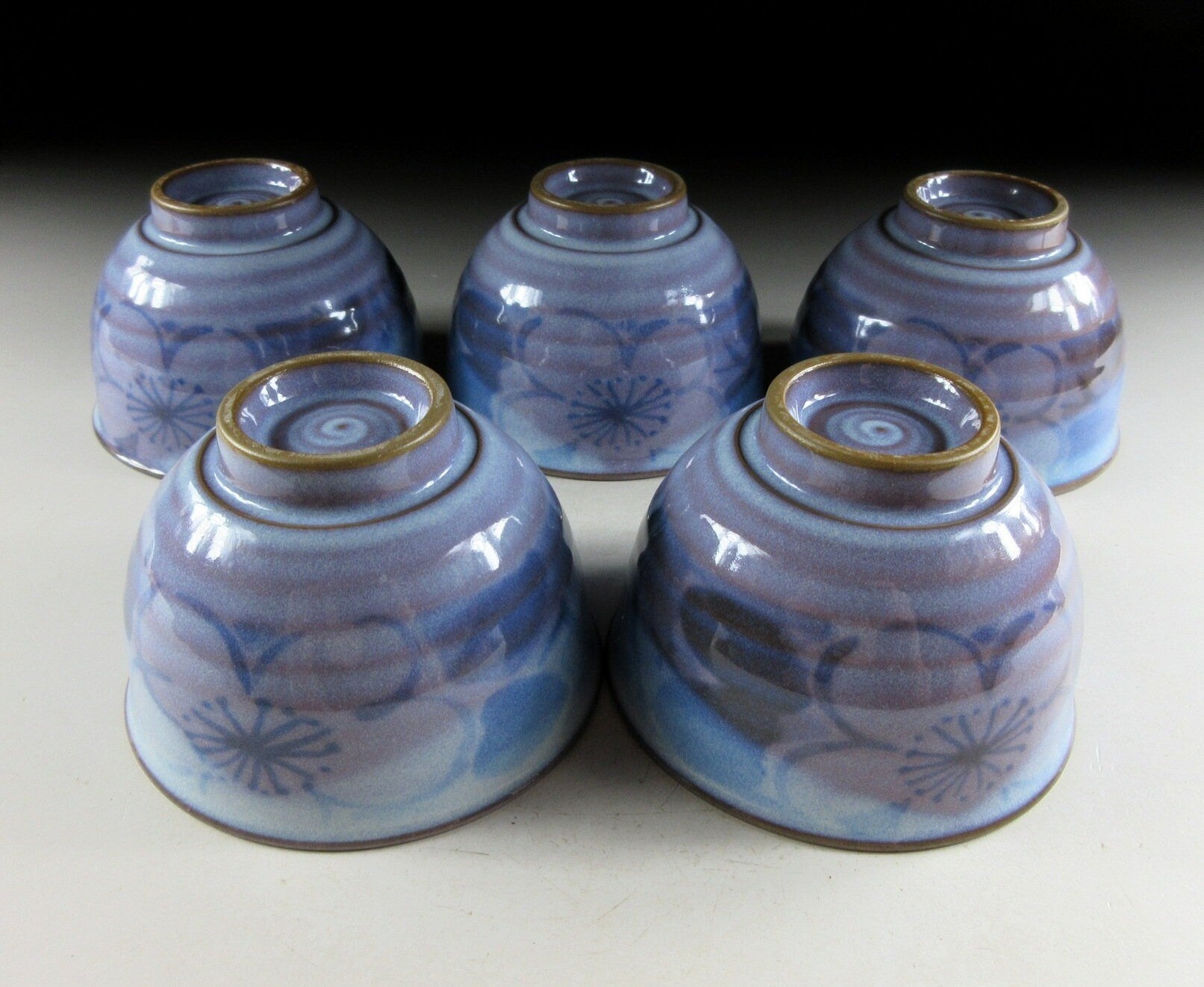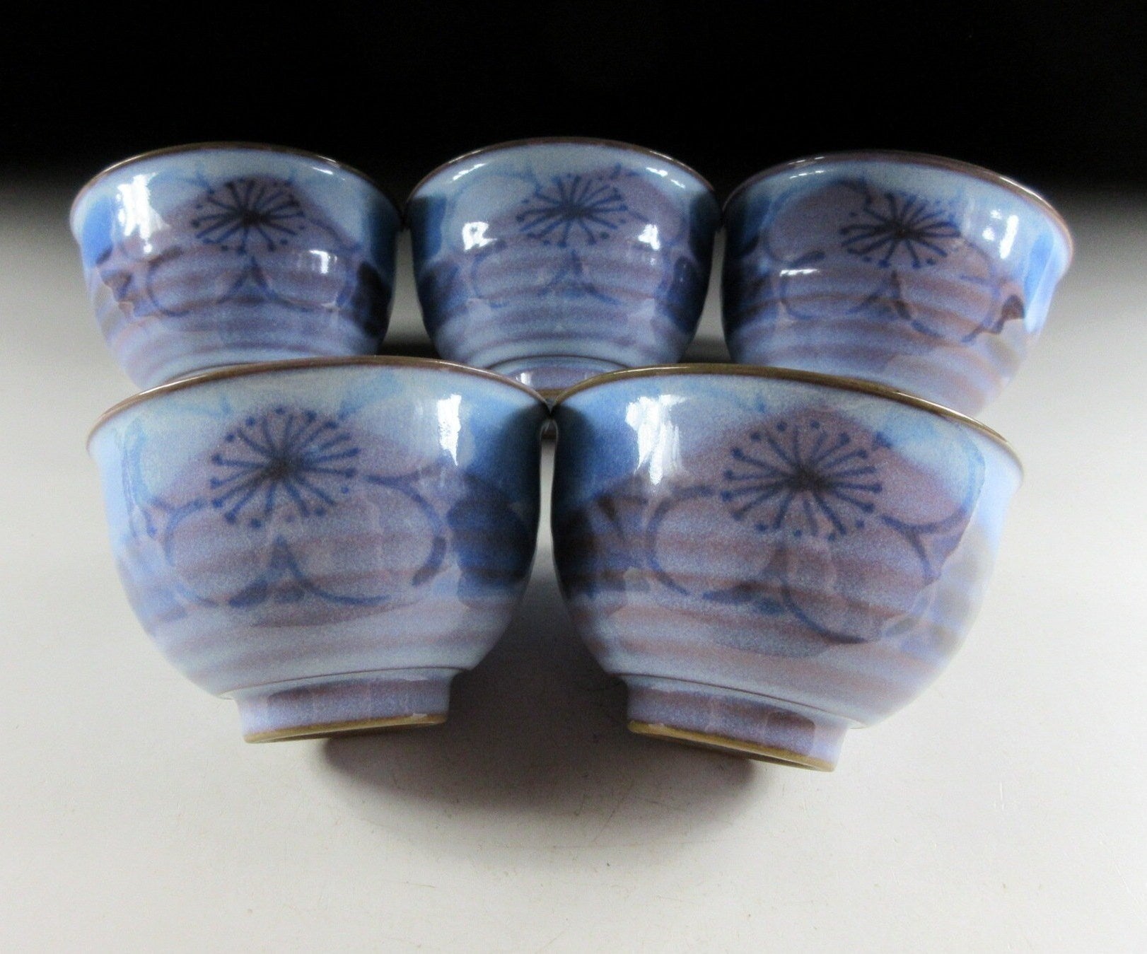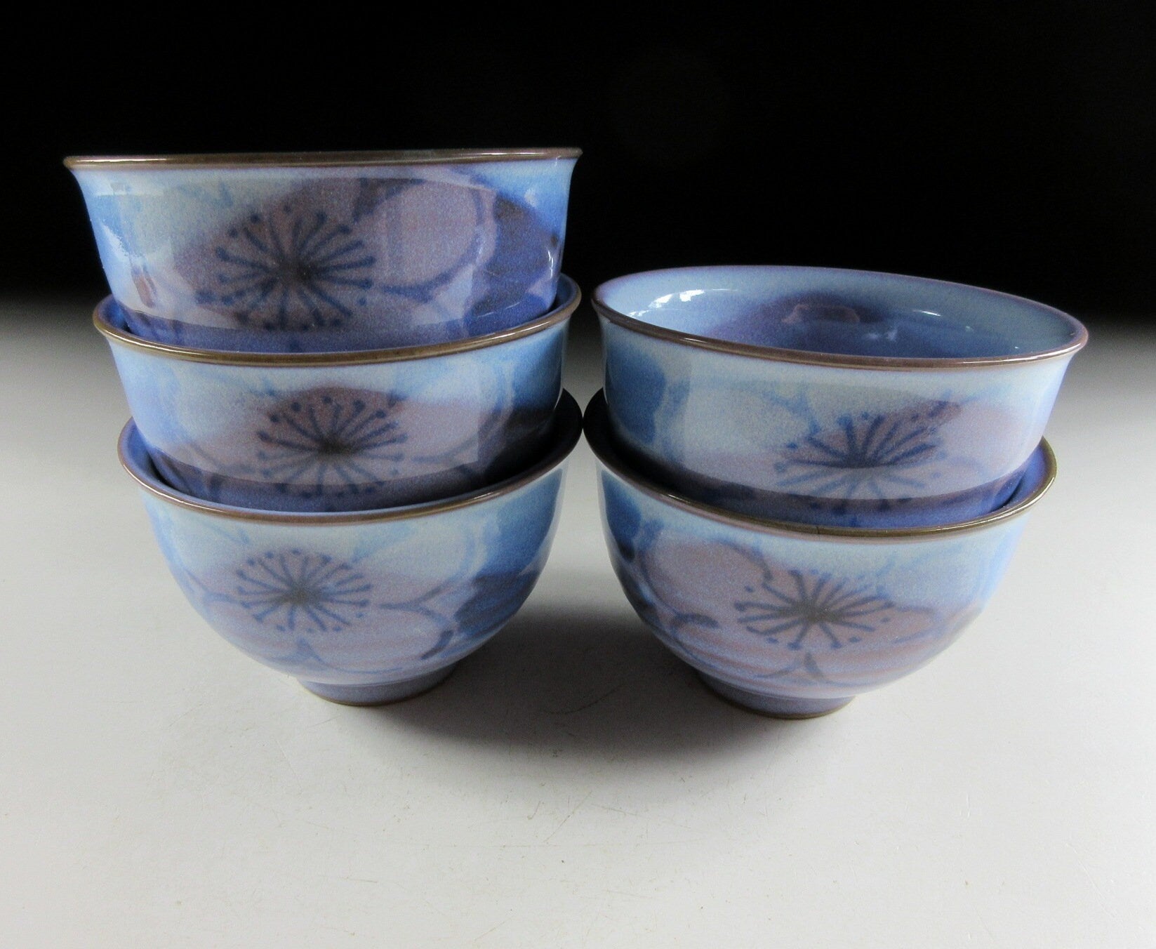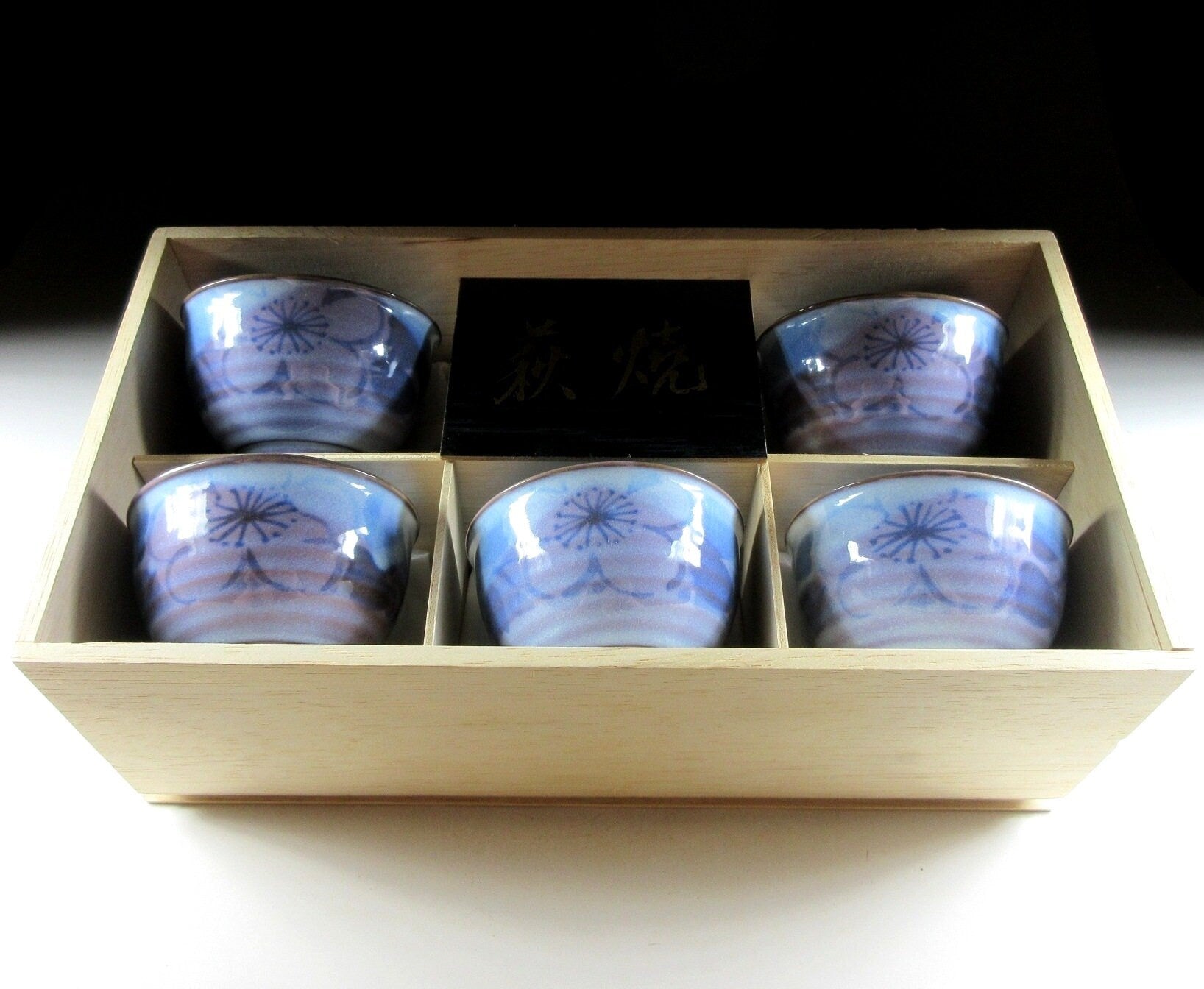 This listing is for a set of five Hagi-ware tea cups made around 20 years ago. They are wheel-thrown coated in two shades of transparent glaze over a high fired stoneware base. The front of each cup is decorated with a hand-painted depiction of an ume blossom, and these cups are ideally suited to serving sencha. The set appears unused and comes with its original stamped wooden storage box.