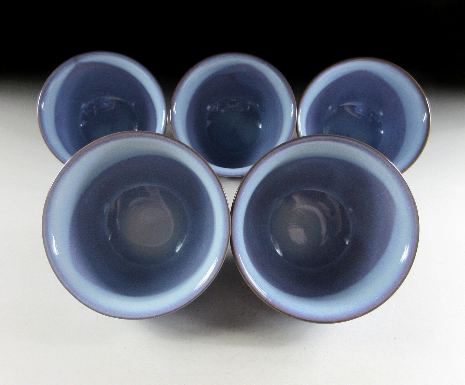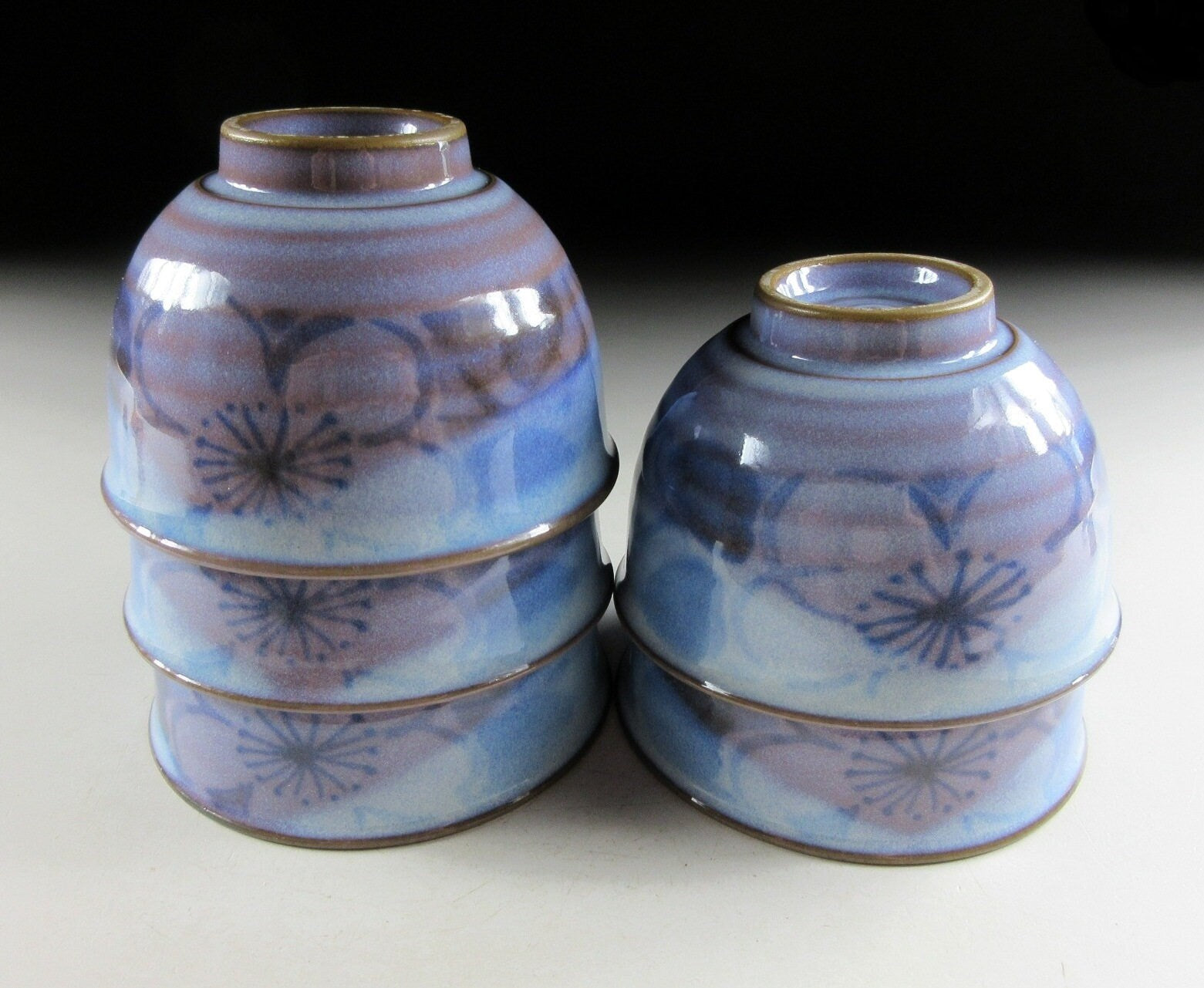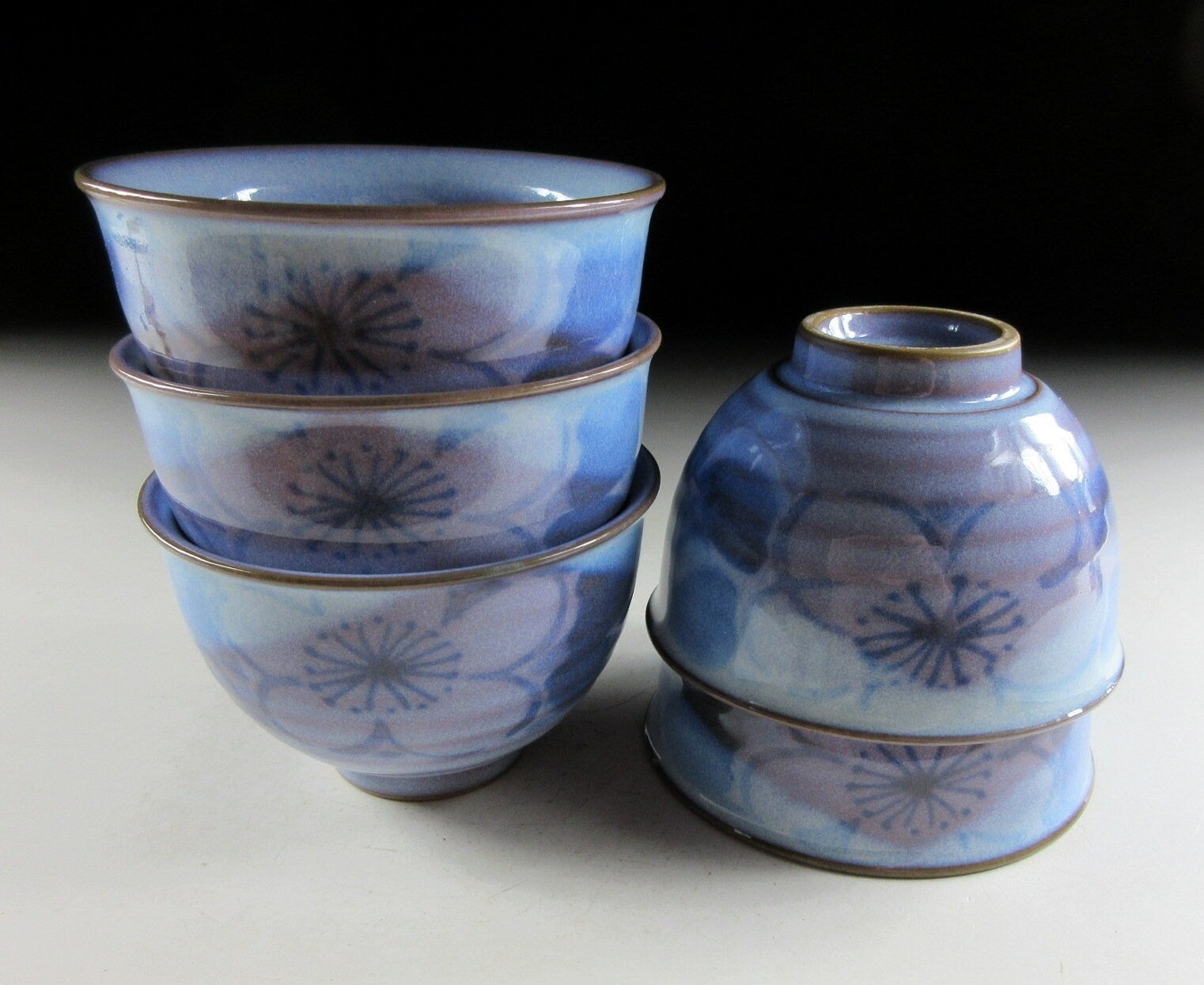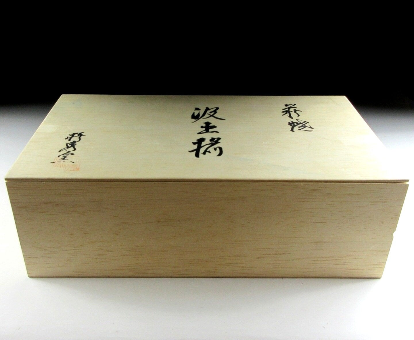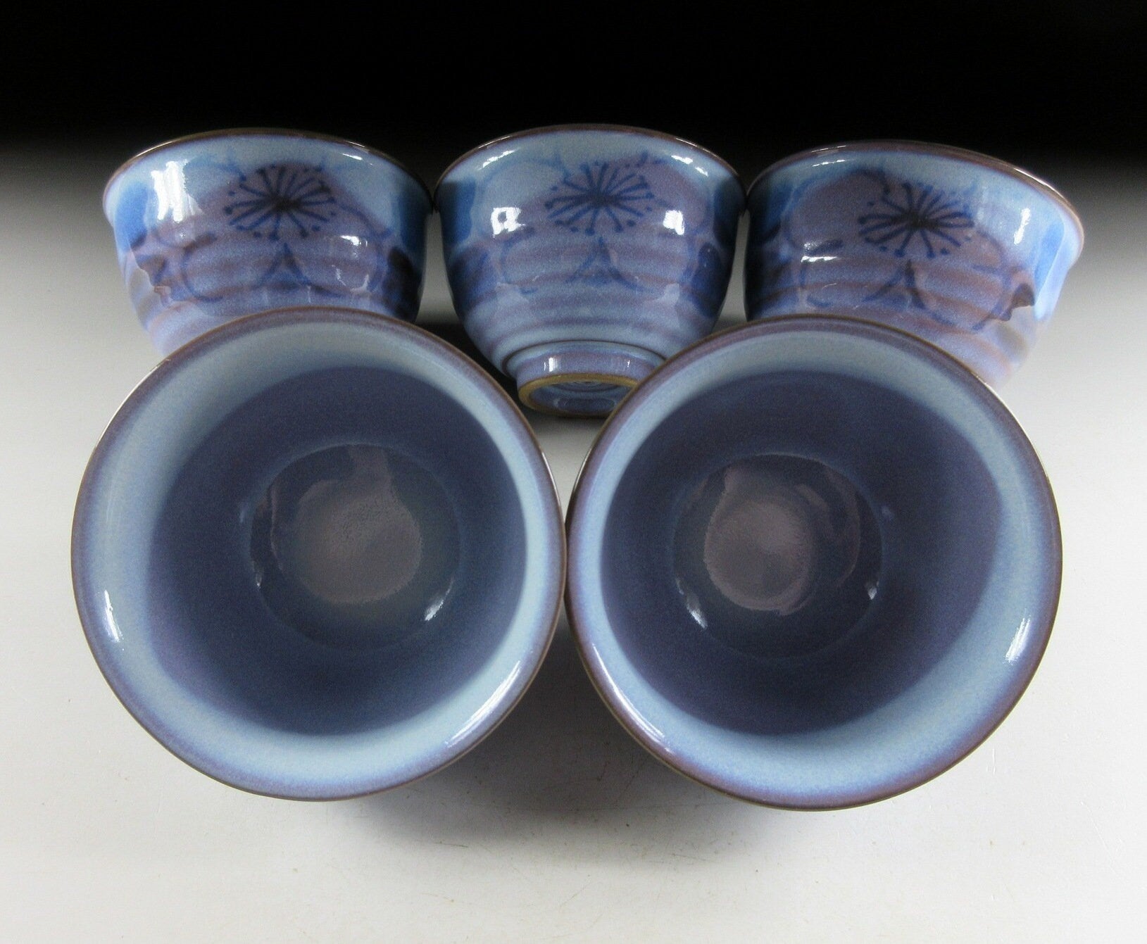 This listing is for a set of five Hagi-ware tea cups made around 20 years ago. They are wheel-thrown coated in two shades of transparent glaze over a high fired stoneware base. The front of each cup is decorated with a hand-painted depiction of an ume blossom, and these cups are ideally suited to serving sencha. The set appears unused and comes with its original stamped wooden storage box.