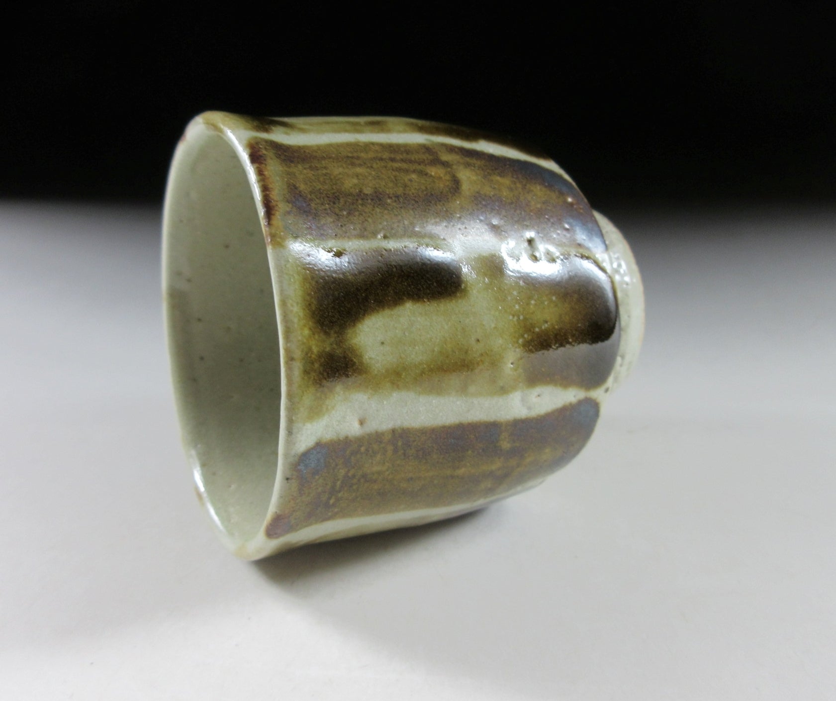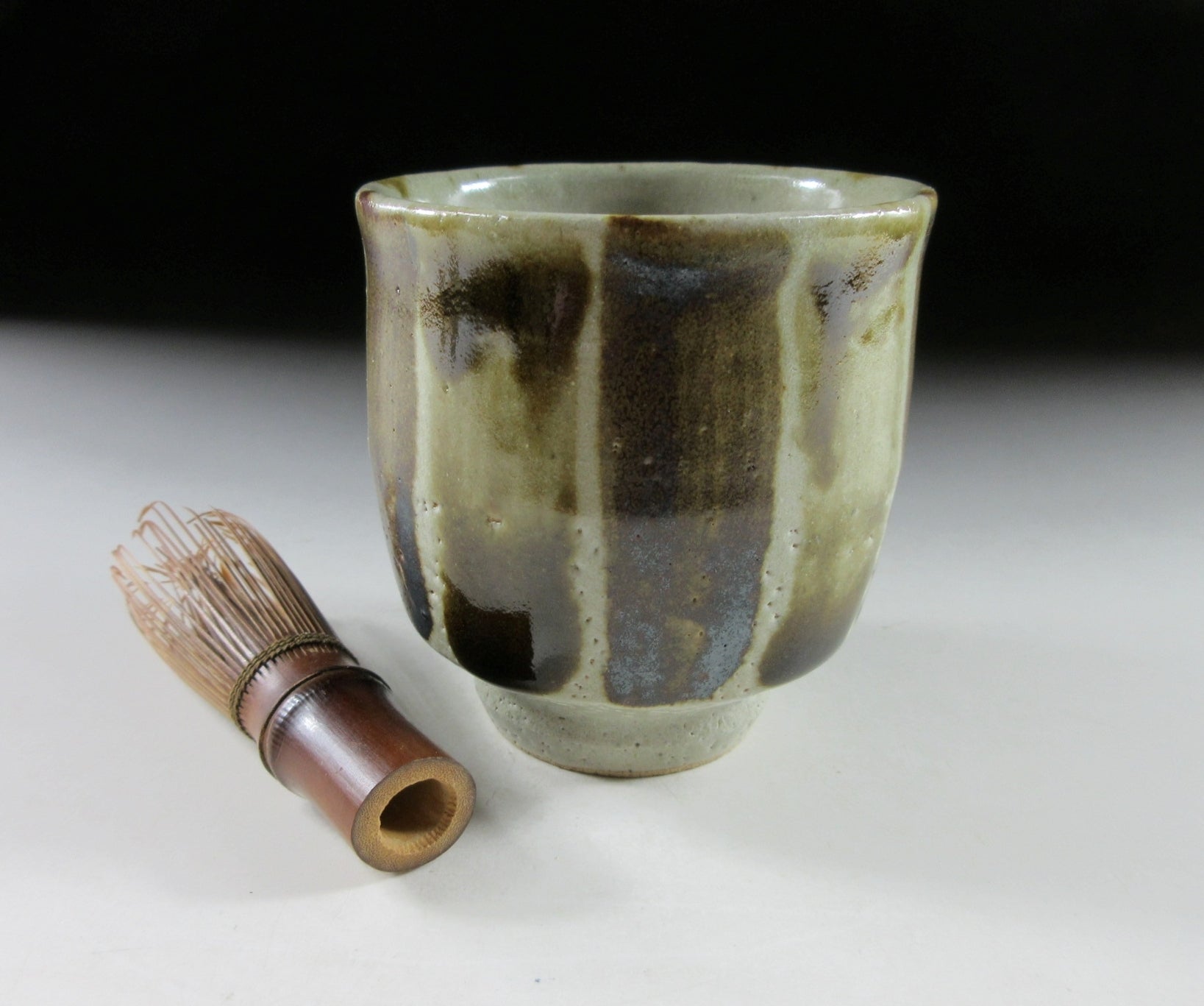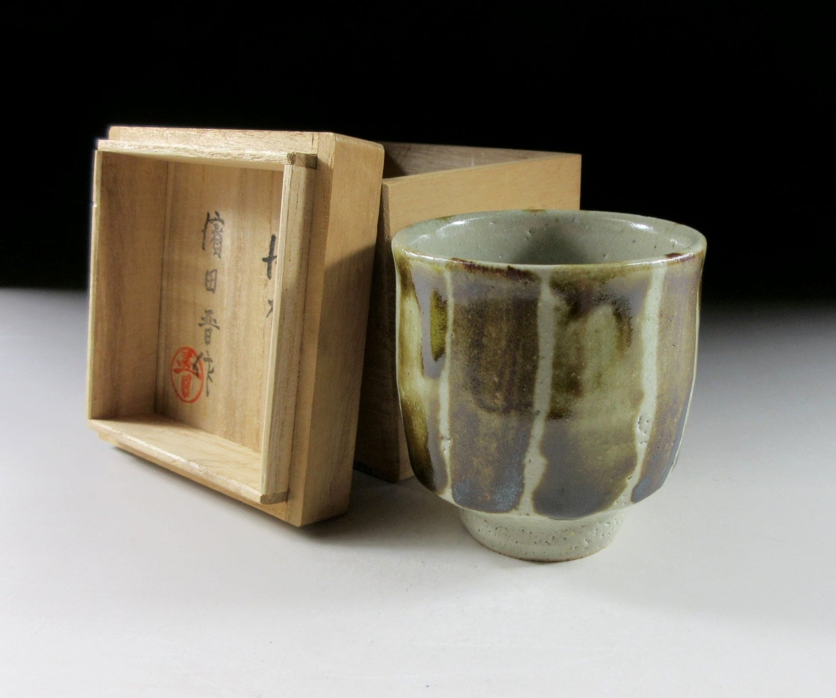 This listing is for a Mashiko-ware yunomi tea cup made around 40 years ago by the highly esteemed potter, Hamada Shinsaku. It is wheel-thrown and the exterior features slightly transparent, syrupy glaze over an ash glaze base. It comes with its original signed wooden storage box (the box is stamped with one of his earlier seals), and a turmeric coloured wrapping cloth for when the item is not in use. *PLEASE NOTE THAT THE BAMBOO TEA WHISK IS NOT INCLUDED.
