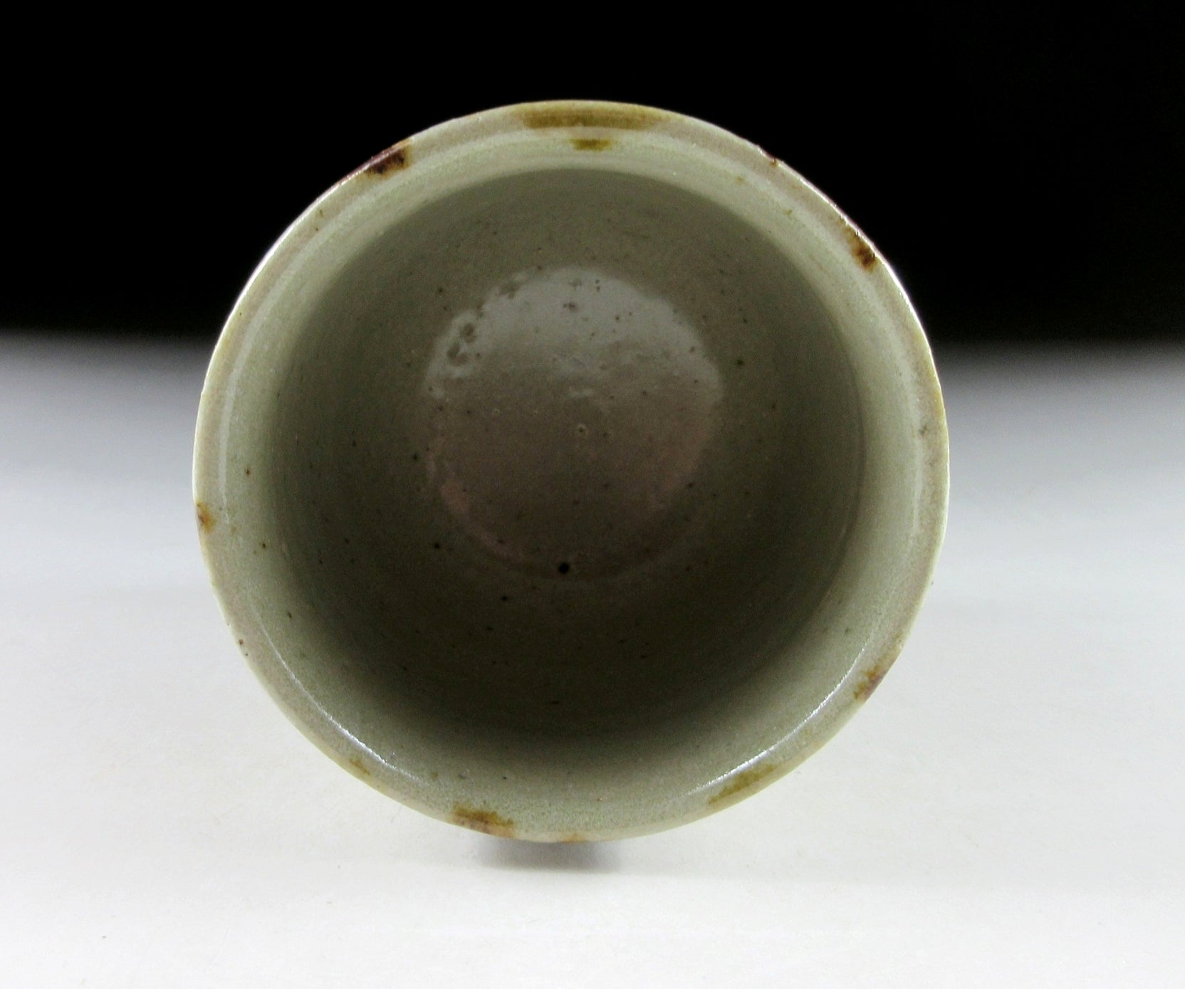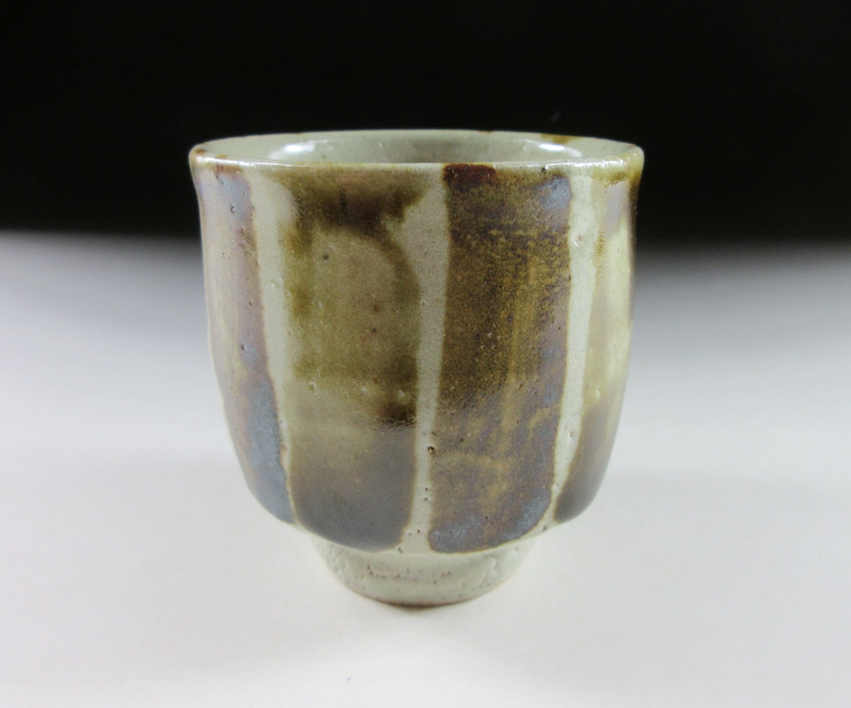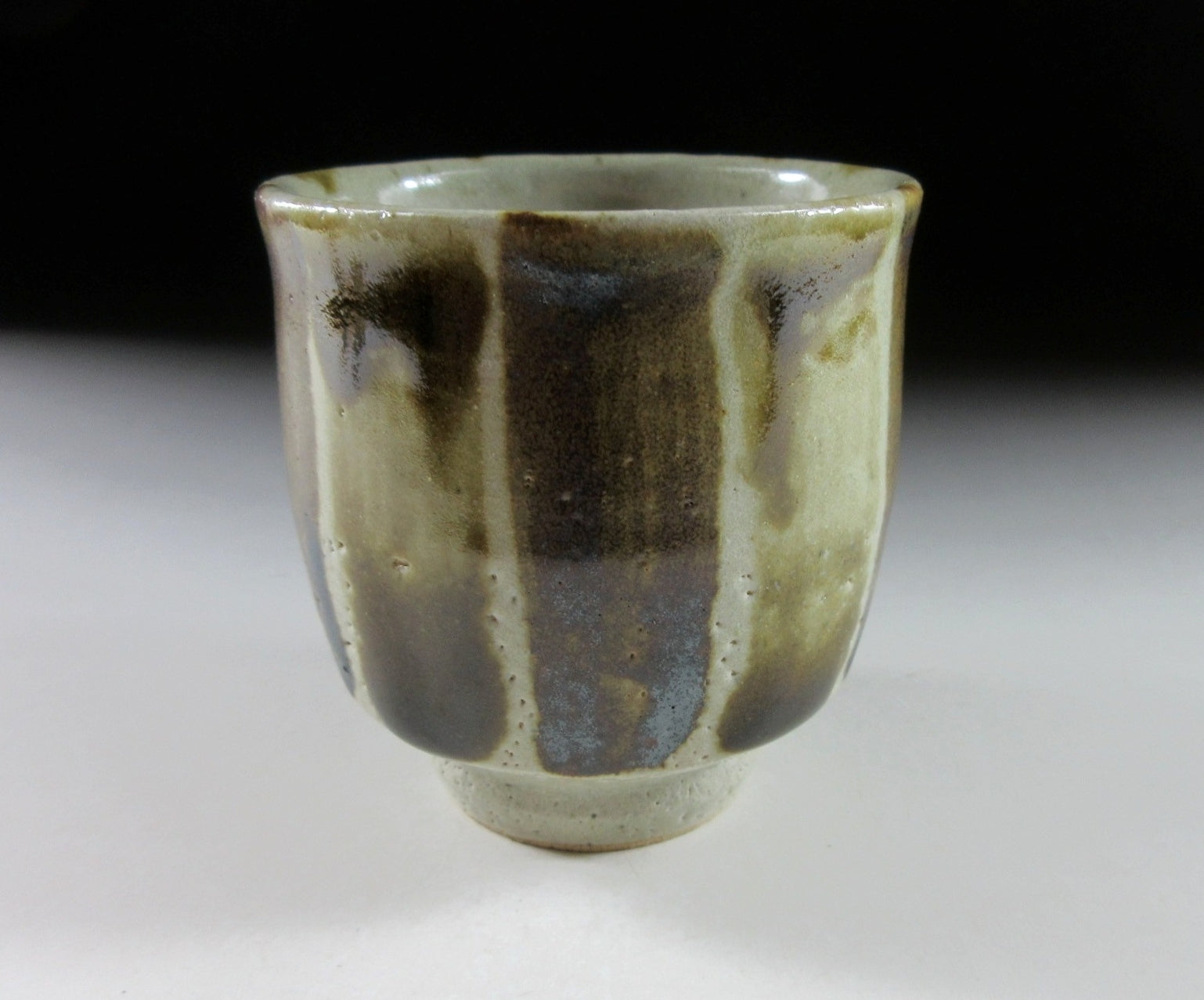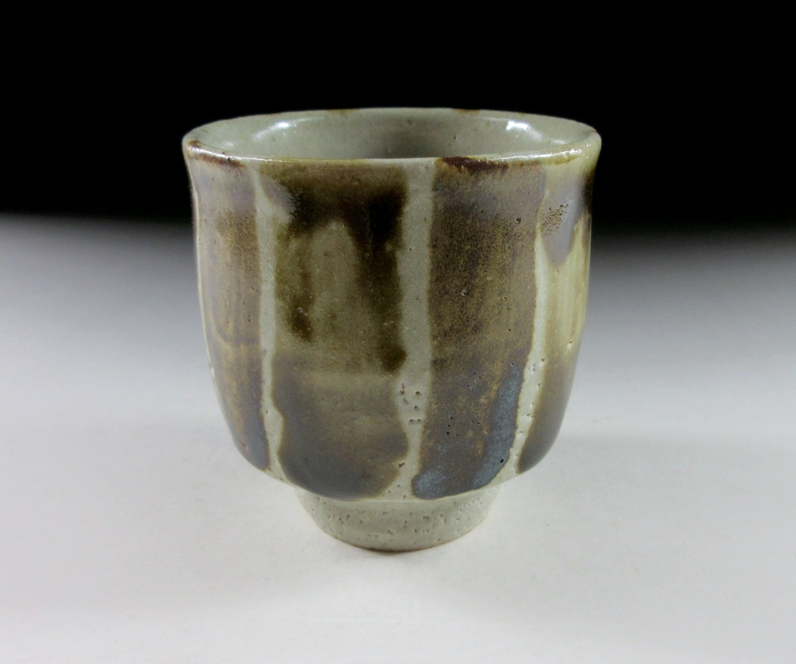 This listing is for a Mashiko-ware yunomi tea cup made around 40 years ago by the highly esteemed potter, Hamada Shinsaku. It is wheel-thrown and the exterior features slightly transparent, syrupy glaze over an ash glaze base. It comes with its original signed wooden storage box (the box is stamped with one of his earlier seals), and a turmeric coloured wrapping cloth for when the item is not in use. *PLEASE NOTE THAT THE BAMBOO TEA WHISK IS NOT INCLUDED.