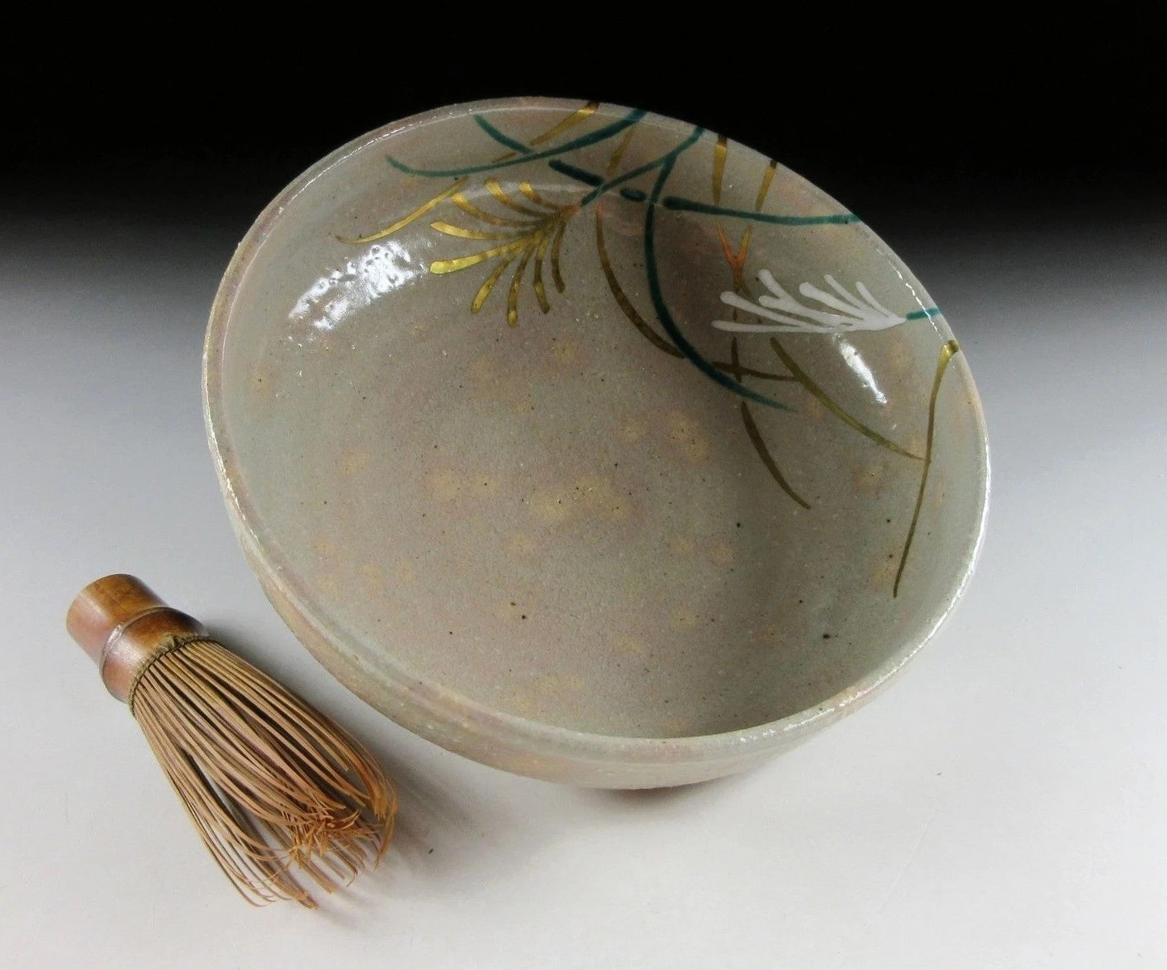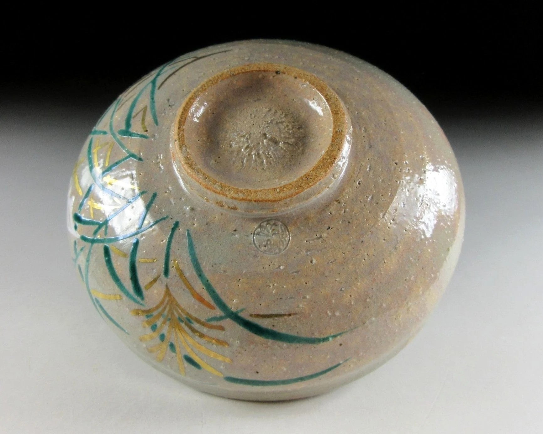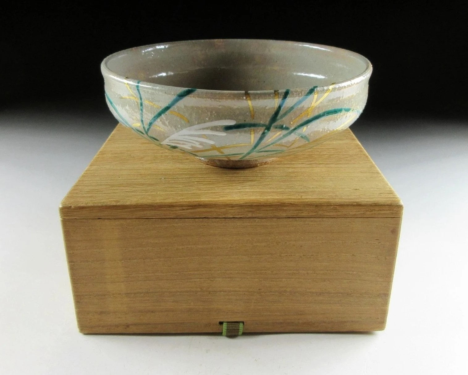 This listing is for a pleasant Kyo-ware hira chawan made around 30-40 years ago by noted potter, Hara Seiwa. It is wheel-thrown and the flat hira type used during the summer season. Hira chawan are shallow bowls with low sides designed to cool tea down faster. The bowl in this listing is decorated with hand-painted pampas grass gently swaying in the breeze. Pampas grass is generally associated with the harvest moon in autumn, so this is a pleasant tea bowl for late summer/early autumn. The stamp of the potter can be found on the bottom and it comes with its original UNSIGNED wooden storage box. It also comes with a stamped yellow wrapping cloth for when the item is not in use. *PLEASE NOTE THAT THE CHASEN TEA WHISK IS NOT INCLUDED.