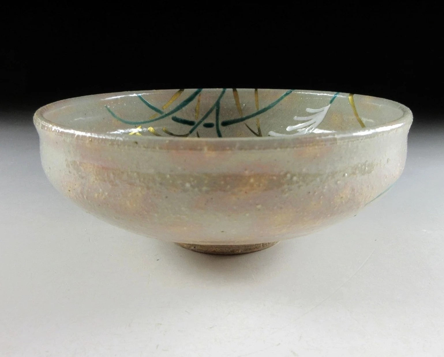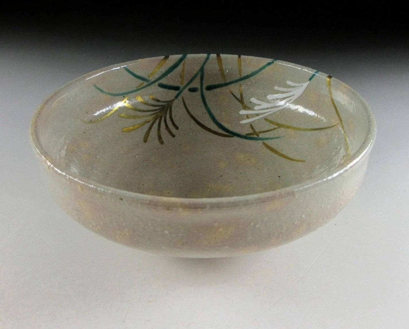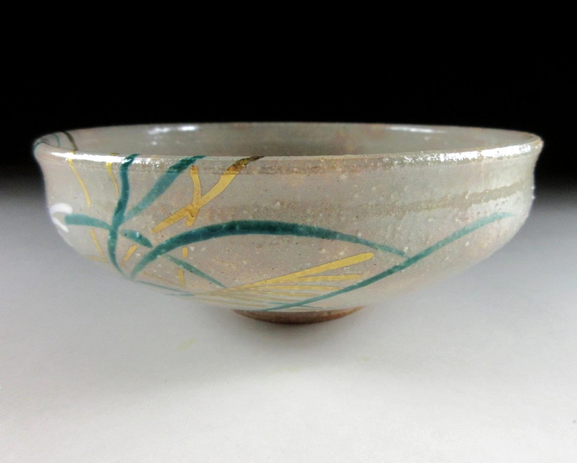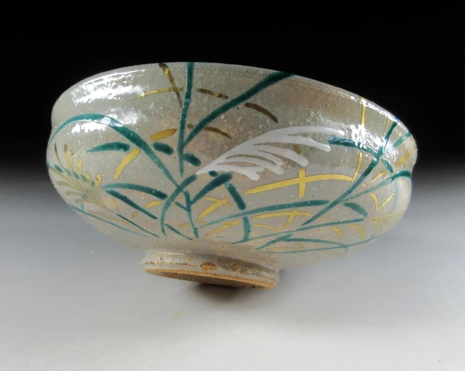This listing is for a pleasant Kyo-ware hira chawan made around 30-40 years ago by noted potter, Hara Seiwa. It is wheel-thrown and the flat hira type used during the summer season. Hira chawan are shallow bowls with low sides designed to cool tea down faster. The bowl in this listing is decorated with hand-painted pampas grass gently swaying in the breeze. Pampas grass is generally associated with the harvest moon in autumn, so this is a pleasant tea bowl for late summer/early autumn. The stamp of the potter can be found on the bottom and it comes with its original UNSIGNED wooden storage box. It also comes with a stamped yellow wrapping cloth for when the item is not in use. *PLEASE NOTE THAT THE CHASEN TEA WHISK IS NOT INCLUDED.