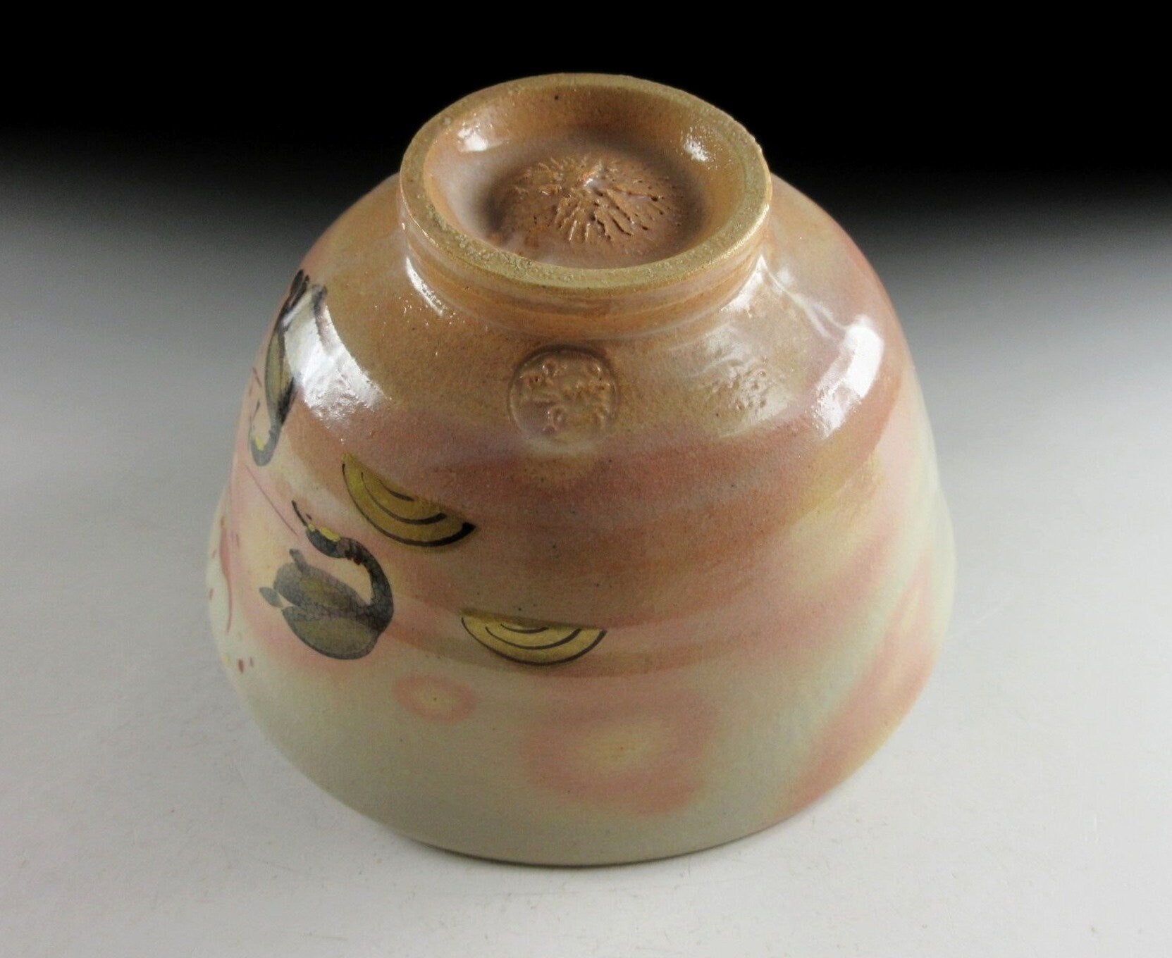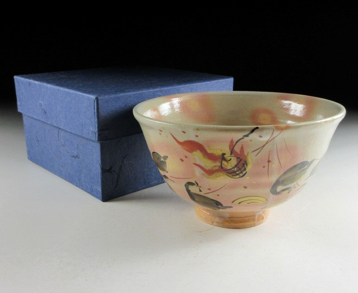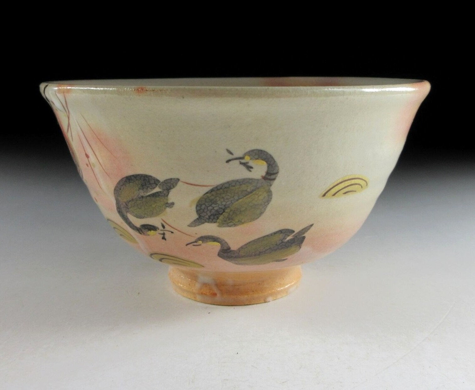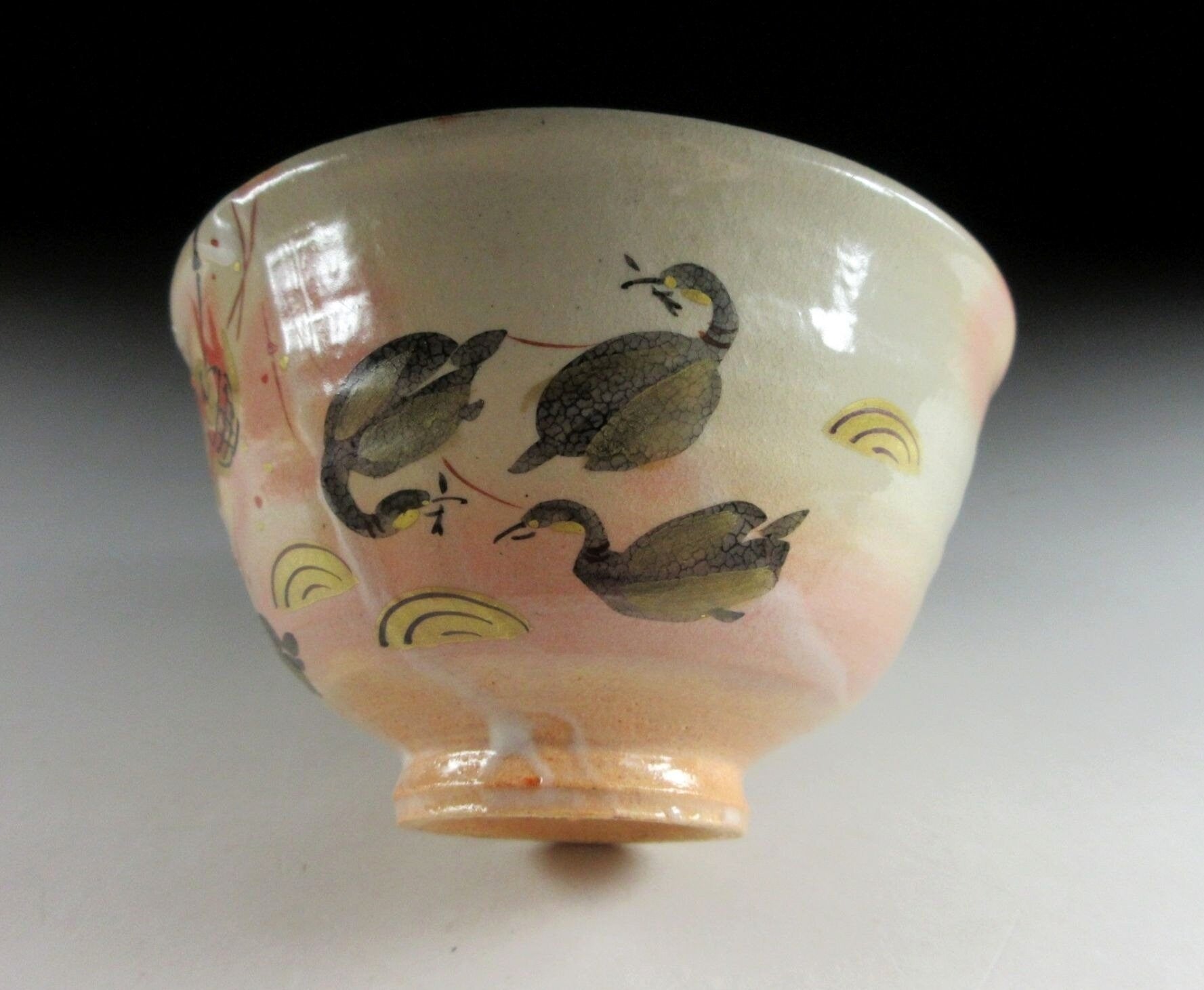 This listing is for a very pleasant Kyo-ware chawan made around 20 years ago by noted potter, Hara Seiwa. It is wheel-thrown and decorated with hand-painted cormorants diving for small fish. Cormorant fishing, or ukai as its known in Japanese, is a 1300 year old tradition that takes place during summer. Fishermen in long wooden boats lead cormorants that swim alongside the boat to catching fish. The event attracts many visitors during the summer season, and master fishermen have official patronage from the emperor. The bowl was also dipped in transparent white glaze and has gohonte markings. Gohonte refers to the pale spots that appear on the pottery due to the natural reactions from the iron found in the clay when being fired in the kiln. The stamp of the potter can be found on the bottom, and it comes with its original paper storage box.