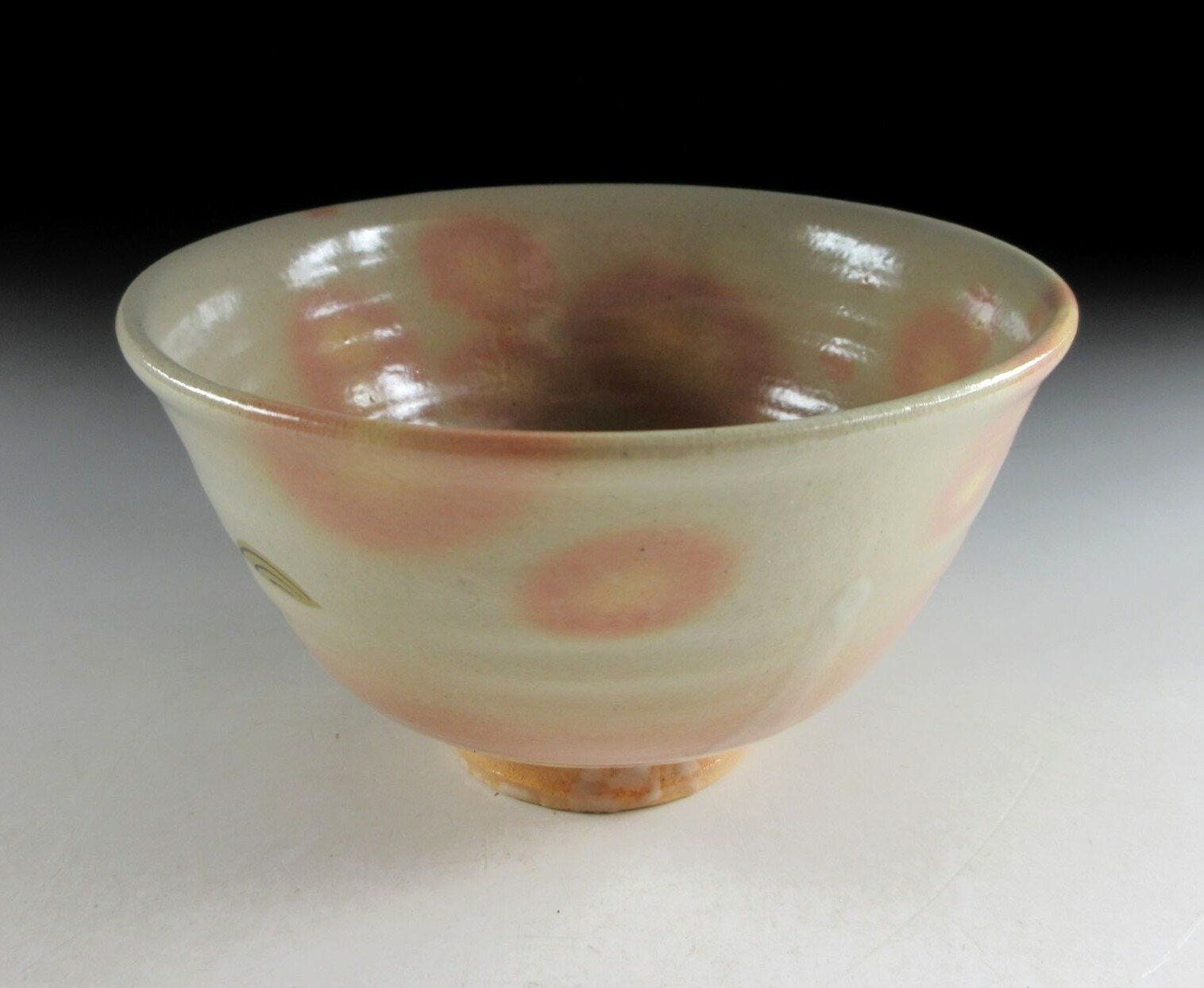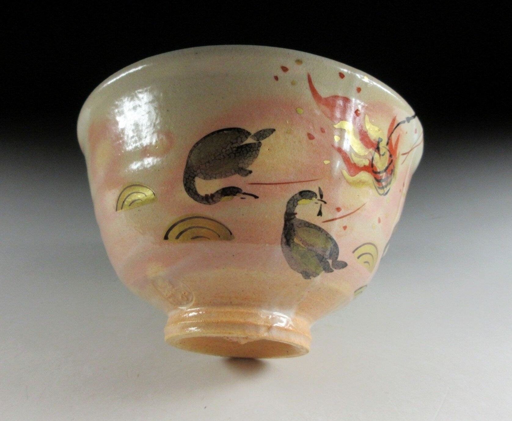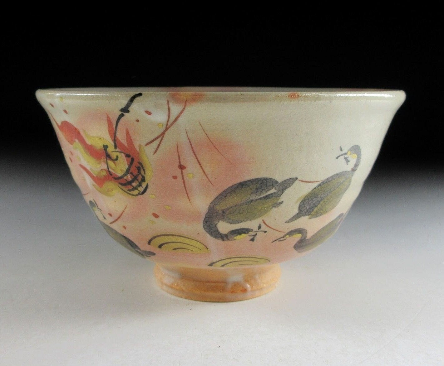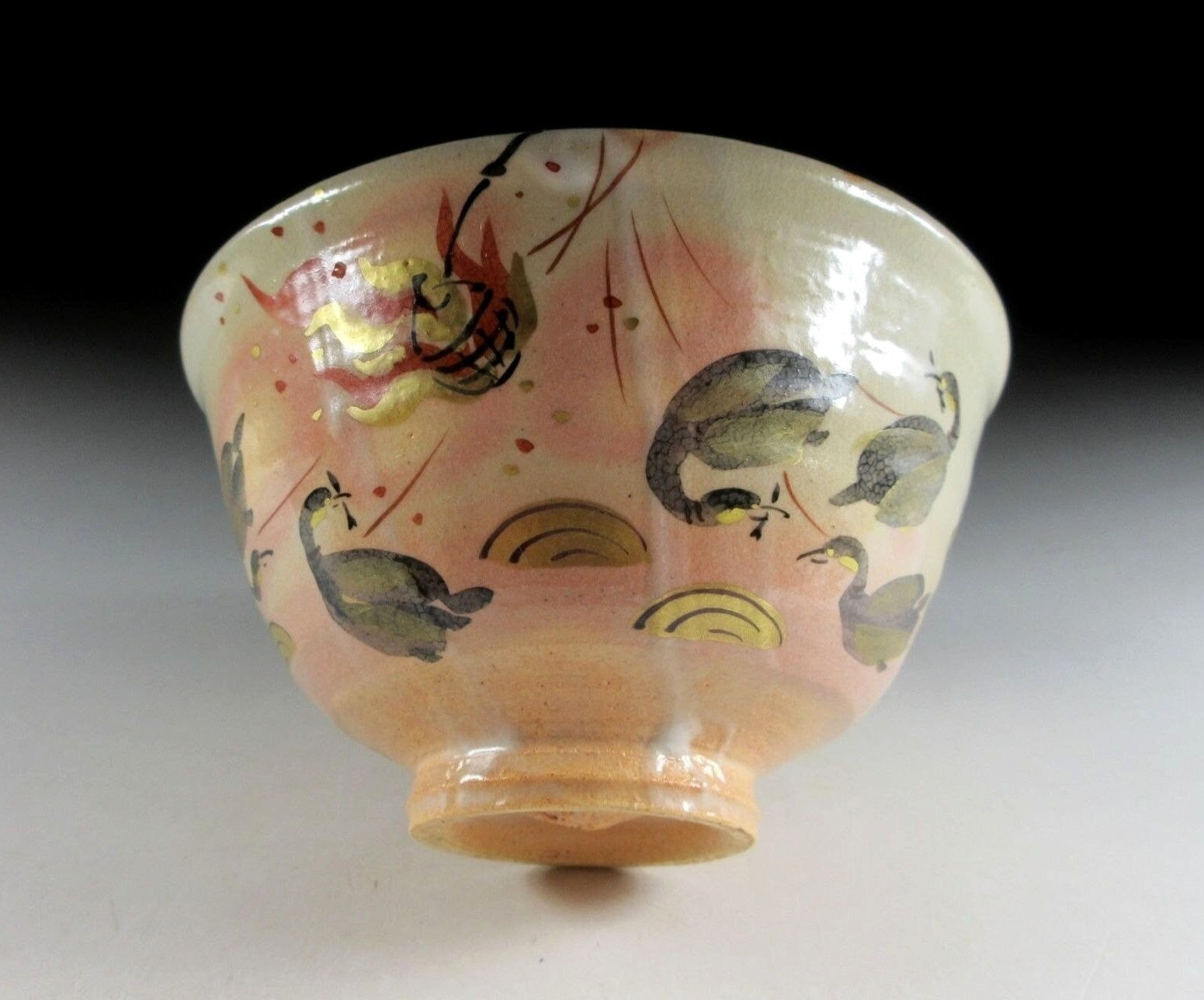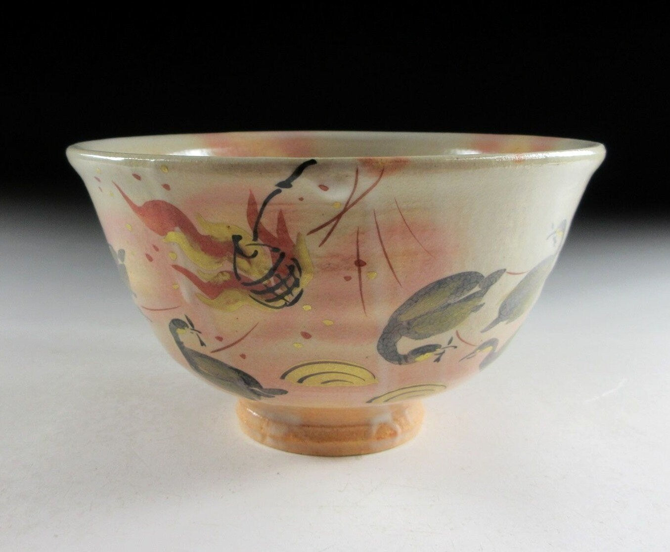 This listing is for a very pleasant Kyo-ware chawan made around 20 years ago by noted potter, Hara Seiwa. It is wheel-thrown and decorated with hand-painted cormorants diving for small fish. Cormorant fishing, or ukai as its known in Japanese, is a 1300 year old tradition that takes place during summer. Fishermen in long wooden boats lead cormorants that swim alongside the boat to catching fish. The event attracts many visitors during the summer season, and master fishermen have official patronage from the emperor. The bowl was also dipped in transparent white glaze and has gohonte markings. Gohonte refers to the pale spots that appear on the pottery due to the natural reactions from the iron found in the clay when being fired in the kiln. The stamp of the potter can be found on the bottom, and it comes with its original paper storage box.