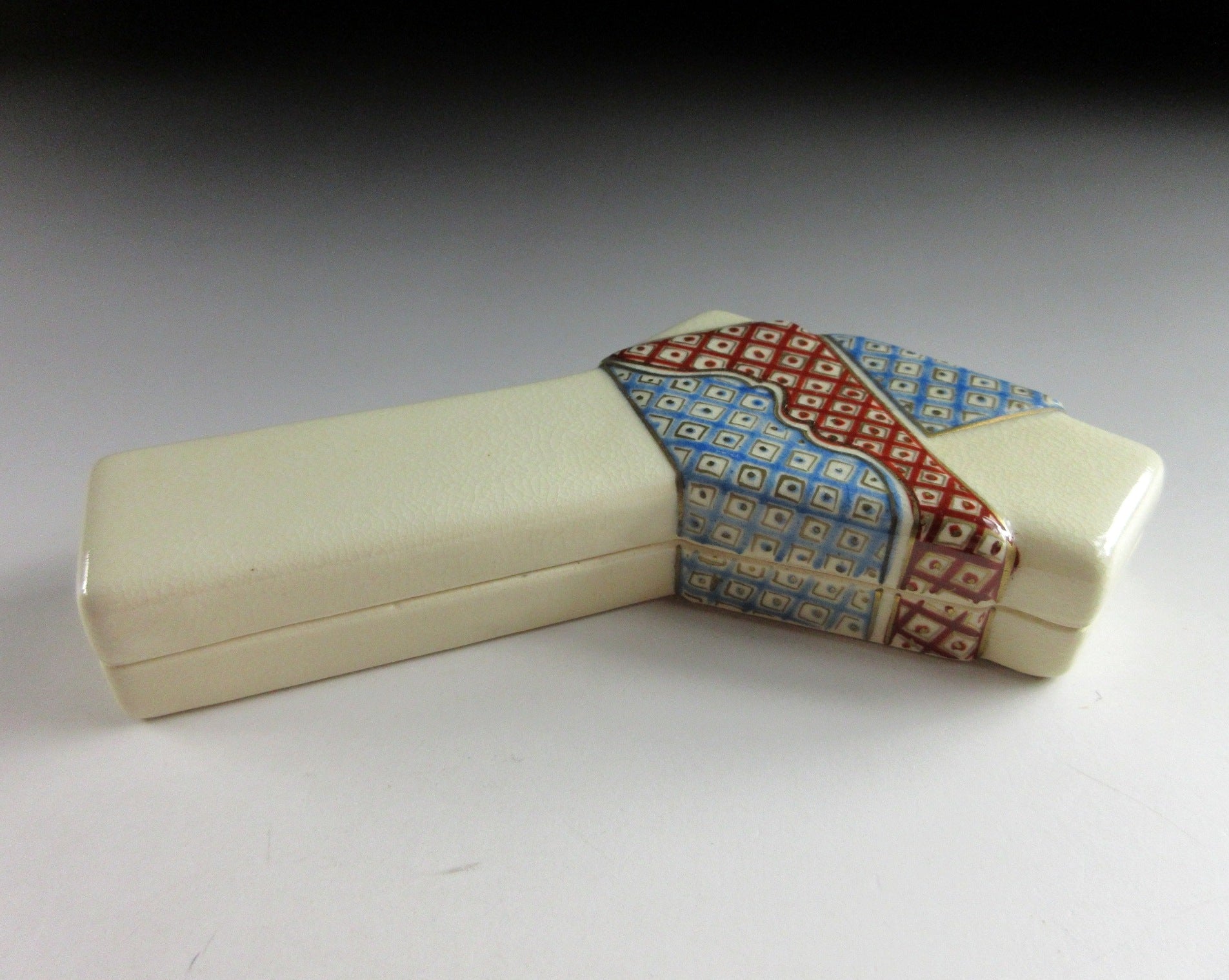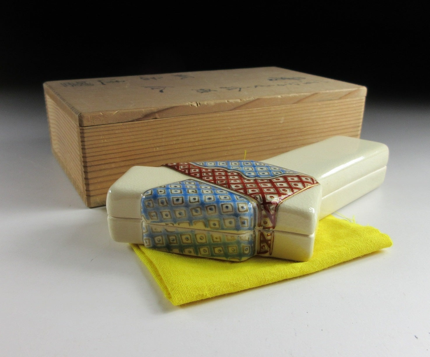 This listing is for a Kyo-ware kogo made around 30 years ago by noted potter, Hashimoto Jogaku. It is made of stoneware and moulded to resemble a beautiful knot pattern. The first knot pattern appeared during the Edo period when Ninsei presented the Ikeda clan with a splendid knot pattern kogo. Since then it has been used to decorate all kinds of wares from tea bowls to textiles. The kogo in this listing is ample in size and suitable for holding both woodchip and kneaded incense, although pottery kogo are typically used for kneaded incense during the cooler months. The stamp of the potter can be found on the bottom, and it comes with its original signed wooden storage box. It also comes with a yellow wrapping cloth for when the item is not in use.