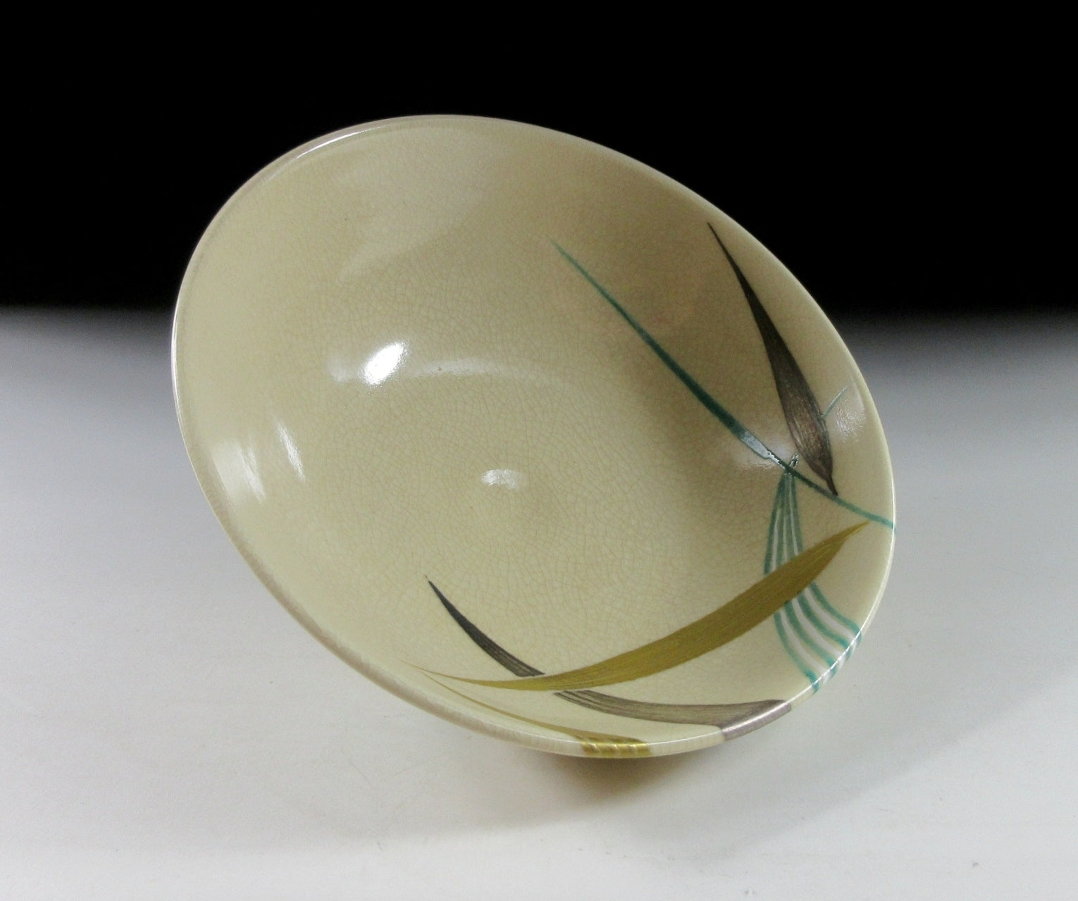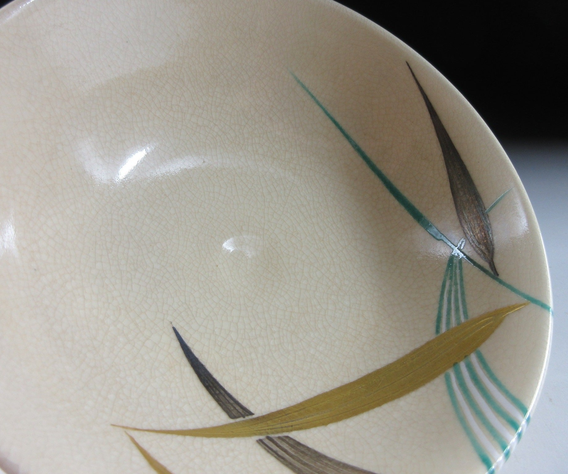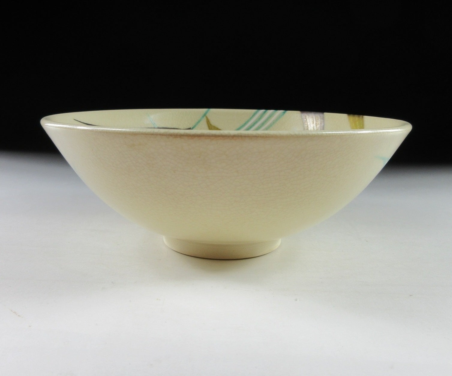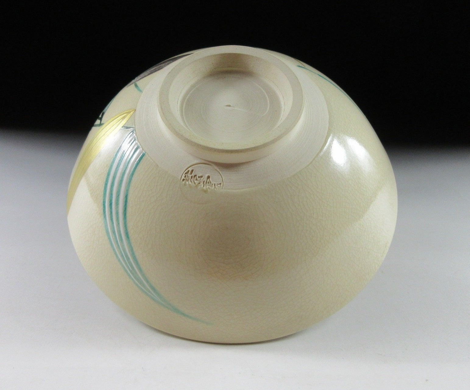 This listing is for a splendid Kyo-ware hira chawan made around 20 years ago by noted potter, Hashimoto Shiun. It is wheel-thrown and the flat hira type used during the summer season. Hira chawan are shallow bowls with low sides designed to cool tea down faster. The bowl in this listing is decorated with red dragonflies and colourful bamboo. Dragonflies signify a change in seasons, and are frequently used to decorate teaware designated for late summer, early autumn. Also once upon a time dragonflies were thought to be spirits of rice plants and an omen for good harvest. The stamp of the kiln can be found on the bottom, and it comes with a paper storage box. It also comes with an orange wrapping cloth for when the item is not in use.