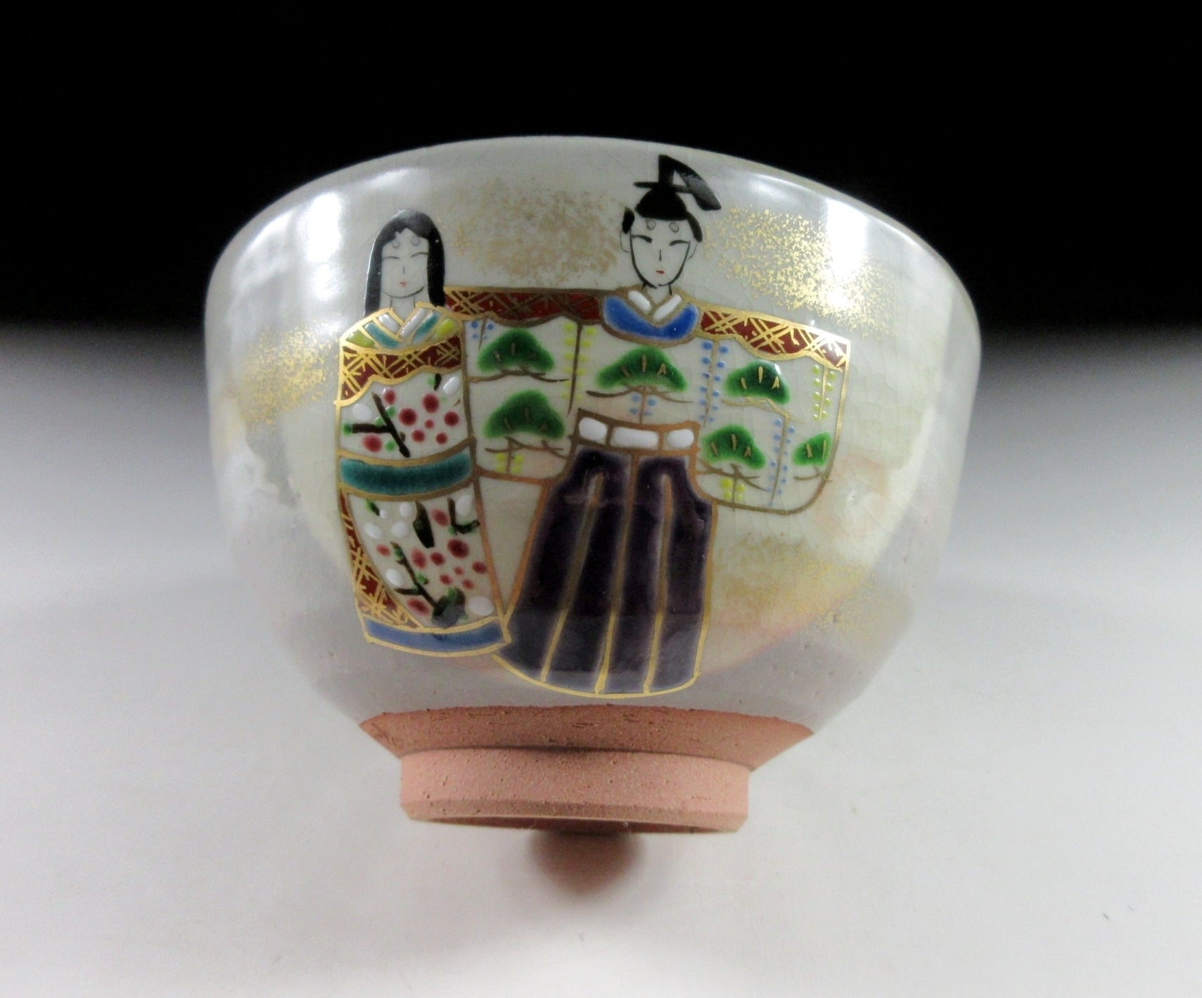 This listing is for a Kyo-ware chawan made around 20 years ago by noted potter Hashimoto Shiun. It is wheel-thrown and the front is decorated with a lovely hina matsuri design. Hina matsuri refers to a March 3rd celebration where people pray for the health and happiness of their girls. Families display dolls and eat food such as hina arare. The bowl in this listing is decorated with an emperor and empress doll and also features a dusting of gold overglaze. The stamp of the potter can be found on the bottom, and it comes with its original paper storage box. PLEASE NOTE THAT THE CHASEN TEA WHISK IS NOT INCLUDED.