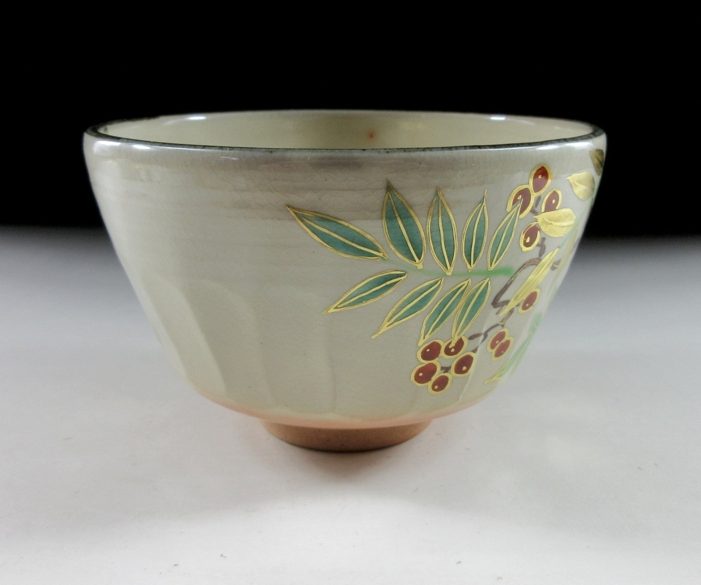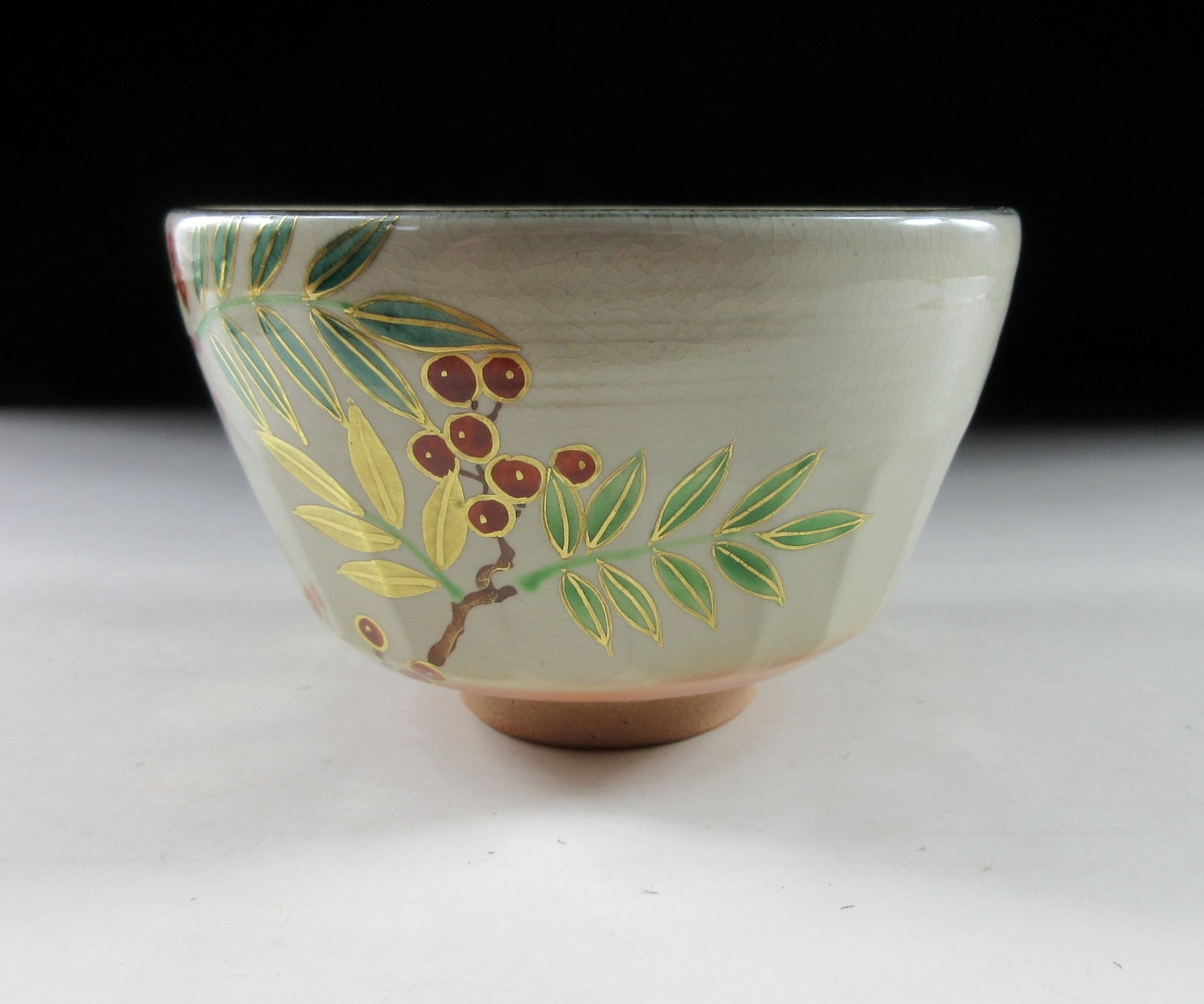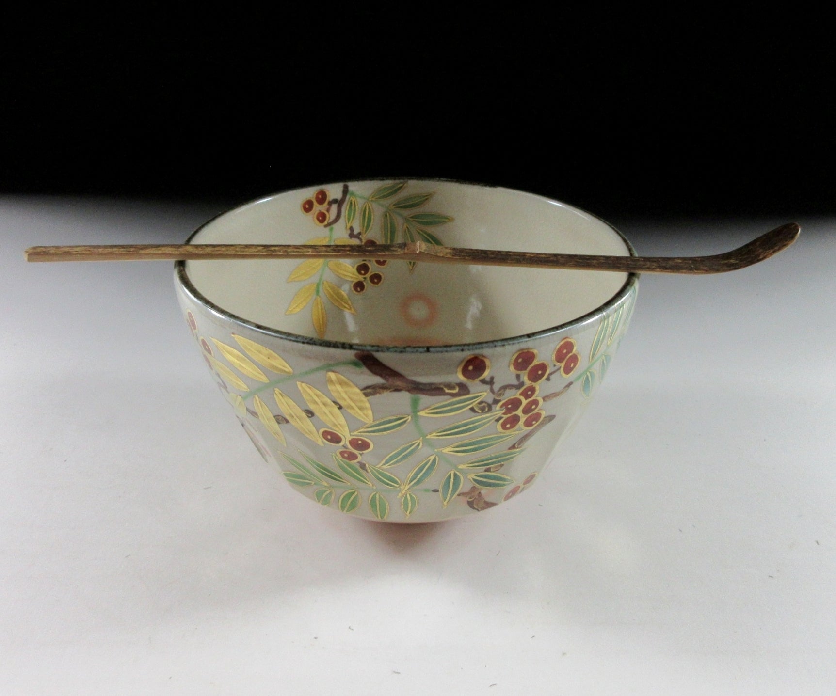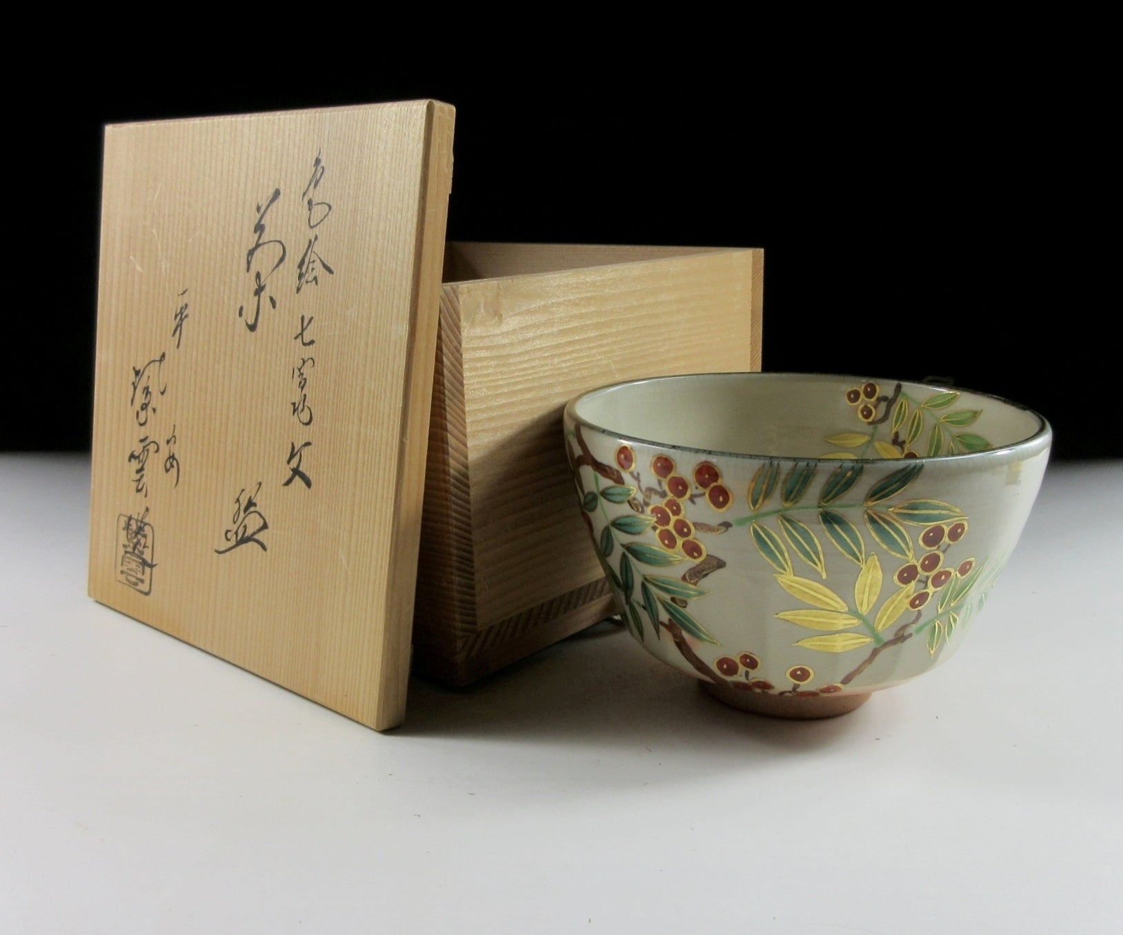 This listing is for a hand-painted Kyo-ware chawan made around 20 years ago by the highly regarded potter, Hashimoto Shiun. It is wheel-thrown and decorated with red nandina berries. The nandina bush bears clusters of berries which Japanese people commonly associate with winter. In Japanese language the word nandina also means hardship, so the nandina plant is thought to have the power to drive misfortune away. The plant appears as a motif in family crests, art and textile design, but is probably best known for its use in New Year’s arrangements where it symbolises longevity. The stamp of the potter can be found on the bottom, and it comes with its original signed wooden storage box. It also comes with a turmeric coloured writing cloth for when the item is not in use. *PLEASE NOTE THAT THE CHASHAKU IS NOT INCLUDED.