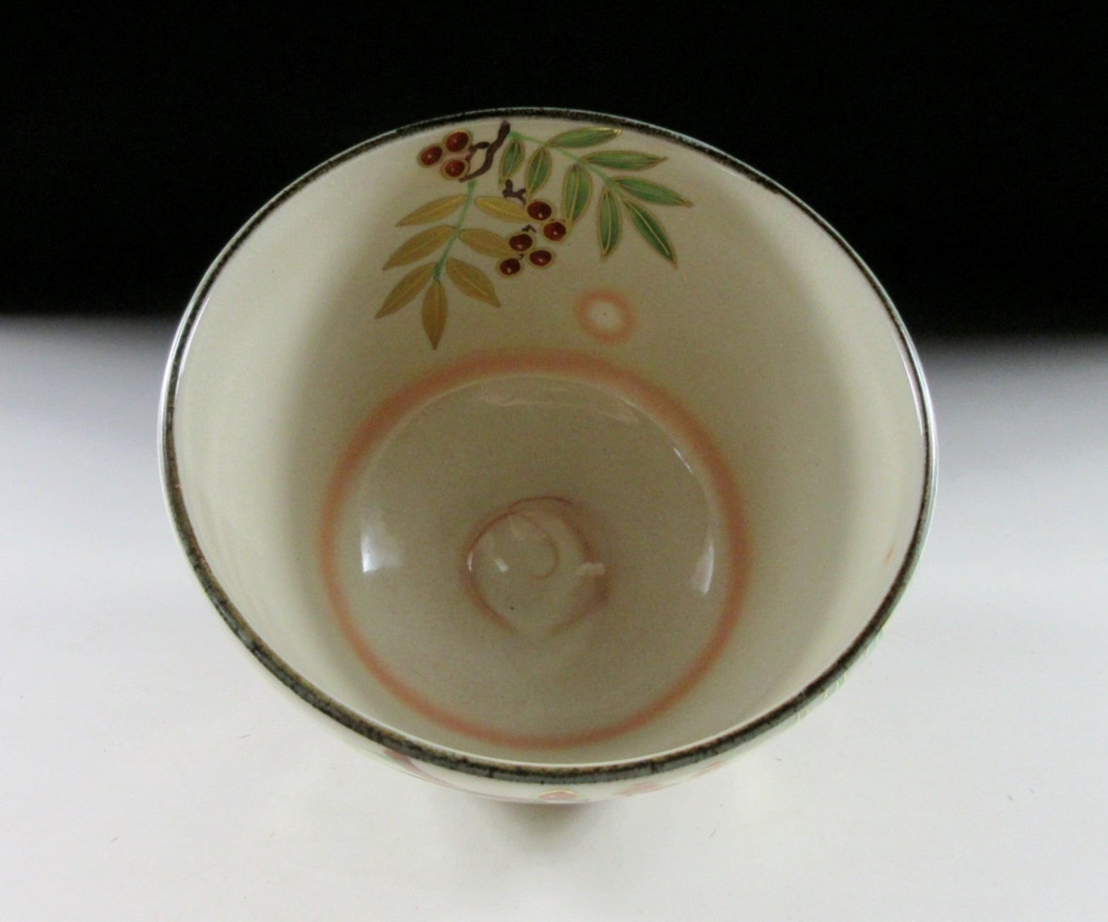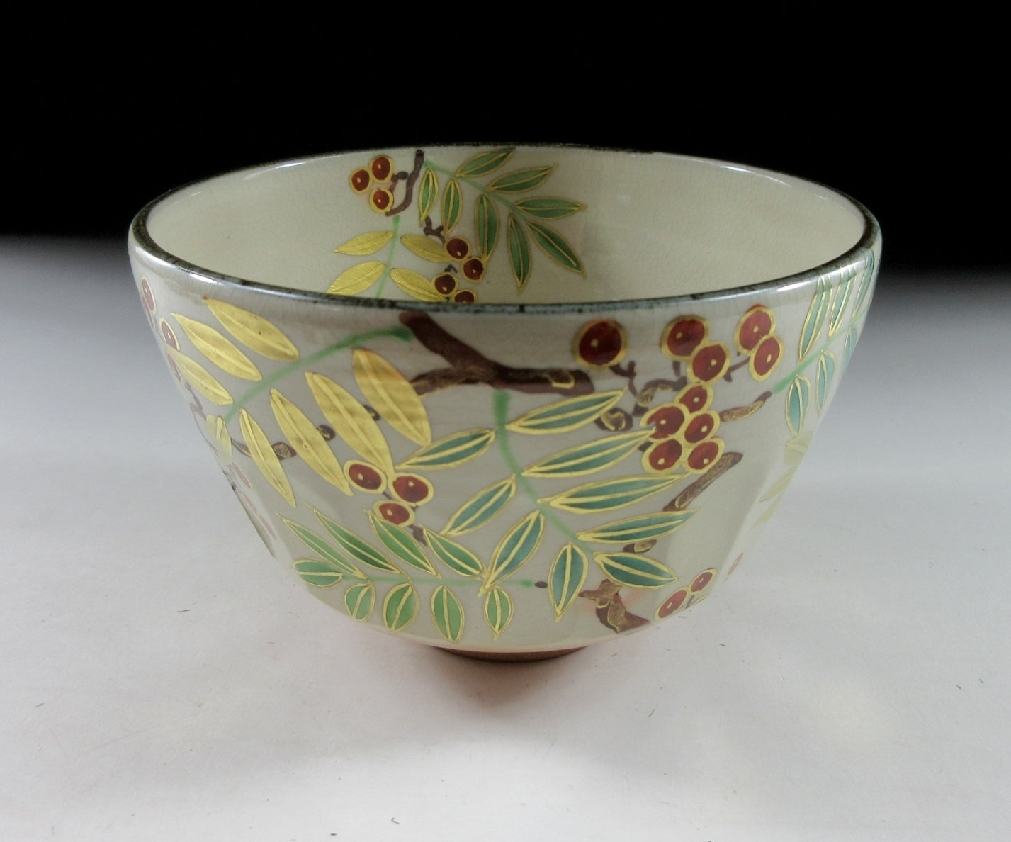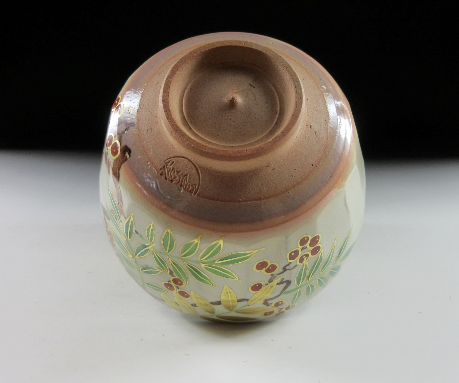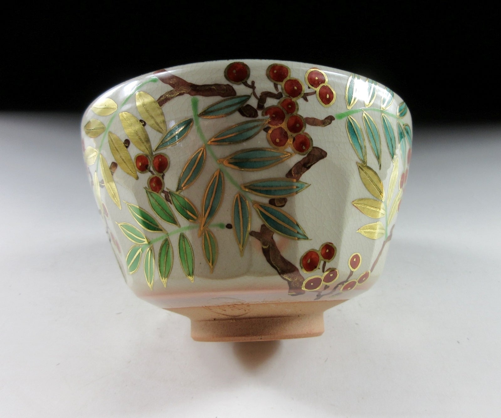 This listing is for a hand-painted Kyo-ware chawan made around 20 years ago by the highly regarded potter, Hashimoto Shiun. It is wheel-thrown and decorated with red nandina berries. The nandina bush bears clusters of berries which Japanese people commonly associate with winter. In Japanese language the word nandina also means hardship, so the nandina plant is thought to have the power to drive misfortune away. The plant appears as a motif in family crests, art and textile design, but is probably best known for its use in New Year’s arrangements where it symbolises longevity. The stamp of the potter can be found on the bottom, and it comes with its original signed wooden storage box. It also comes with a turmeric coloured writing cloth for when the item is not in use. *PLEASE NOTE THAT THE CHASHAKU IS NOT INCLUDED.