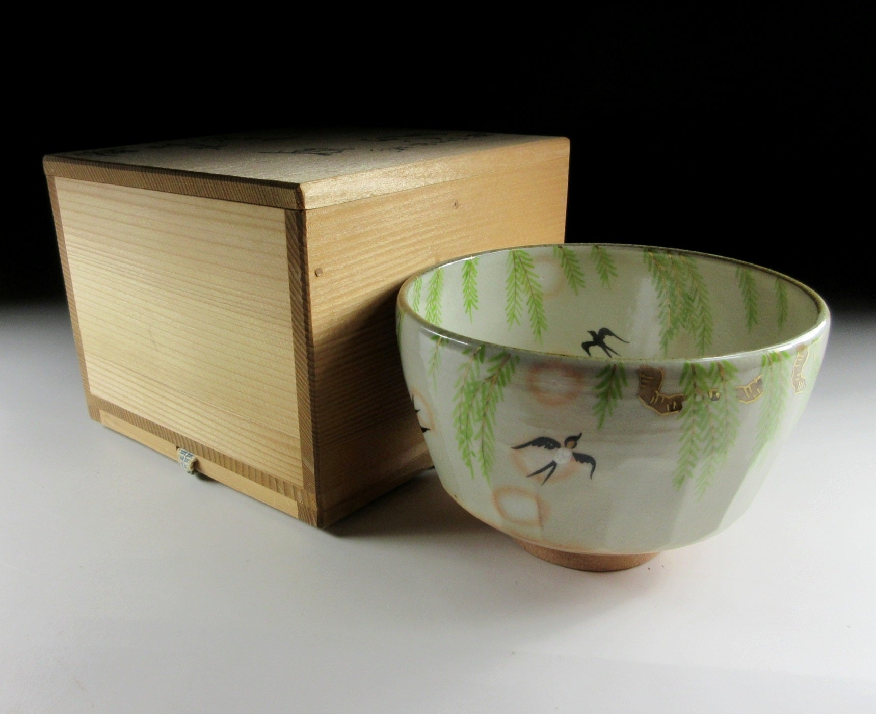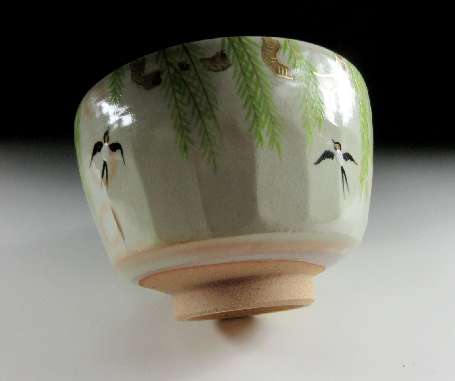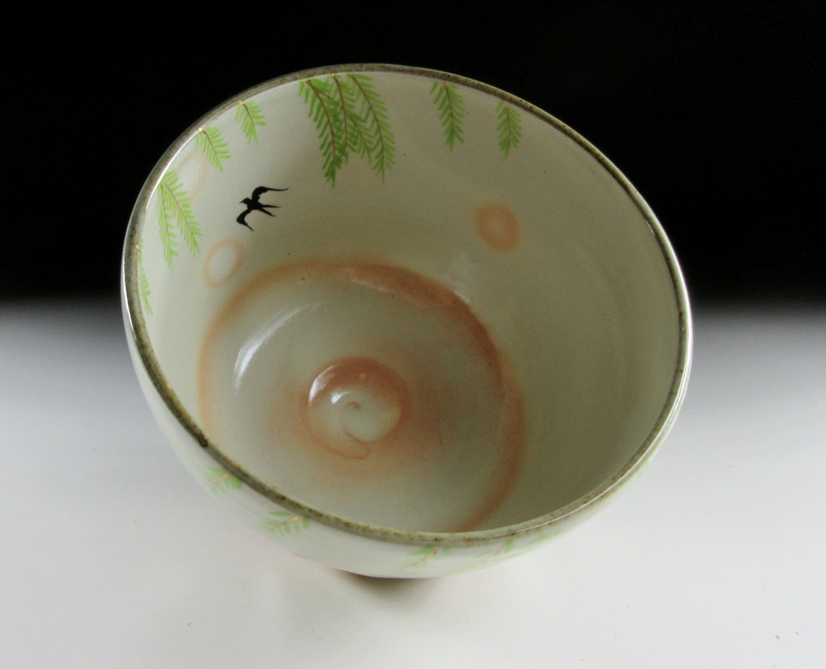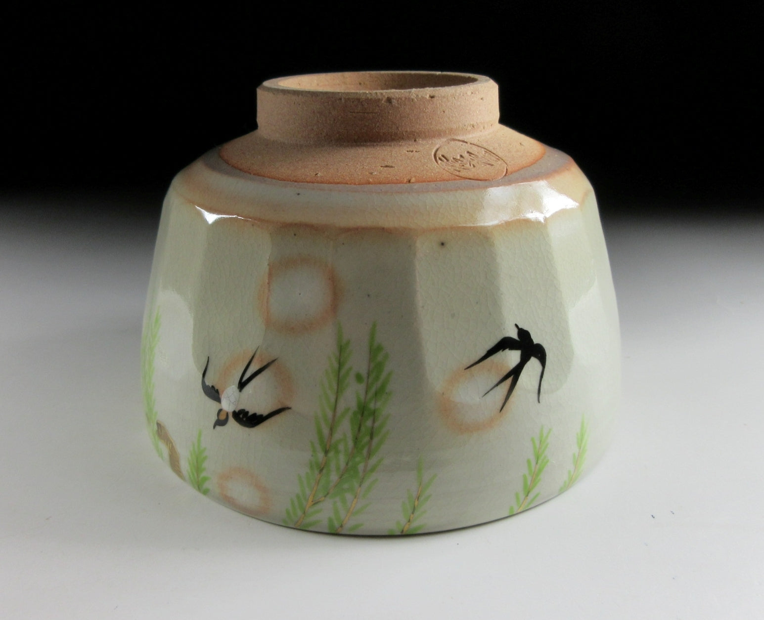 This listing is for a Kyo-ware chawan made around 20 years ago by noted potter, Hashimoto Shiun. It is wheel-thrown and both the interior and exterior are decorated with depictions of swallows and weeping willow. In Japanese ‘tsubame kitaru’ means return of the swallows, an old phrase to express the change in seasons. The lower part of the bowl has been bevelled with a potter’s tool forming nice clean edges. The stamp of the potter can be found on the bottom, and it comes with its original signed wooden storage box.