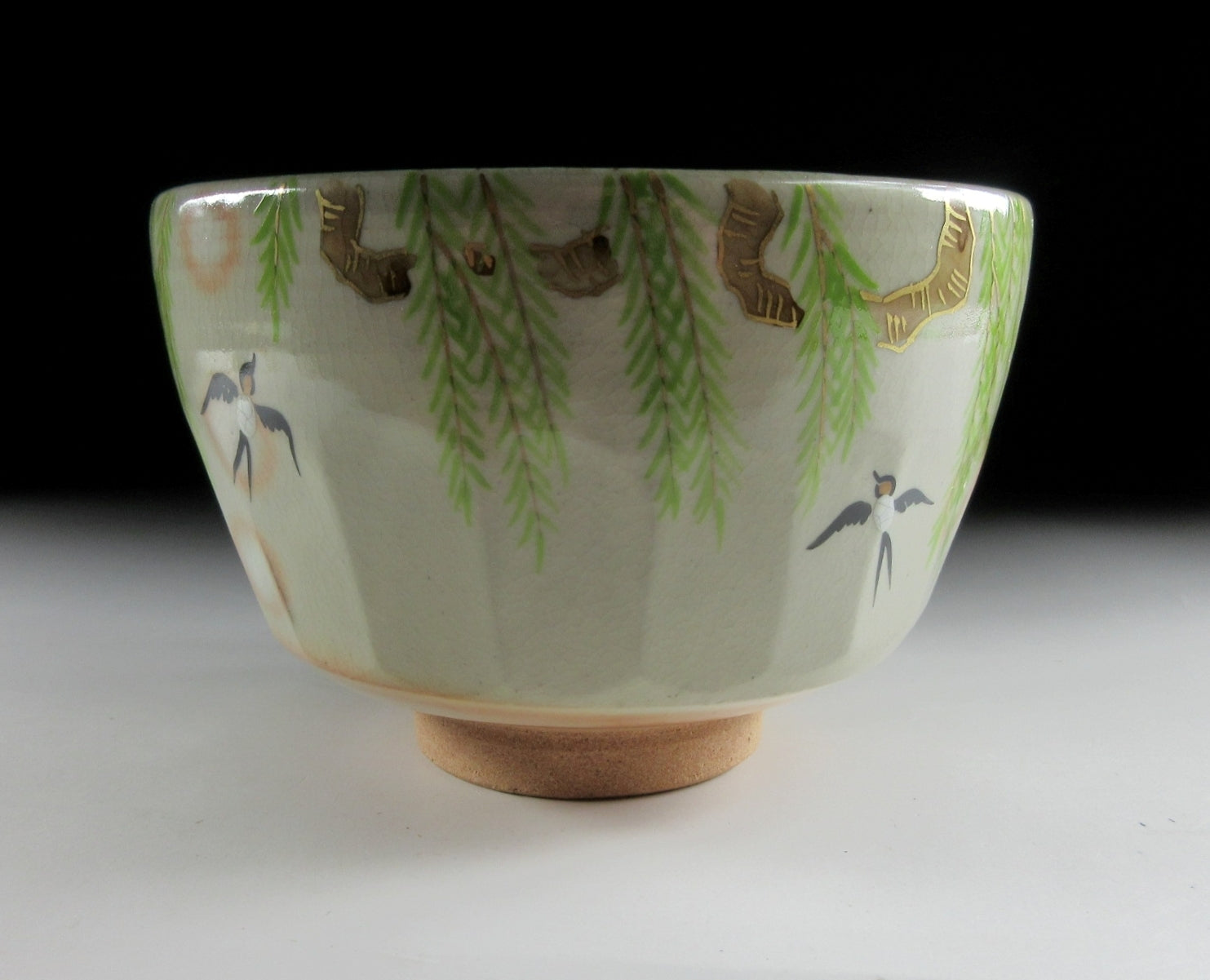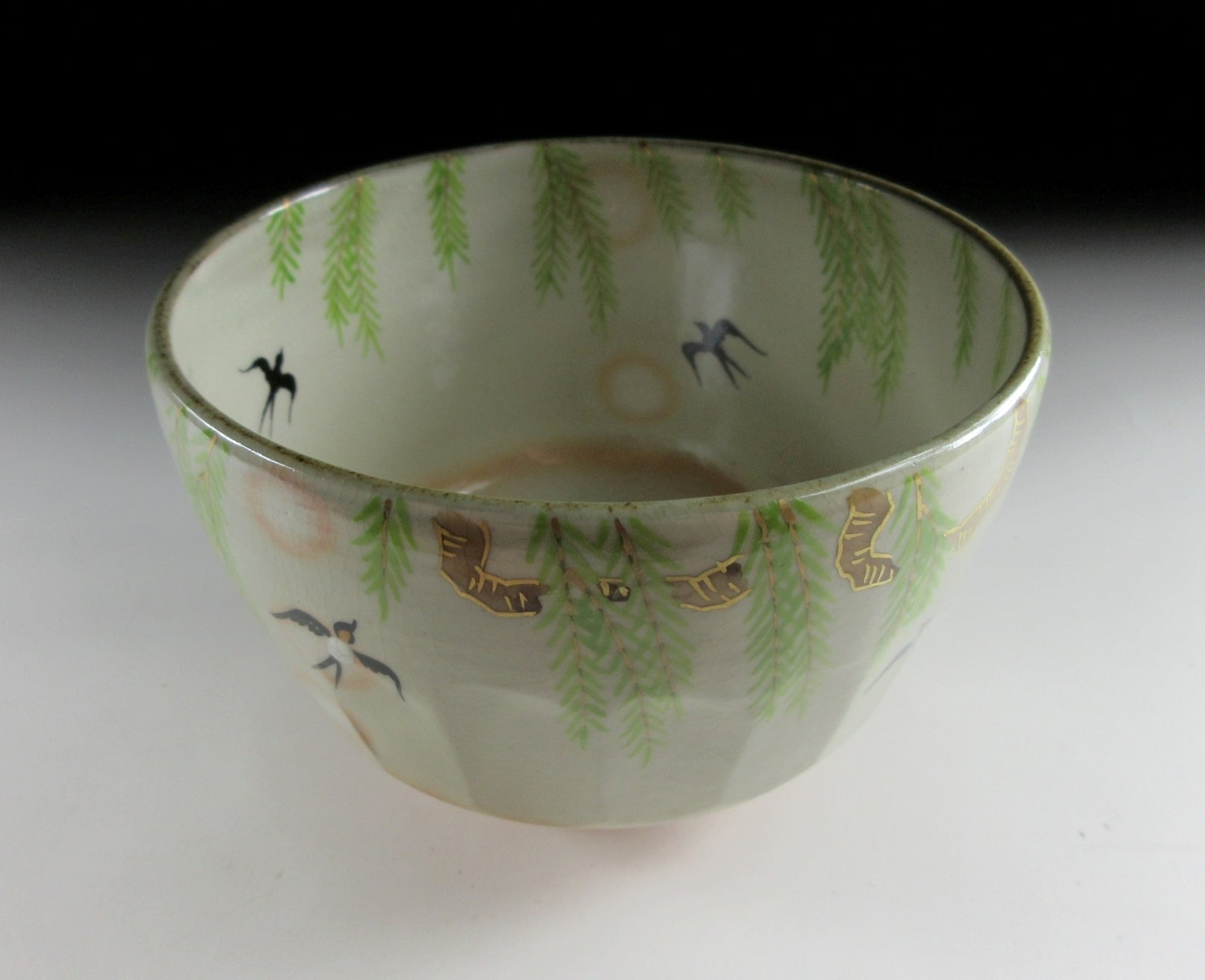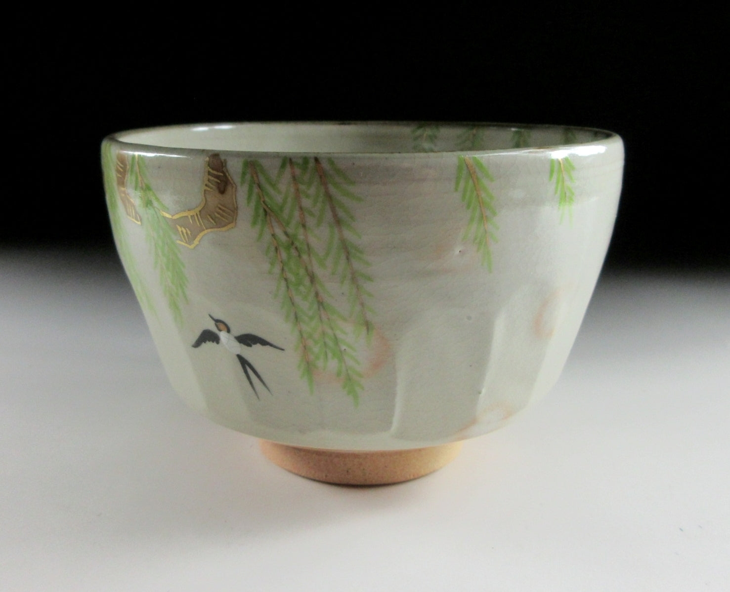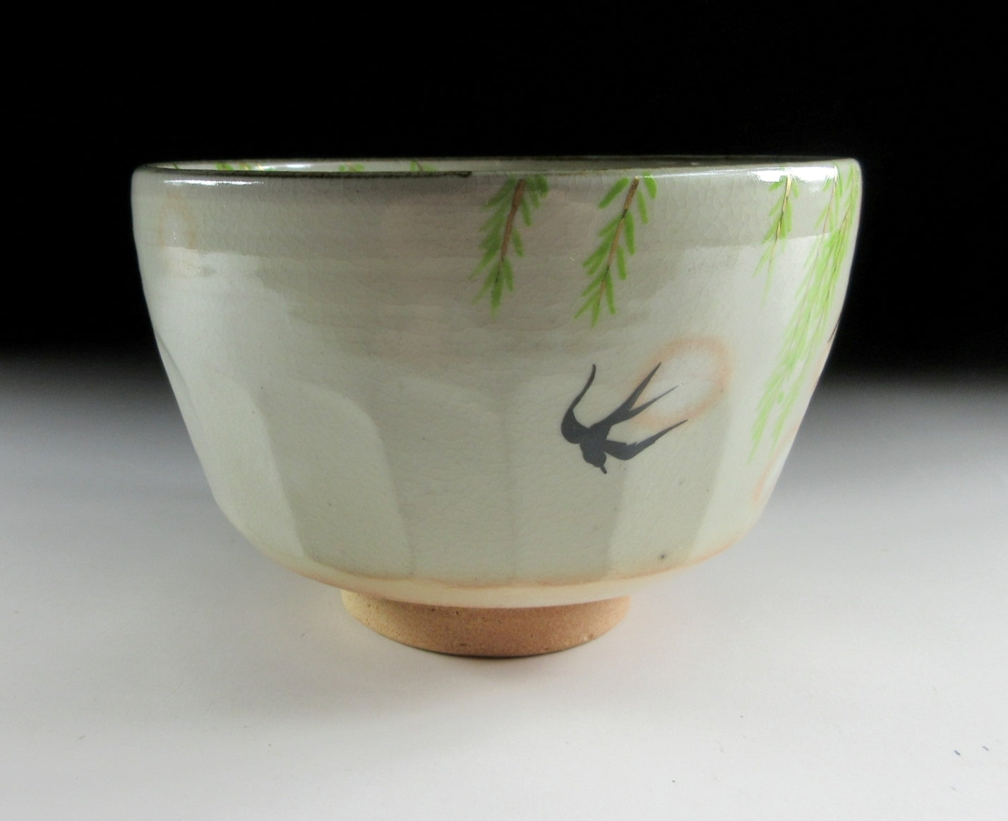 This listing is for a Kyo-ware chawan made around 20 years ago by noted potter, Hashimoto Shiun. It is wheel-thrown and both the interior and exterior are decorated with depictions of swallows and weeping willow. In Japanese ‘tsubame kitaru’ means return of the swallows, an old phrase to express the change in seasons. The lower part of the bowl has been bevelled with a potter’s tool forming nice clean edges. The stamp of the potter can be found on the bottom, and it comes with its original signed wooden storage box.
