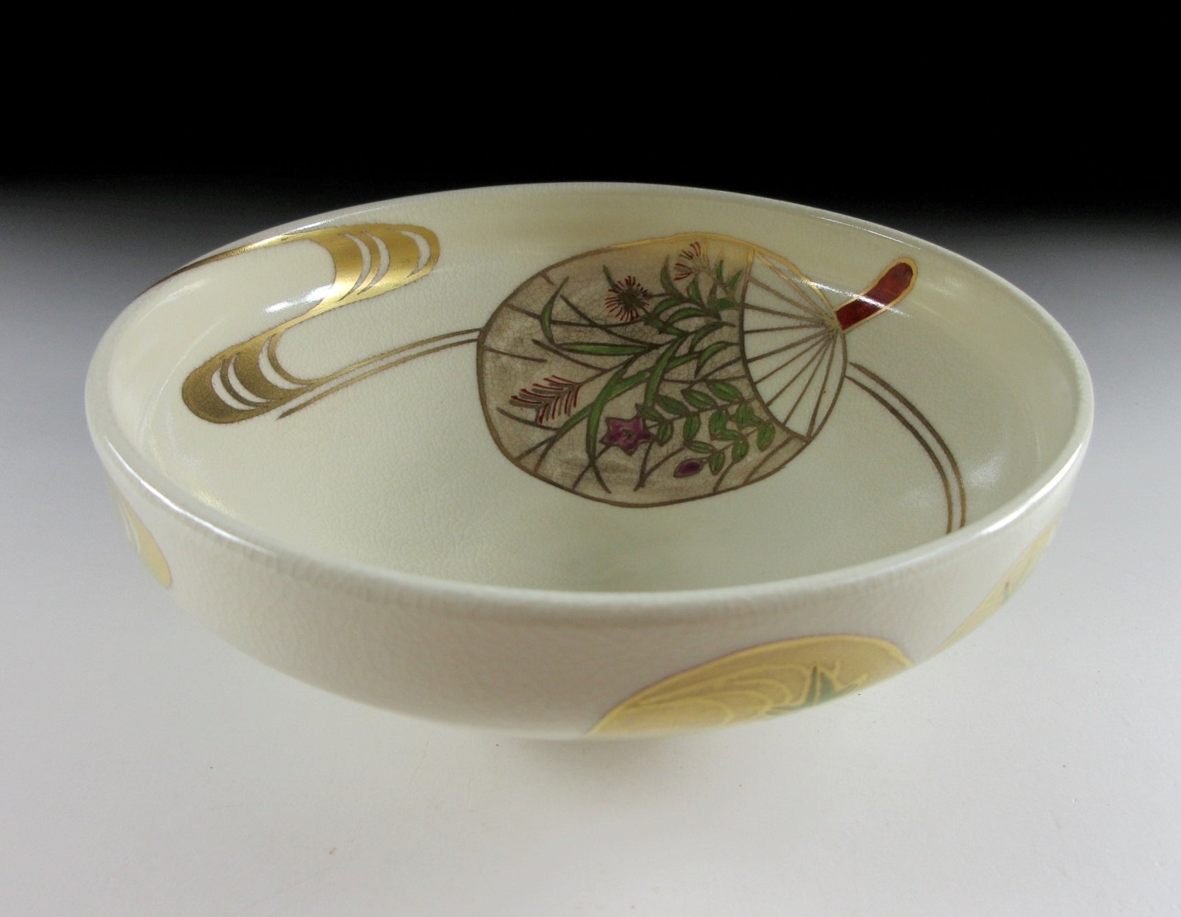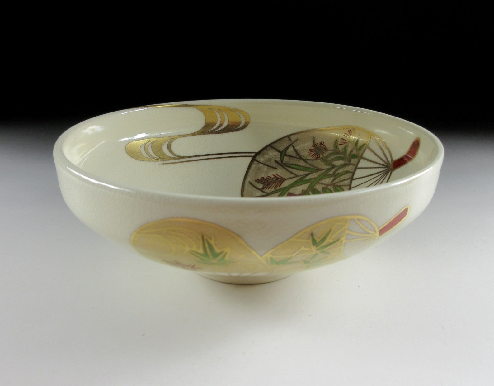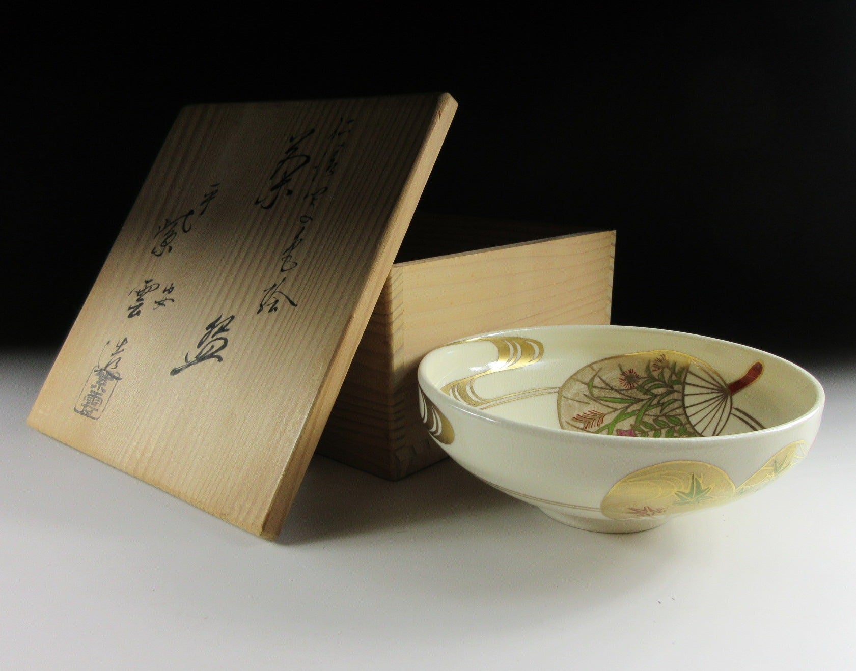 This listing is for a delightful Kyo-ware chawan made around 20 years ago by highly regarded potter, Hashimoto Shiun. It is wheel-thrown and the flat hira type used during the summer season. Hira chawan are shallow bowls with low sides designed to cool tea down faster. Also Kyo-ware potters tend to put more focus on decorating the interior, as this part is readily seen by the tea drinker. The bowl in this listing is decorated with hand-painted uchiwa fans, a very apt design for summer. The stamp of the potter can be found on the bottom, and it comes with its original signed wooden storage box.