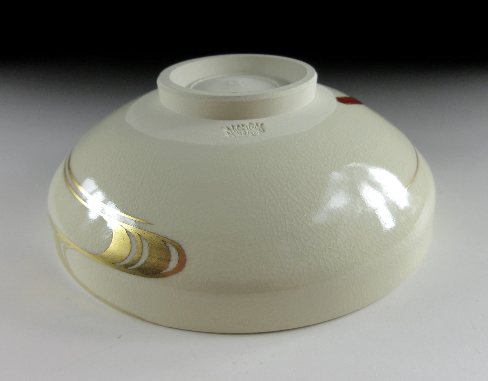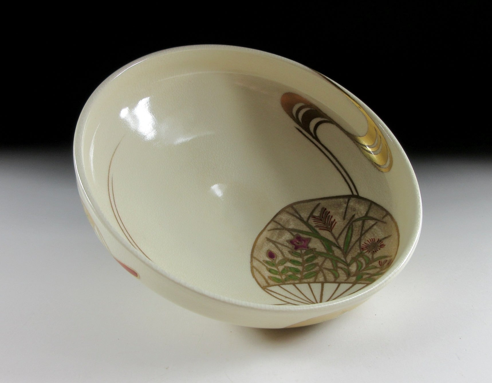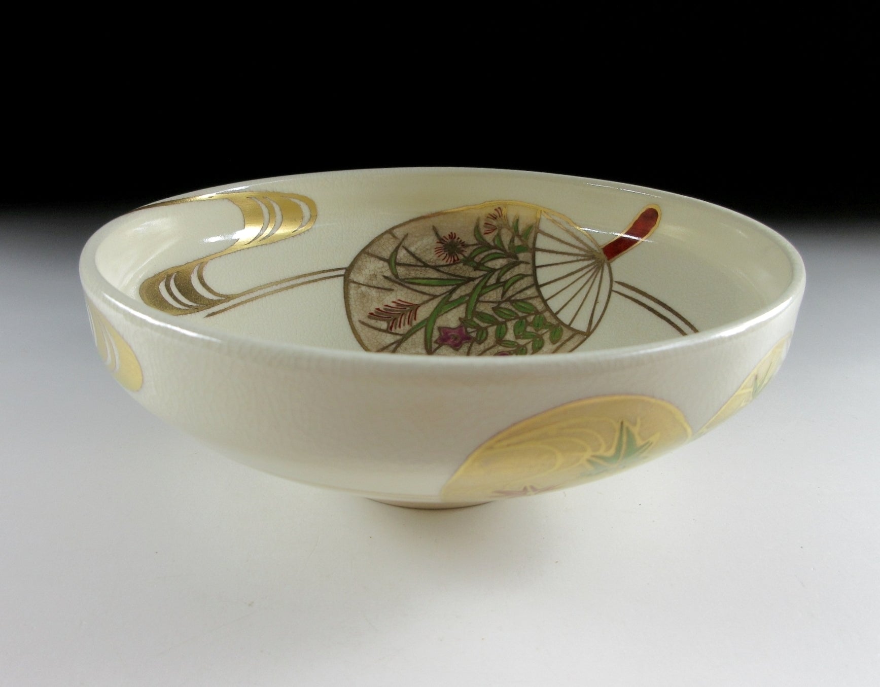 This listing is for a delightful Kyo-ware chawan made around 20 years ago by highly regarded potter, Hashimoto Shiun. It is wheel-thrown and the flat hira type used during the summer season. Hira chawan are shallow bowls with low sides designed to cool tea down faster. Also Kyo-ware potters tend to put more focus on decorating the interior, as this part is readily seen by the tea drinker. The bowl in this listing is decorated with hand-painted uchiwa fans, a very apt design for summer. The stamp of the potter can be found on the bottom, and it comes with its original signed wooden storage box.