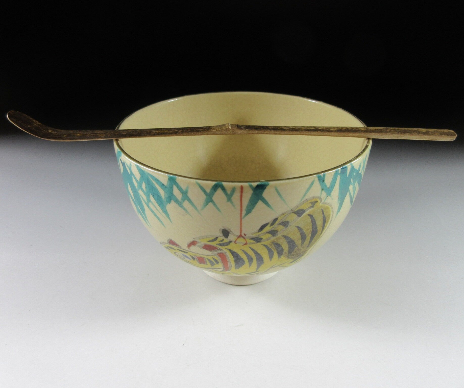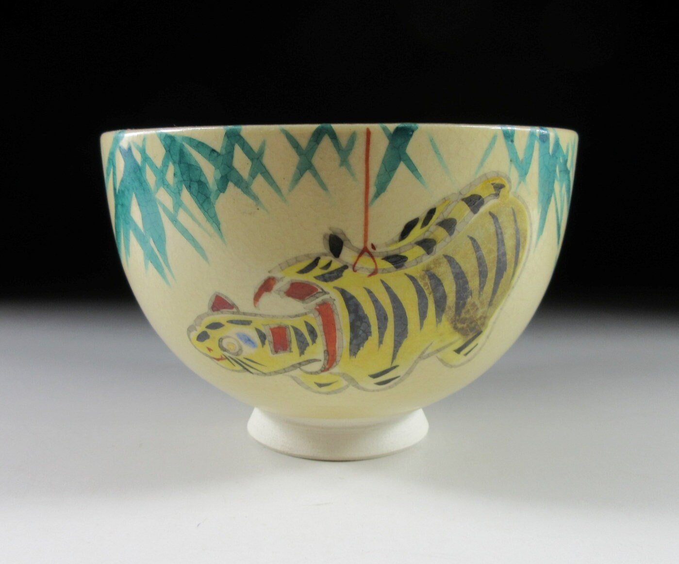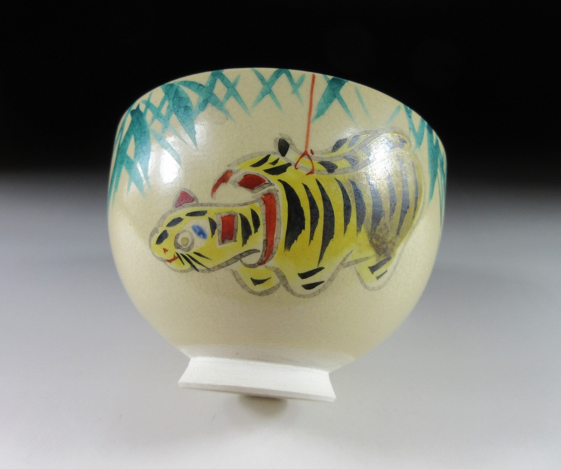 This listing is for a Kyo-ware chawan made around 30-40 years ago by Heian Seiho. It is wheel-thrown and decorated with a hand-painted depiction of a hariko tiger. A hariko tiger is a papier-mâché creation with a gently bobbing head. This piece was most likely made to commemorate the Year of the Tiger. The signature of the potter can be found on the bottom, sorry no box. *PLEASE NOTE THAT THE CHASHAKU TEA SCOOP IS NOT INCLUDED IN THIS LISTING.