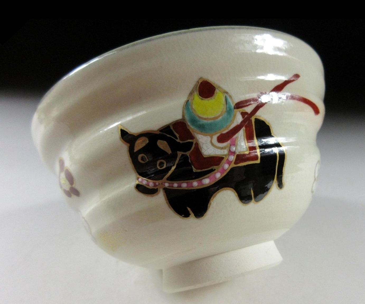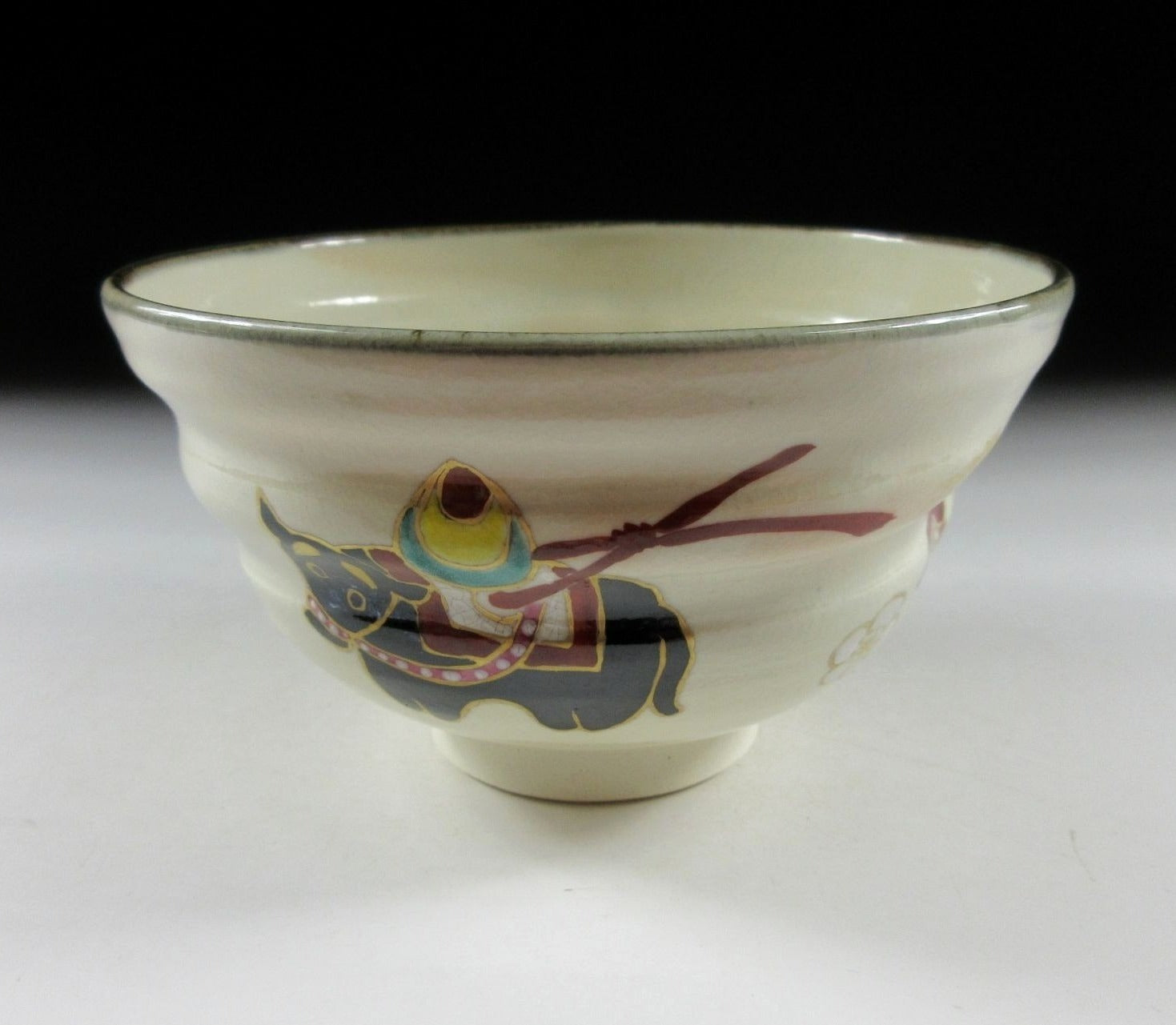This listing is for a Kyo-ware chawan made around 20 years ago by Heian Shoju. It is wheel-thrown and the front is decorated with a black ox bell with a hoju wishing jewel on its back. It also features ume blossoms, ume being one of the three friends of winter. The stamp of the potter can be found on the bottom and it comes with its original paper storage box. *PLEASE NOTE THAT THE CHASHAKU TEA SCOOP IS NOT INCLUDED.