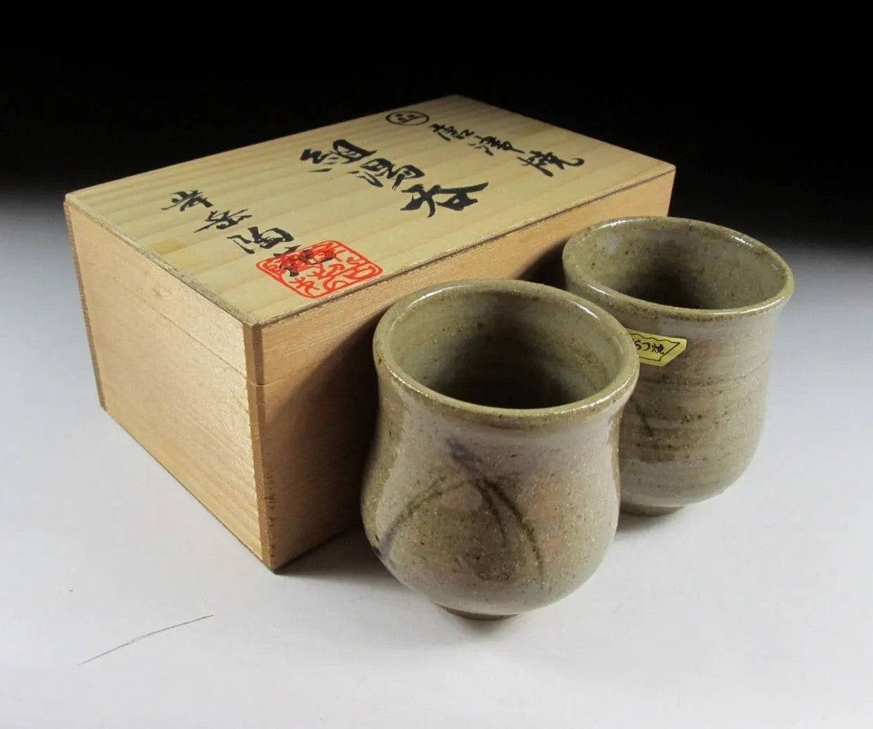 This listing is for a pair of Karatsu-ware yunomi made around 20 years ago by Hiari Gama. They are wheel-thrown and decorated with an iron oxide pine needle pattern. They have a slightly hourglass shape with a flared rim, and are very suitable for daily use. The stamp of the kiln can be found on the bottom of each cup, and they come with their original signed wooden storage box.